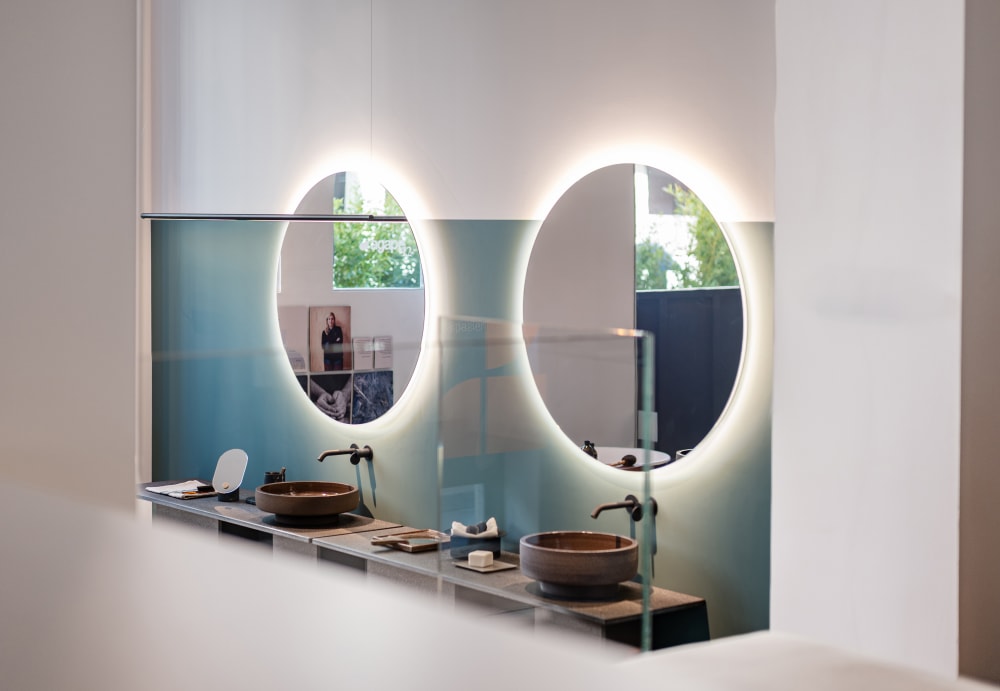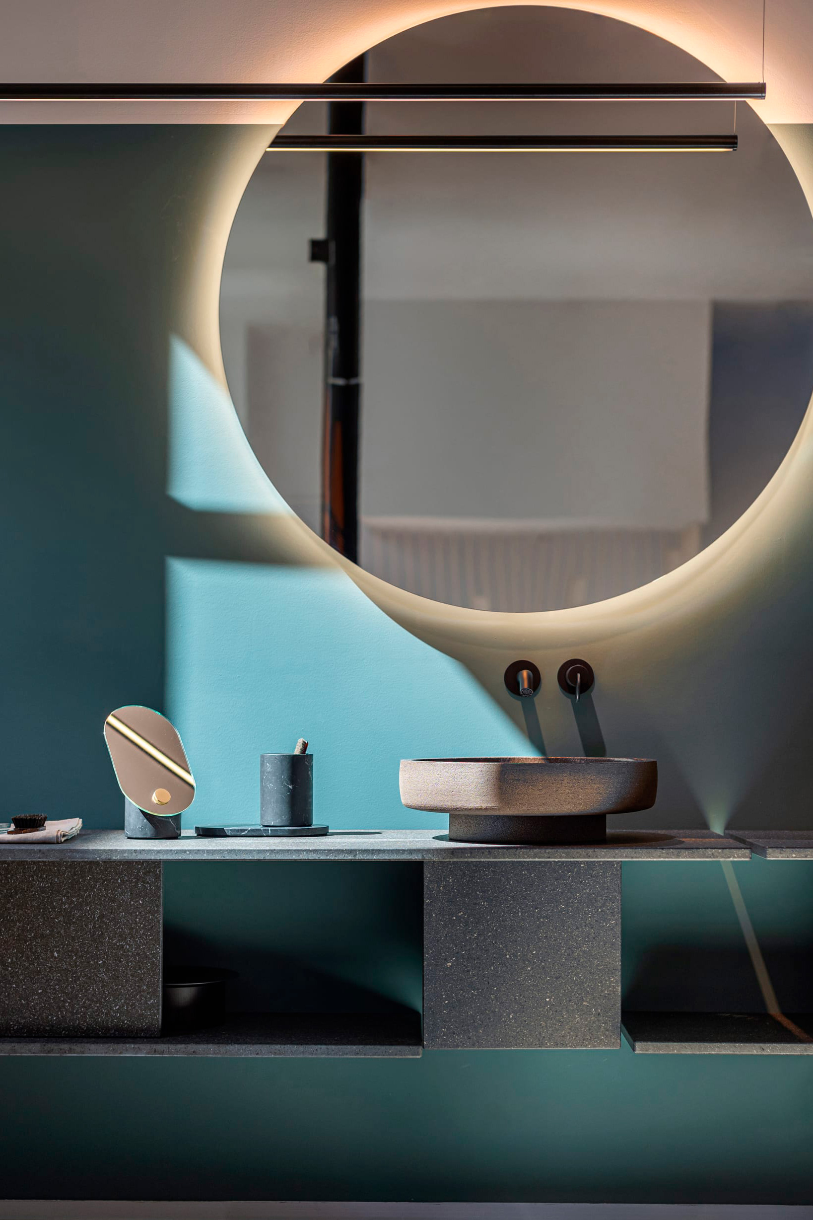 Patricia Urquiola enhances the sensory appeal of stones and woods through the very open compositions and the Cartesian rigor of the Bloque system. The rhythm is marked by juxtaposed and perpendicular surfaces, in an original staggered movement between planes. The reduced depth of the lower shelf adds further articulation to the whole and enhances its ergonomics. Modularity ranges from 80 to 220 cm in length at 20 cm intervals, but the compositions provided by the system can be further combined with each other, simply by placing them side by side, to achieve larger widths. Bloque can accommodate all Agape countertop washbasins and, due to its ductility and essentiality, also leave the bathroom, fitting freely in other spaces of the house and contract settings. An iconic and universal gesture at the same time.
