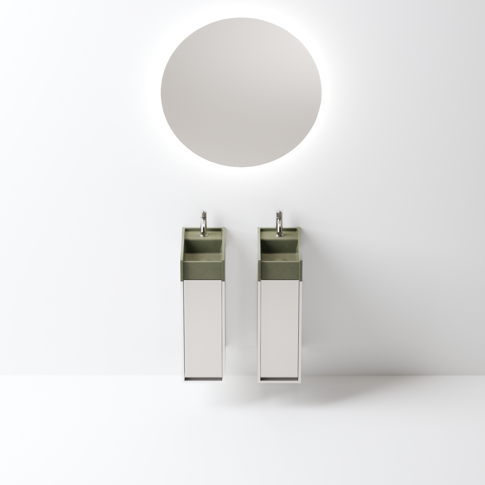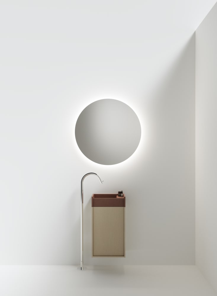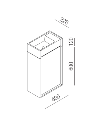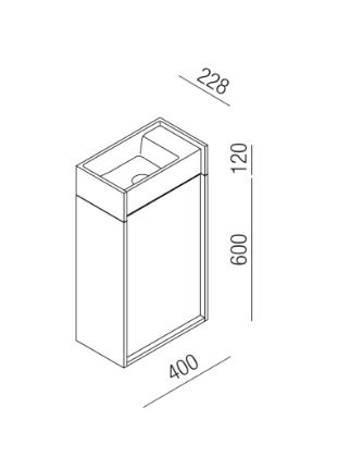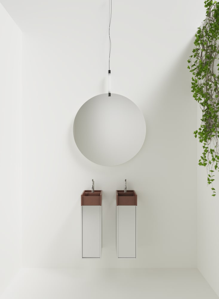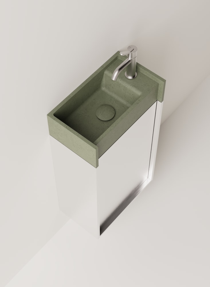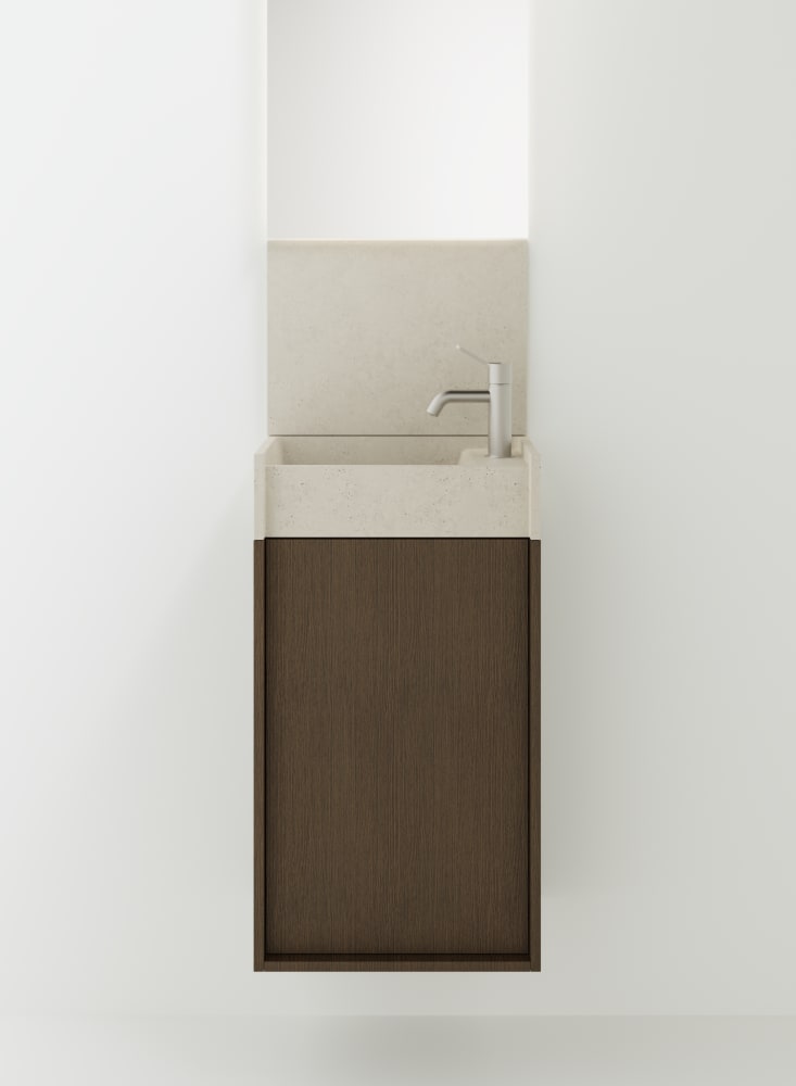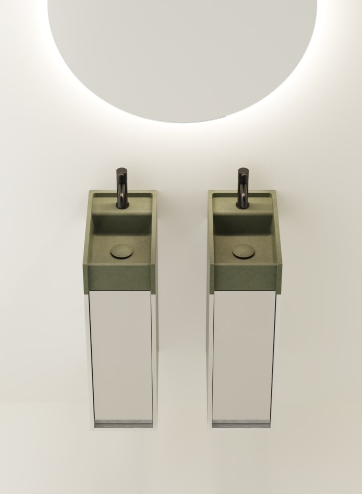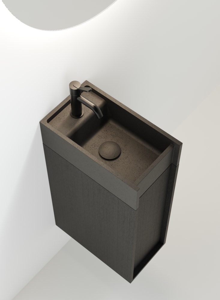 Minimal dimensions and extreme flexibility for a modular object in two variants, both playing on the same sizes: 20 x 40 cm. In the perpendicular version, fixed to the wall along the shorter side, the washbasin is complemented by a container with a drawer with two shelves. The version parallel to the wall, fixed on the longer side, is integrated with a container with hinged door and two shelves or a flap door towel basket. The washbasin is made of concrete in various finishes while the container is available in two different materials: wood in multilaminar veneer in oak or teak finishes or brushed stainless steel, also suitable for outdoor use. The series also includes a version with a garden hose holder inside the container.