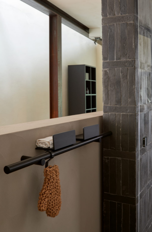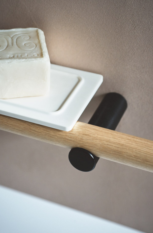 Accessories made of tubular aluminium consisting of brackets (dot) supporting a bar (line) with brushed black anodized finish or with natural, brown, dark oak veneer and a marble based for the floor standing elements. In addition to each single item it is possible to obtain a continuous bar that performs the various functions. Both the individual items and the continuous bar can be fitted with shelves, hooks or glasses in aluminium freely positionable along its entire length. The successful Dot Line series is enriched with a new addition for independent use that can also be placed outside the bathroom. An interplay of essential lines for a versatile object, equipped with lighting thanks to the LED strip in the underlying surface of the superior bar.