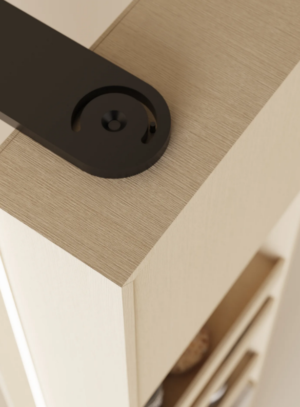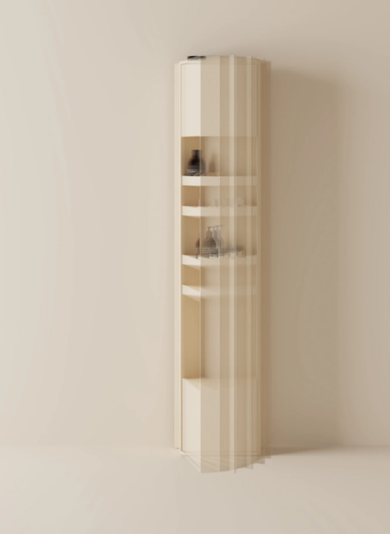 How to keep an empty space around the tub and sink, making good use of their sculptural presence while also keeping everything you need to use them close at hand? Voila? is a new retractable container with a mirror that pivots at two points along the vertical axis. When needed, the mirrored surface rotates and reveals the interior equipped with shelves, towel racks and power outlets. Voila? itself becomes an architectural element in the room, creating movement and perspective with a rhythmic series of columns for a functional, furnished wall.
