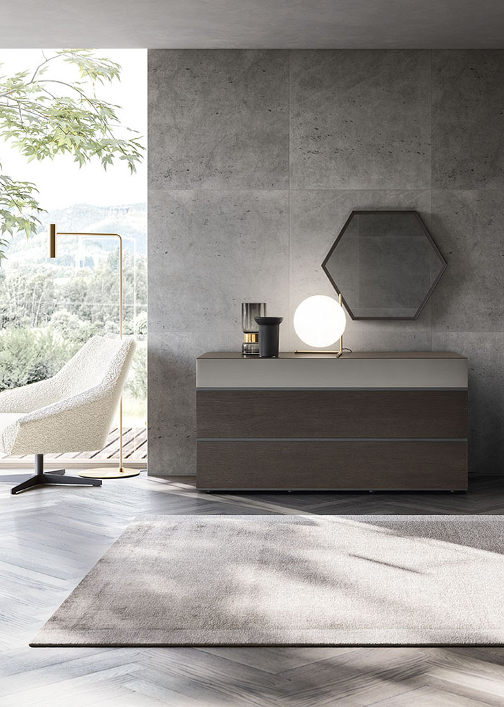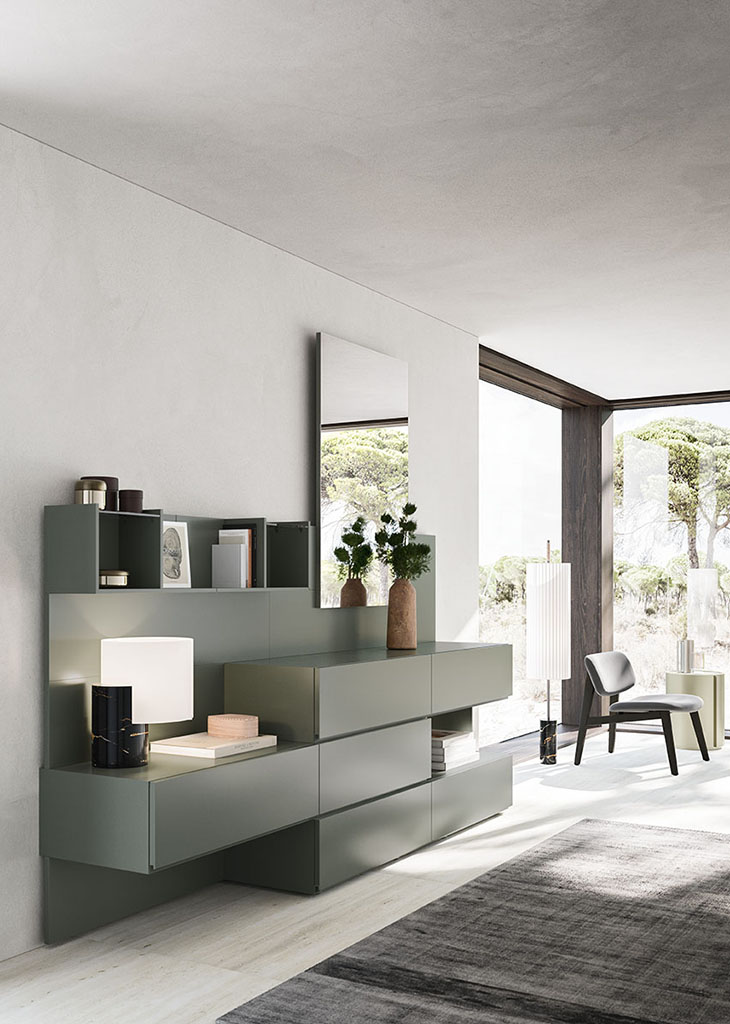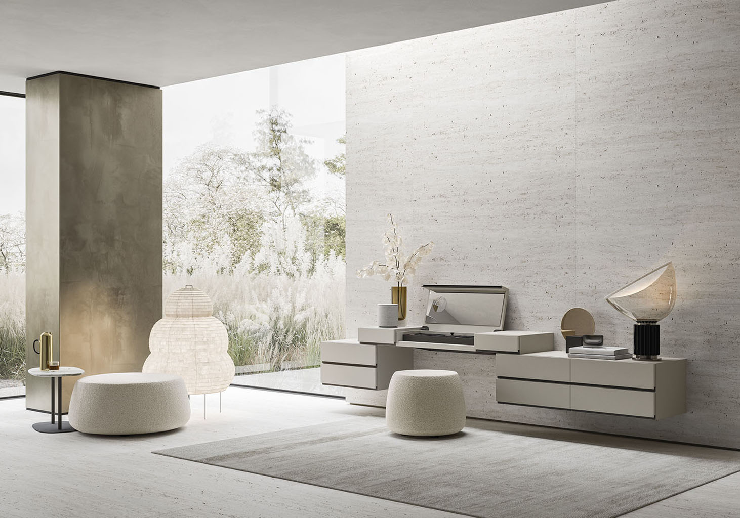 By side is a modular bedroom range which stands out for being extremely modular. The elements can be floor-standing or wall-mounted, used individually or stacked to create infinite compositional possibilities.