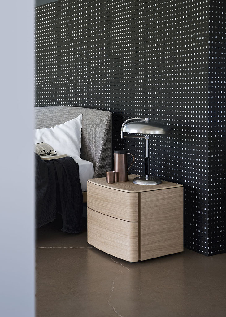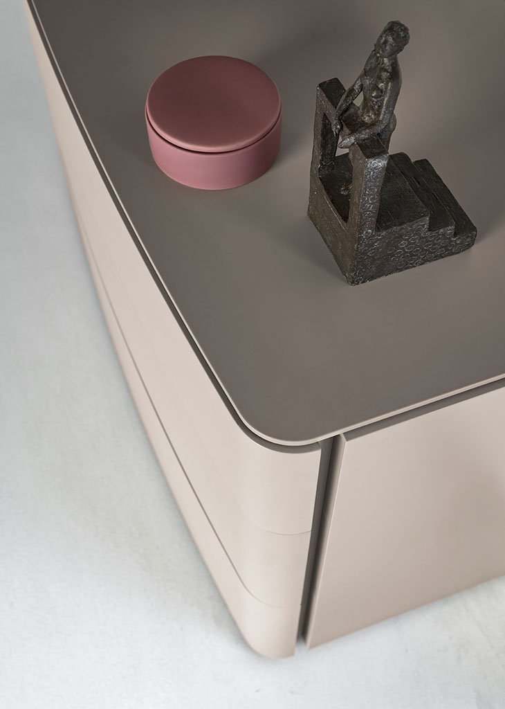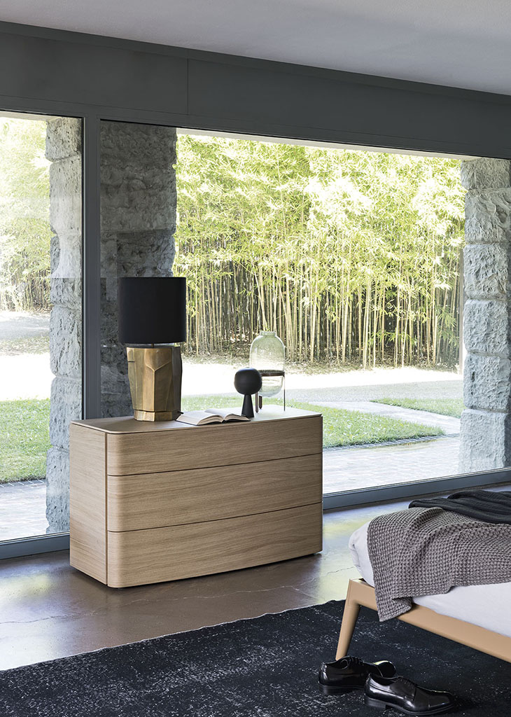 Olis is a bedroom suite made up of a dresser and bedside table featuring curved lines. It comes in all the lacquered and Fashion Wood finishes.