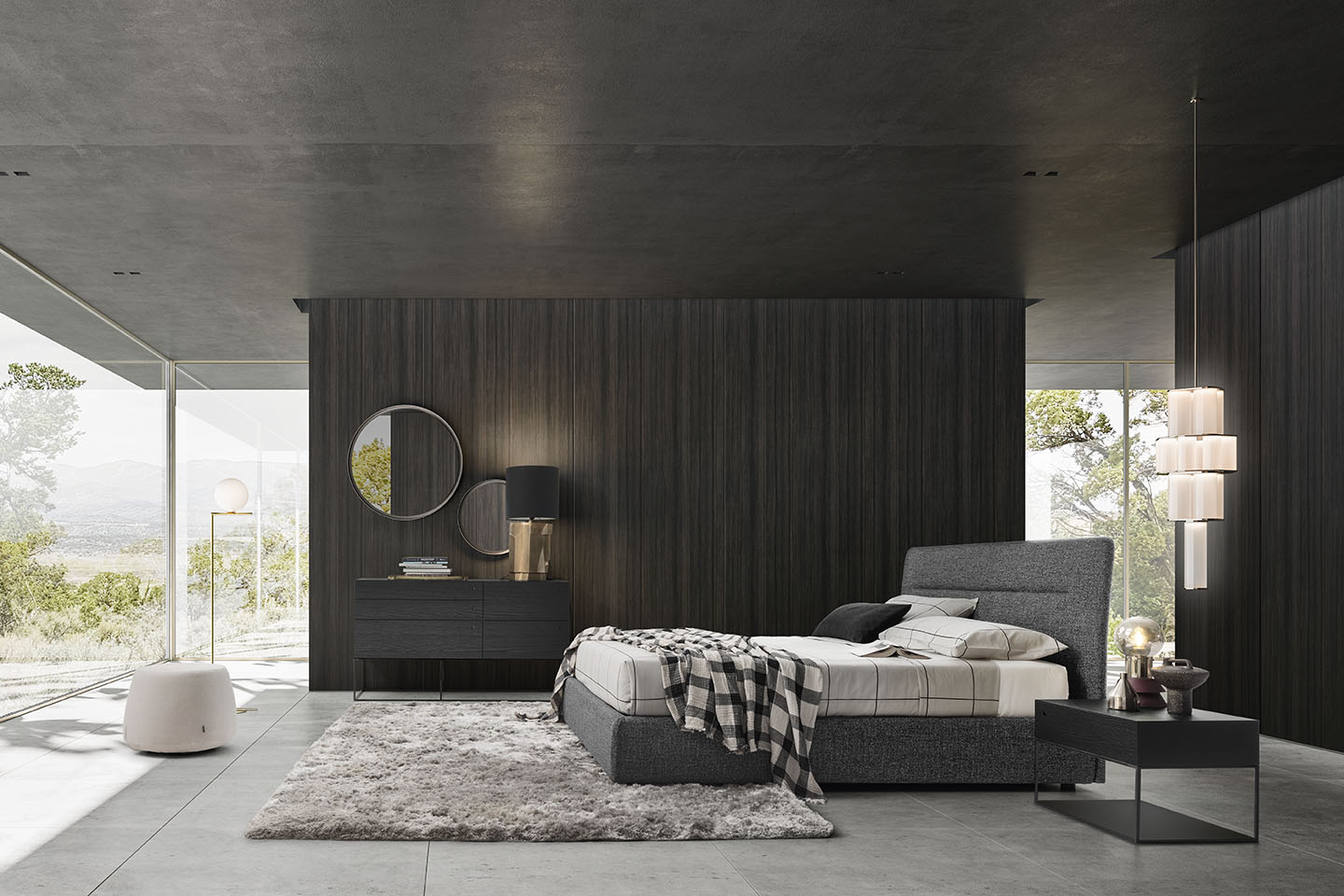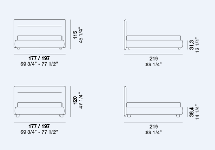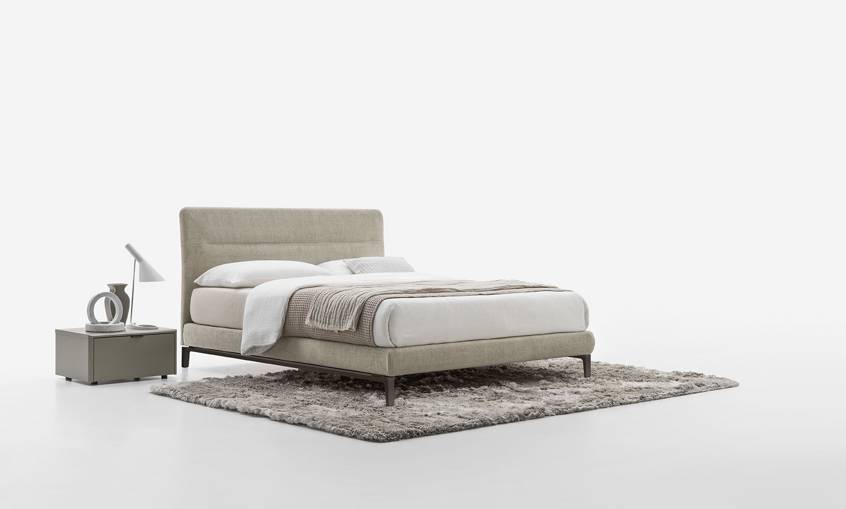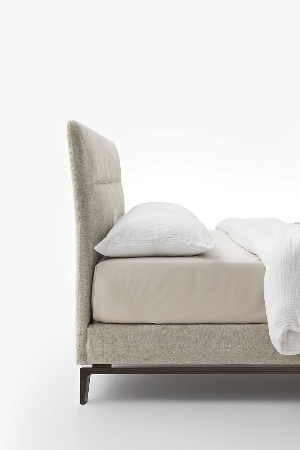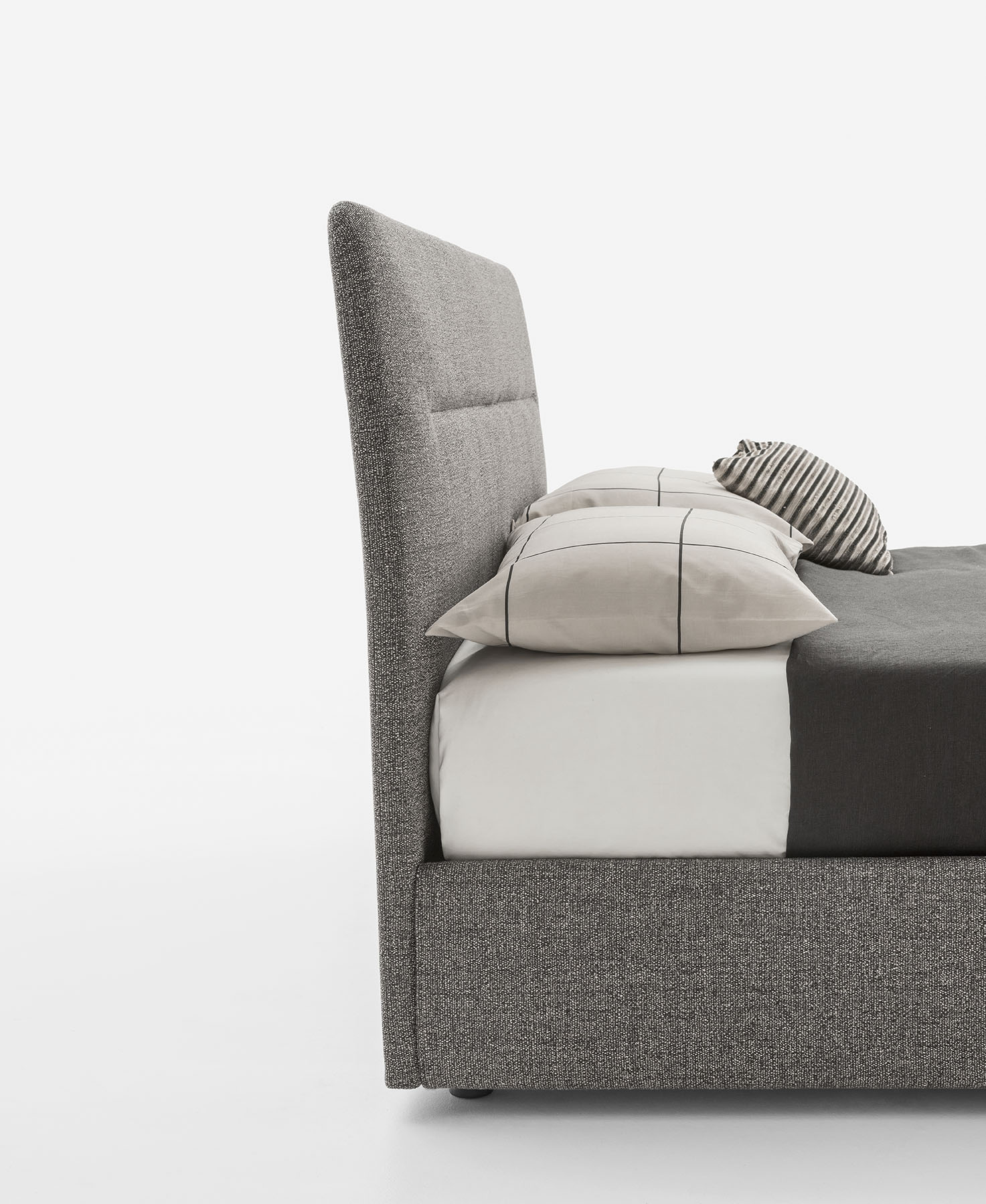 Orion is a modern upholstered bed with headboard and divan platform or feet. Distinctive horizontal stitching on the headboard defines its style.