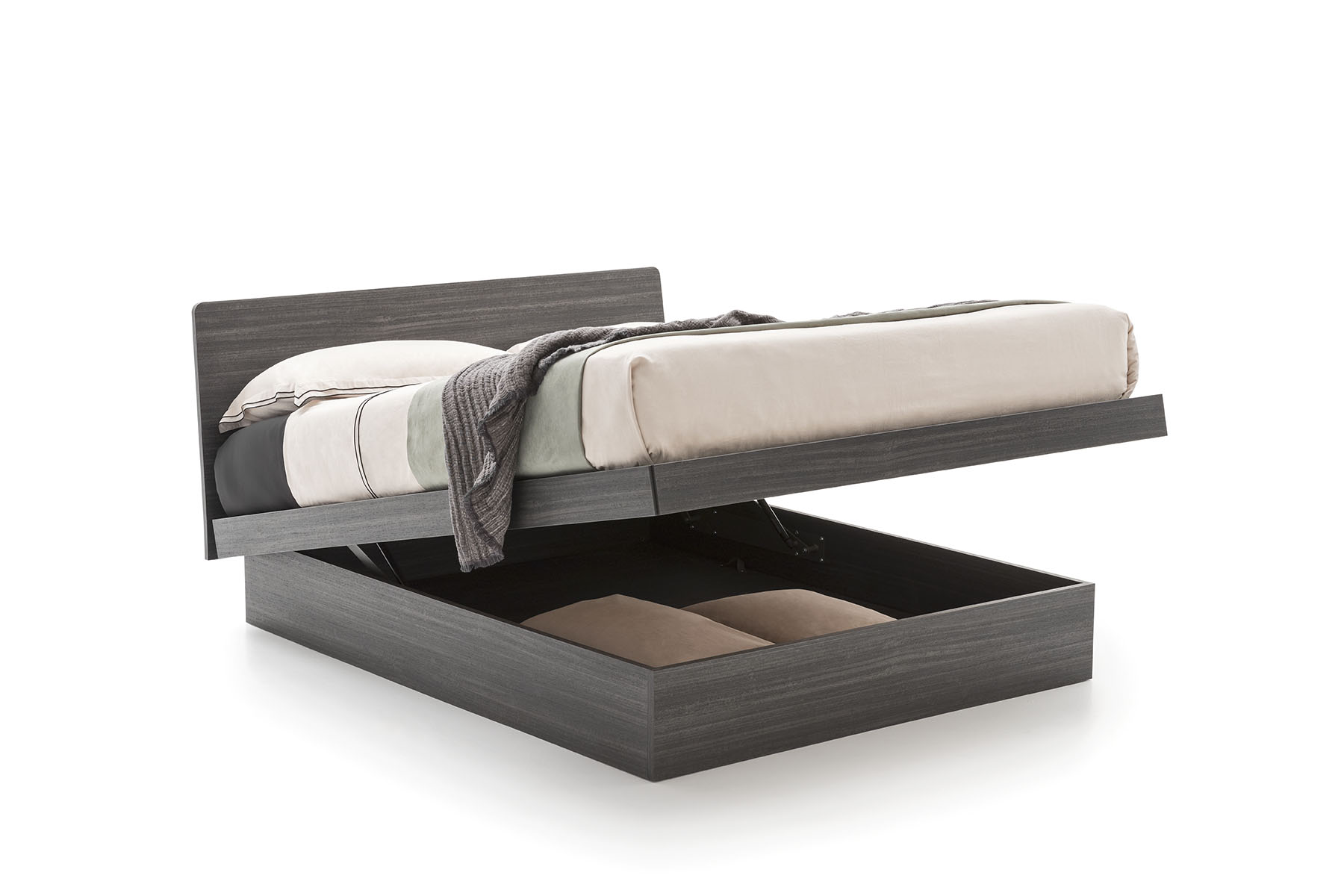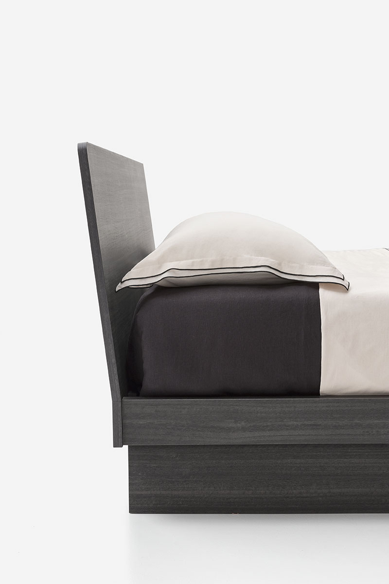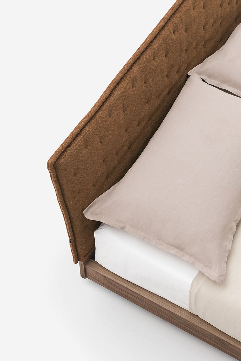 The Teo wooden double bed has sleek modern shapes and is available with two platform versions. The headboard panel can be covered with a padded, quilted hood which is available in all the covers in the sample range. A version with storage is also available.
