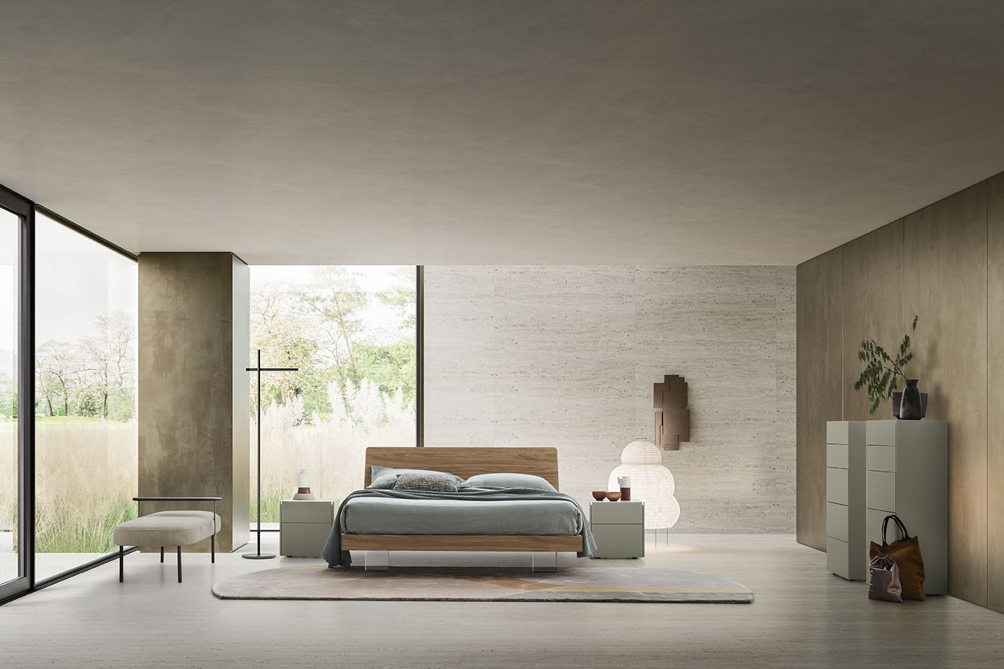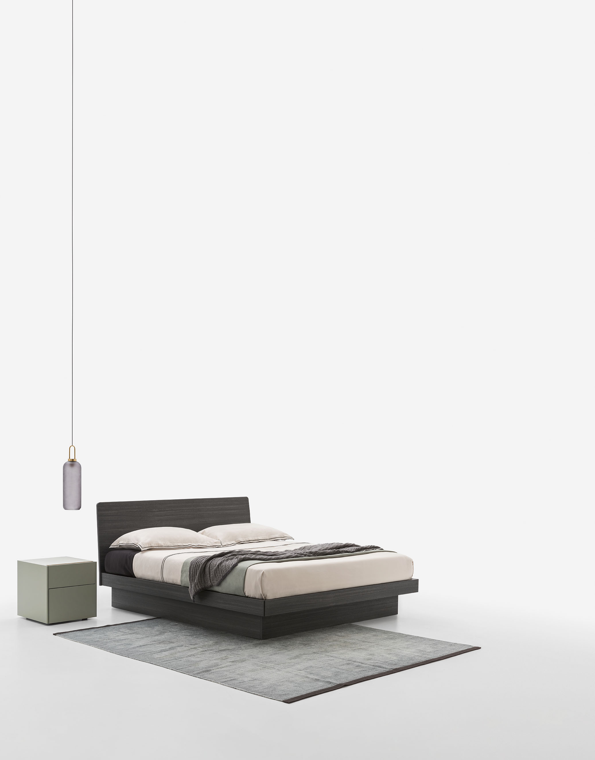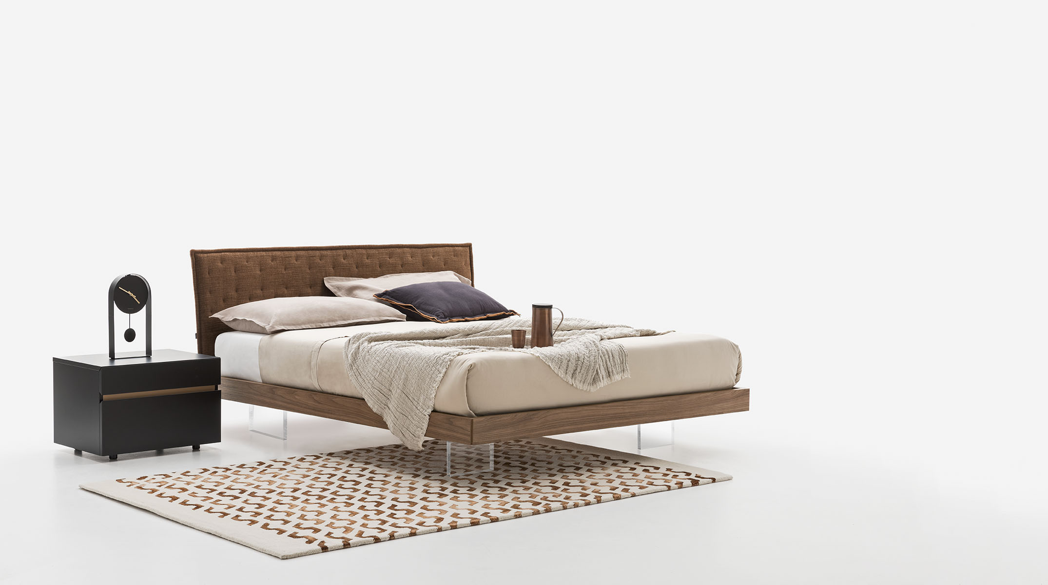 The Teo wooden double bed has sleek modern shapes and is available with two platform versions. The headboard panel can be covered with a padded, quilted hood which is available in all the covers in the sample range. A version with storage is also available.