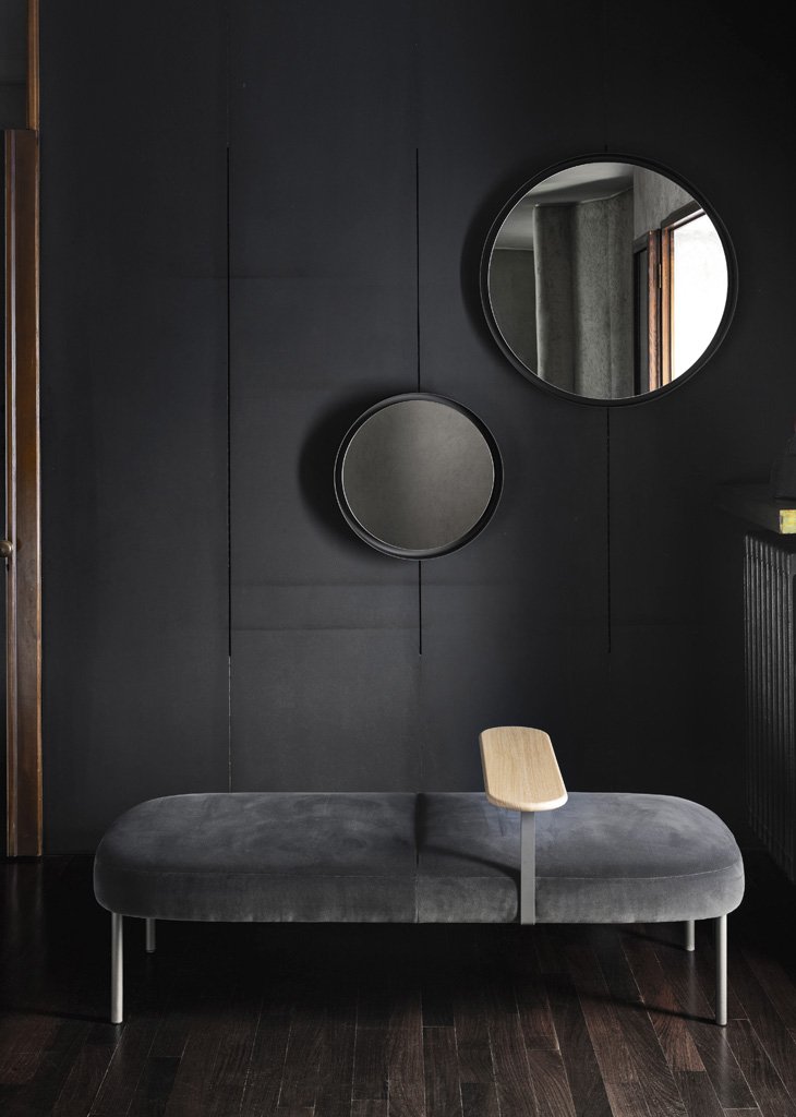 Disco mirrors, along with Esagona designer mirrors, look good in any room because of their frame in Moka Shine finish metal. The Disco model comes in three sizes.