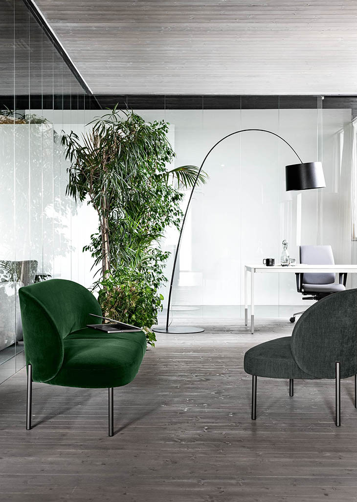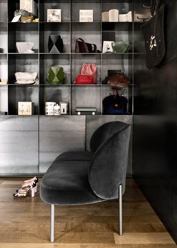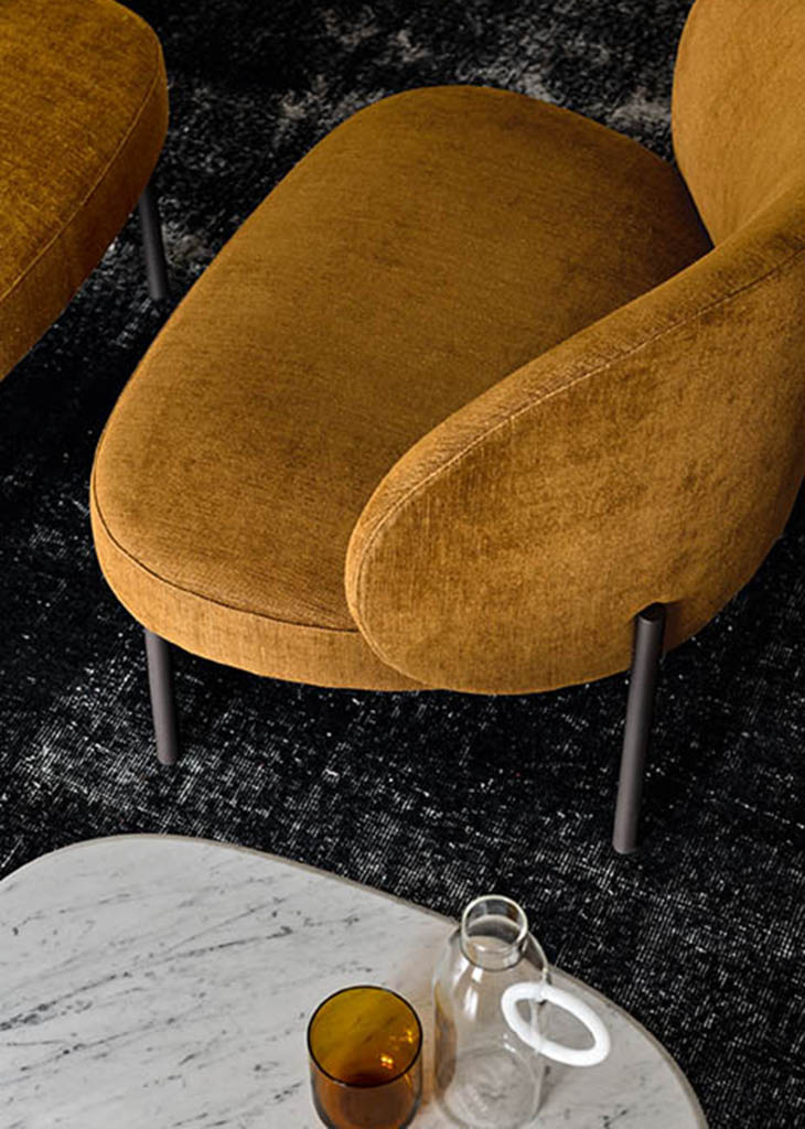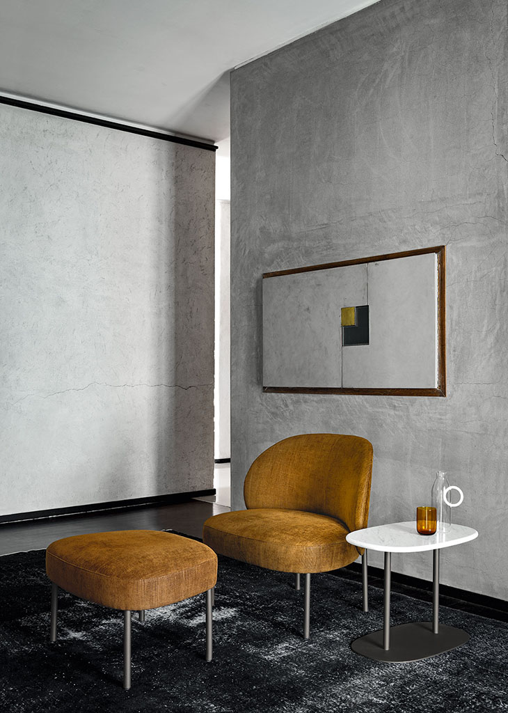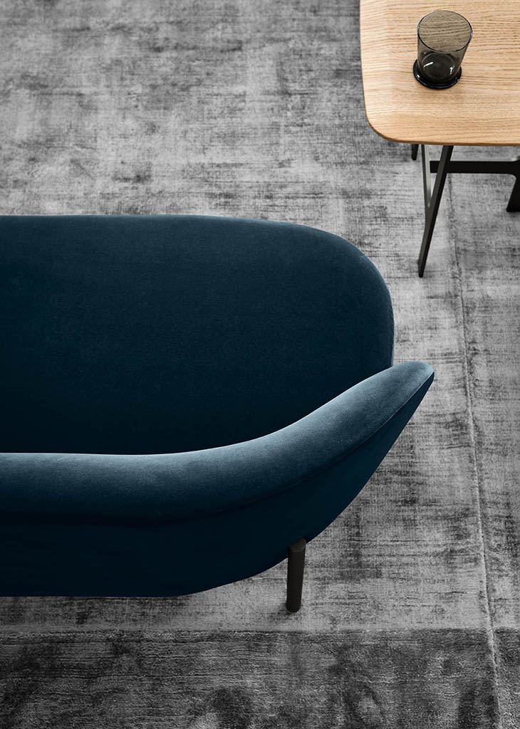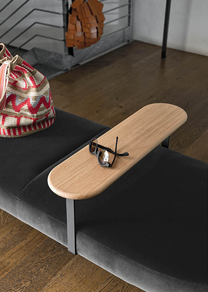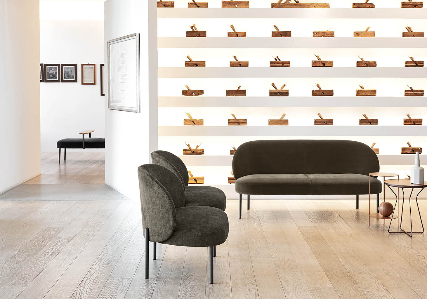 The Raku collection of padded seats – including armchair, footstool, small sofa, chair and bench – has a simple, contemporary look. Seat and back are defined by simple, rounded shapes. The equally simple foot is formed of a vertical bar that seems to just be resting against the outer edge of the chair back. The upholstered bench also has a wooden armrest that divides it widthways, creating a functional surface for resting things on. Available with leather and fabric upholstery, Raku is perfect for adding a touch of comfort to the living and bedroom areas.