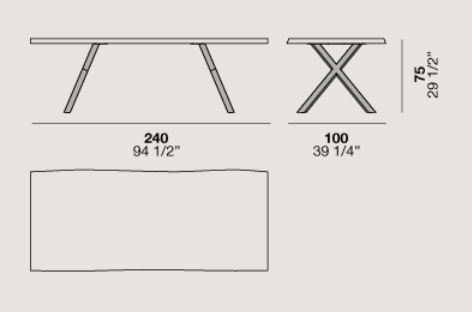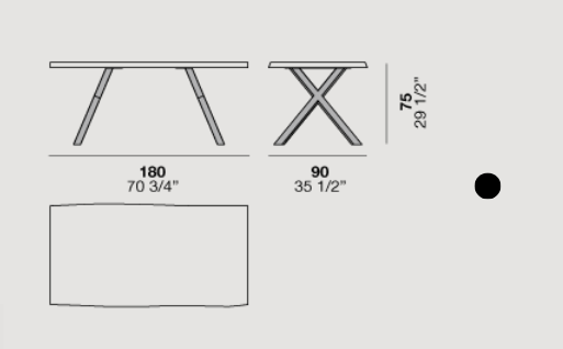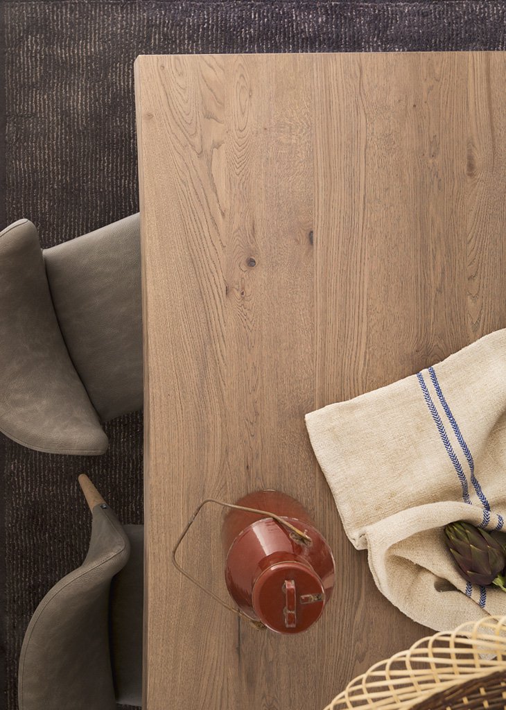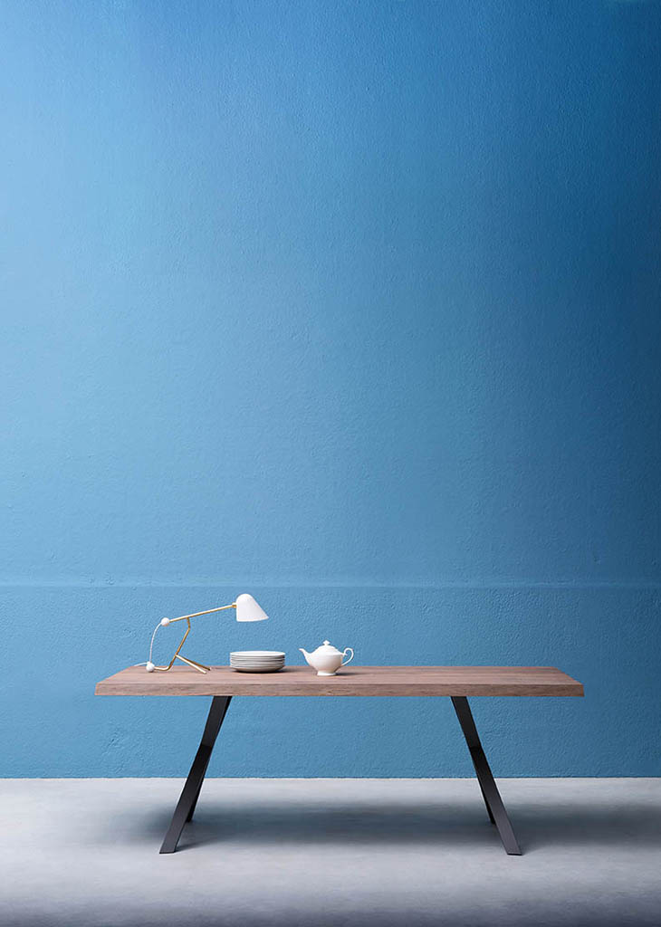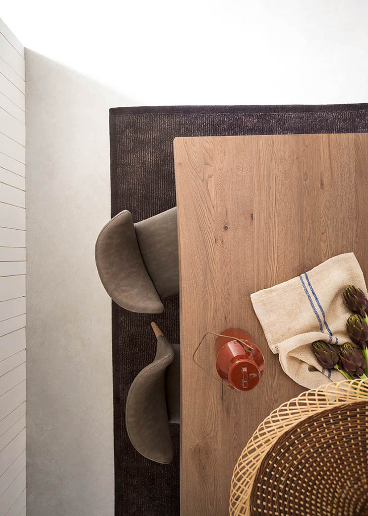 Board is a rectangular table with a metal frame and a wooden top, and it comes in a fixed or an extendable version. In the Board table, a painted metal base in a geometric shape finds the perfect partner in an aged-look knotted oak table top with irregular-shaped edges.