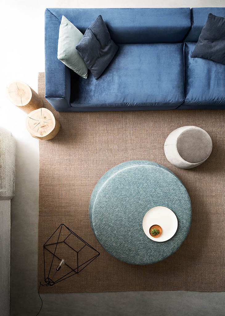 Denny is a padded footstool with a removable cover (in fabric and ecoleather versions), available in three sizes. It features rounded and tapered shapes, and can be used as either a seat or a practical surface to put things on.