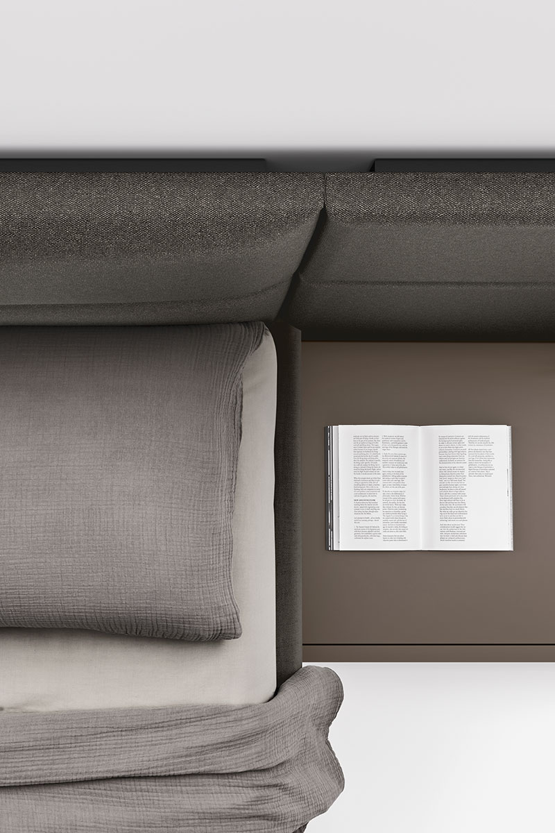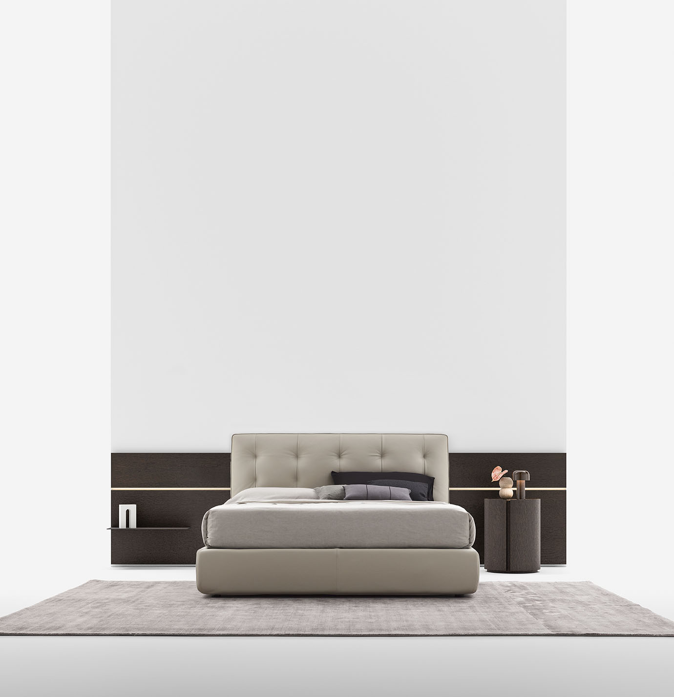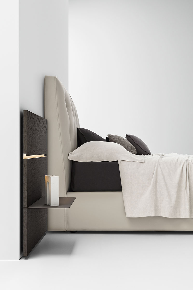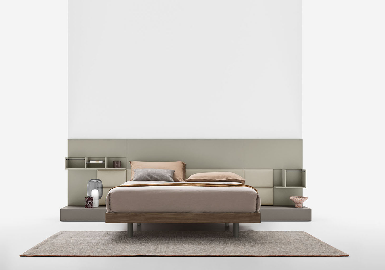 It is not just a bed, but a modular creation that provides a wide selection of configurations and combinations of finishes. There are five platforms available, which can be combined with the padded panels and wooden boiserie, fitted with practical metal shelves. There is a wide range of sizes available, including with storage possibilities.