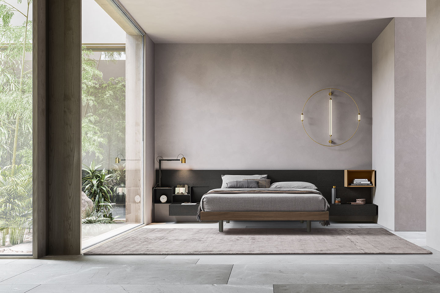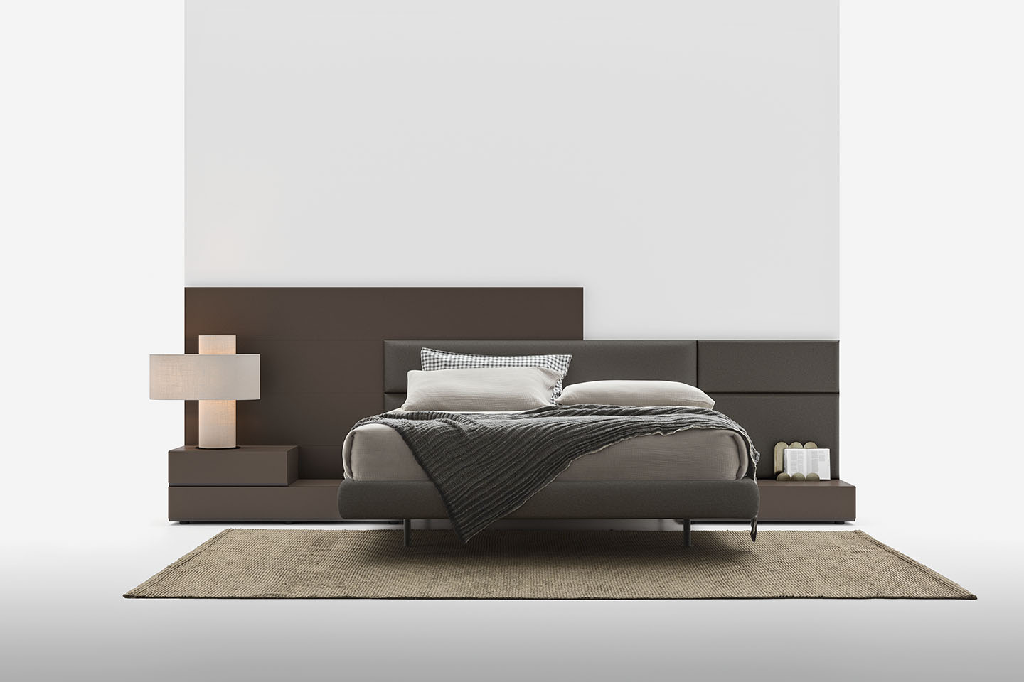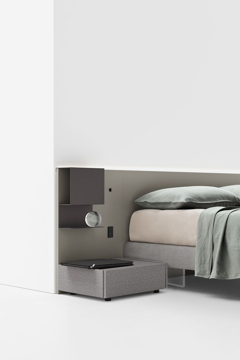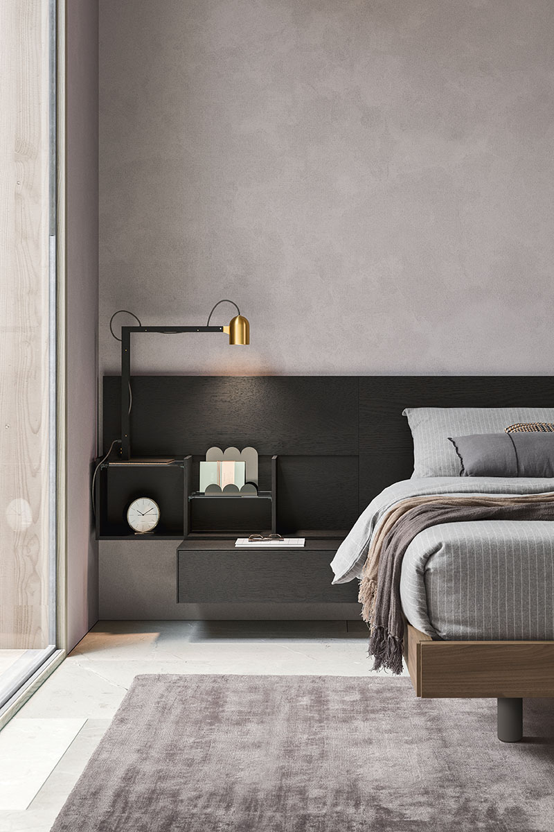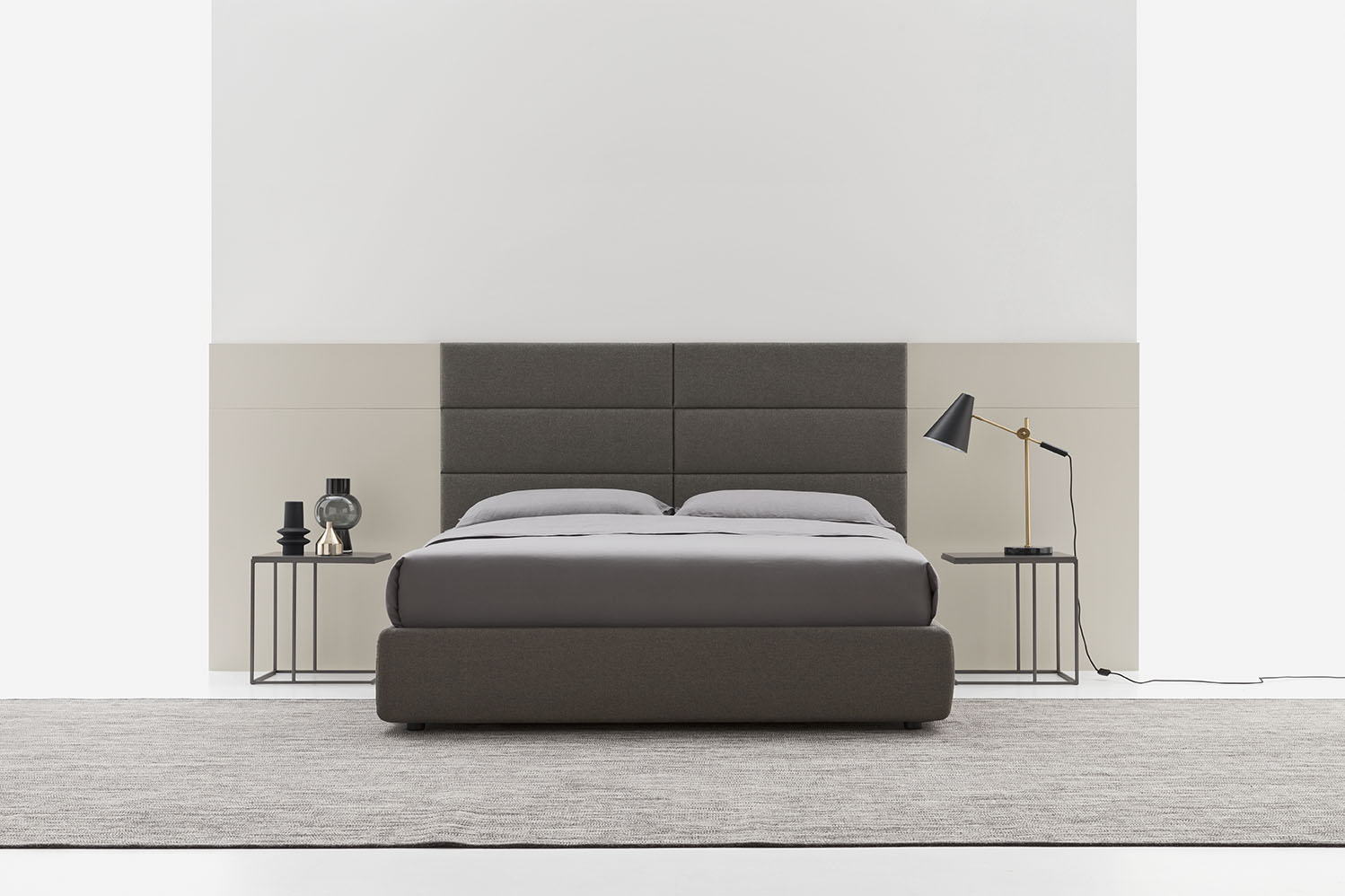 It is not just a bed, but a modular creation that provides a wide selection of configurations and combinations of finishes. There are five platforms available, which can be combined with the padded panels and wooden boiserie, fitted with practical metal shelves. There is a wide range of sizes available, including with storage possibilities.