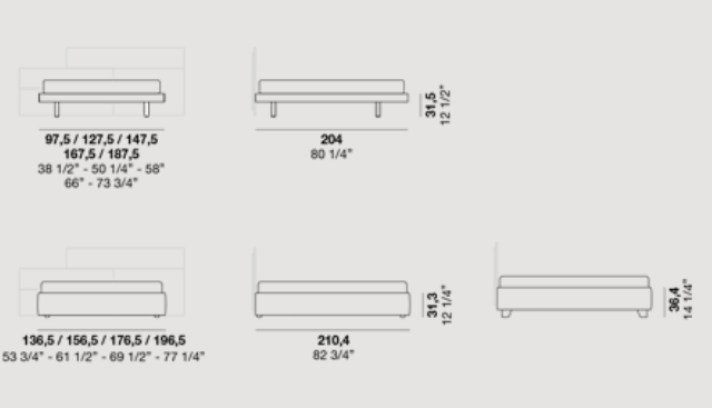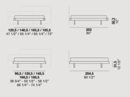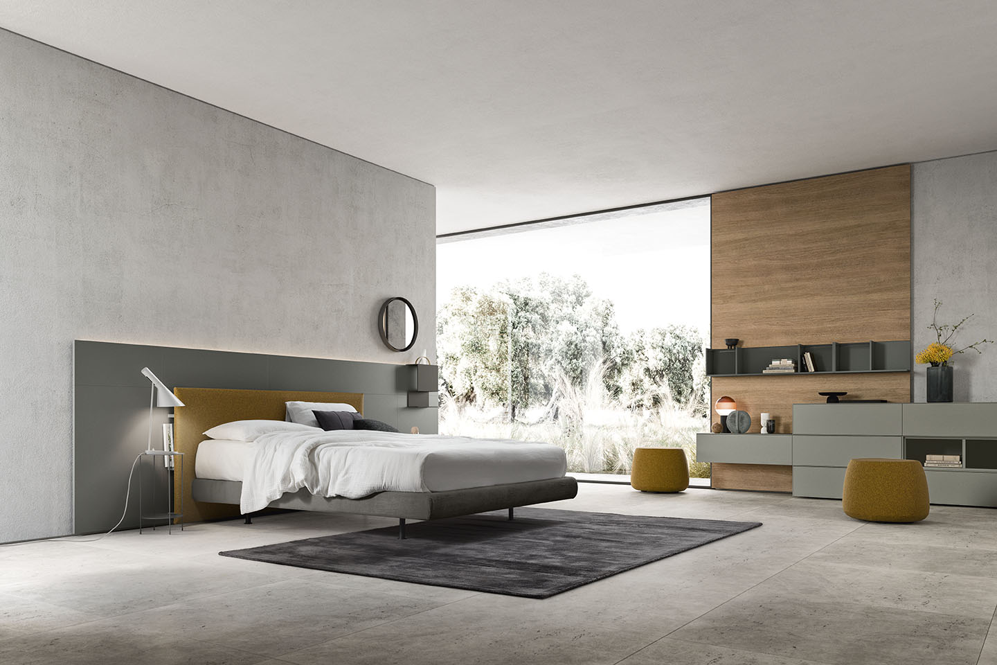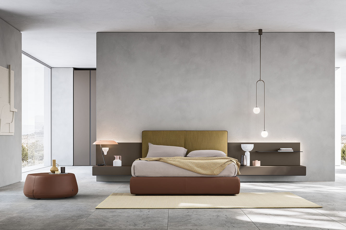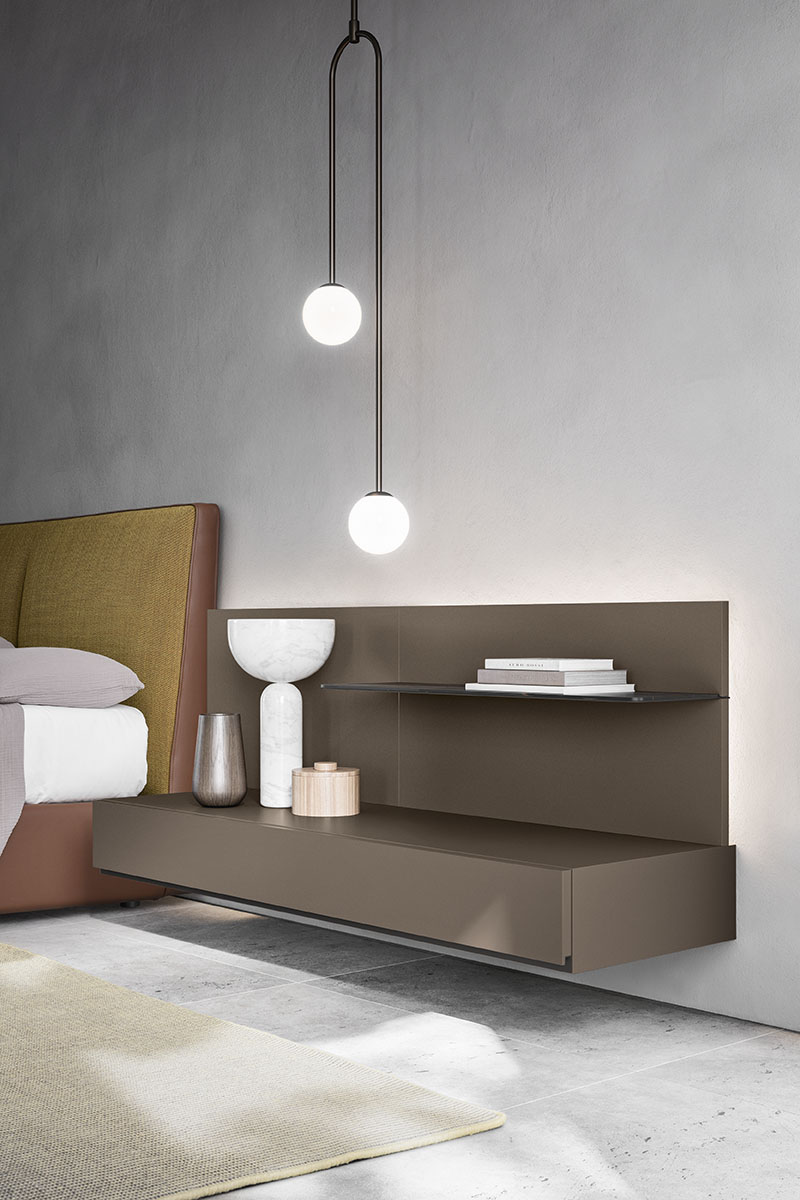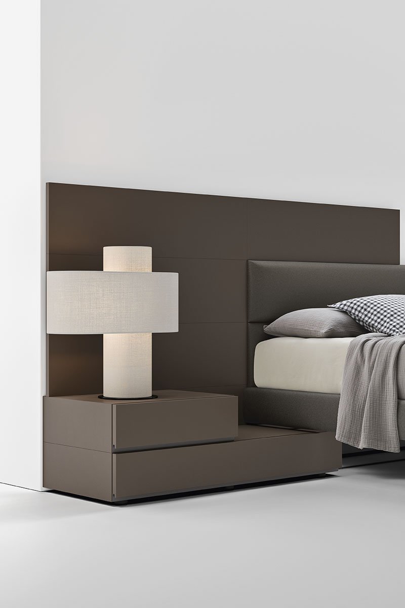 It is not just a bed, but a modular creation that provides a wide selection of configurations and combinations of finishes. There are five platforms available, which can be combined with the padded panels and wooden boiserie, fitted with practical metal shelves. There is a wide range of sizes available, including with storage possibilities.