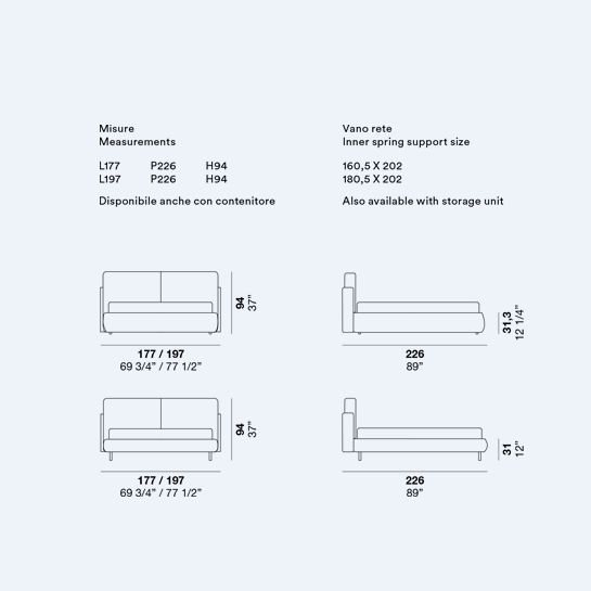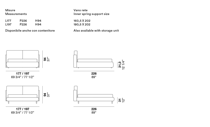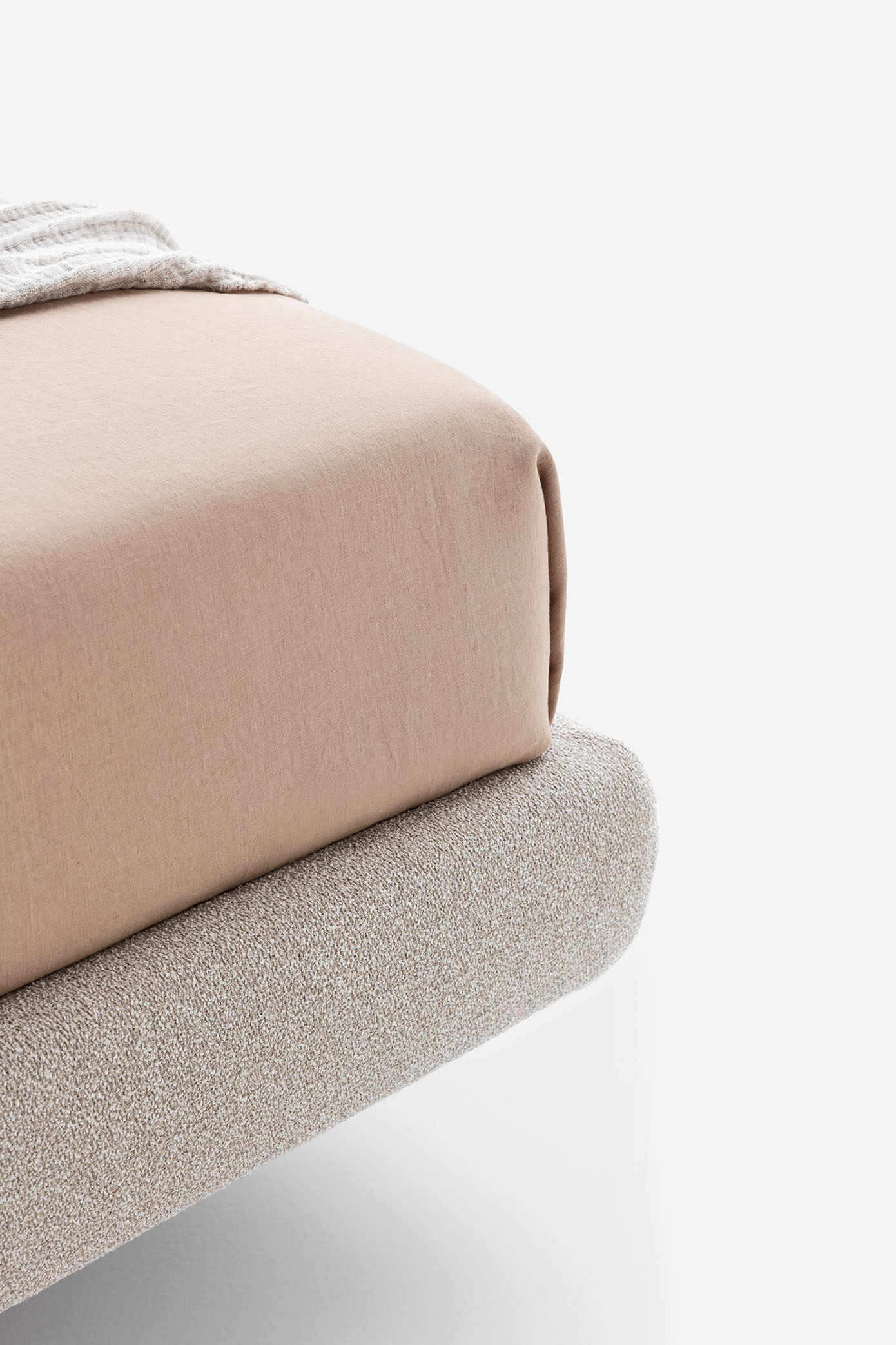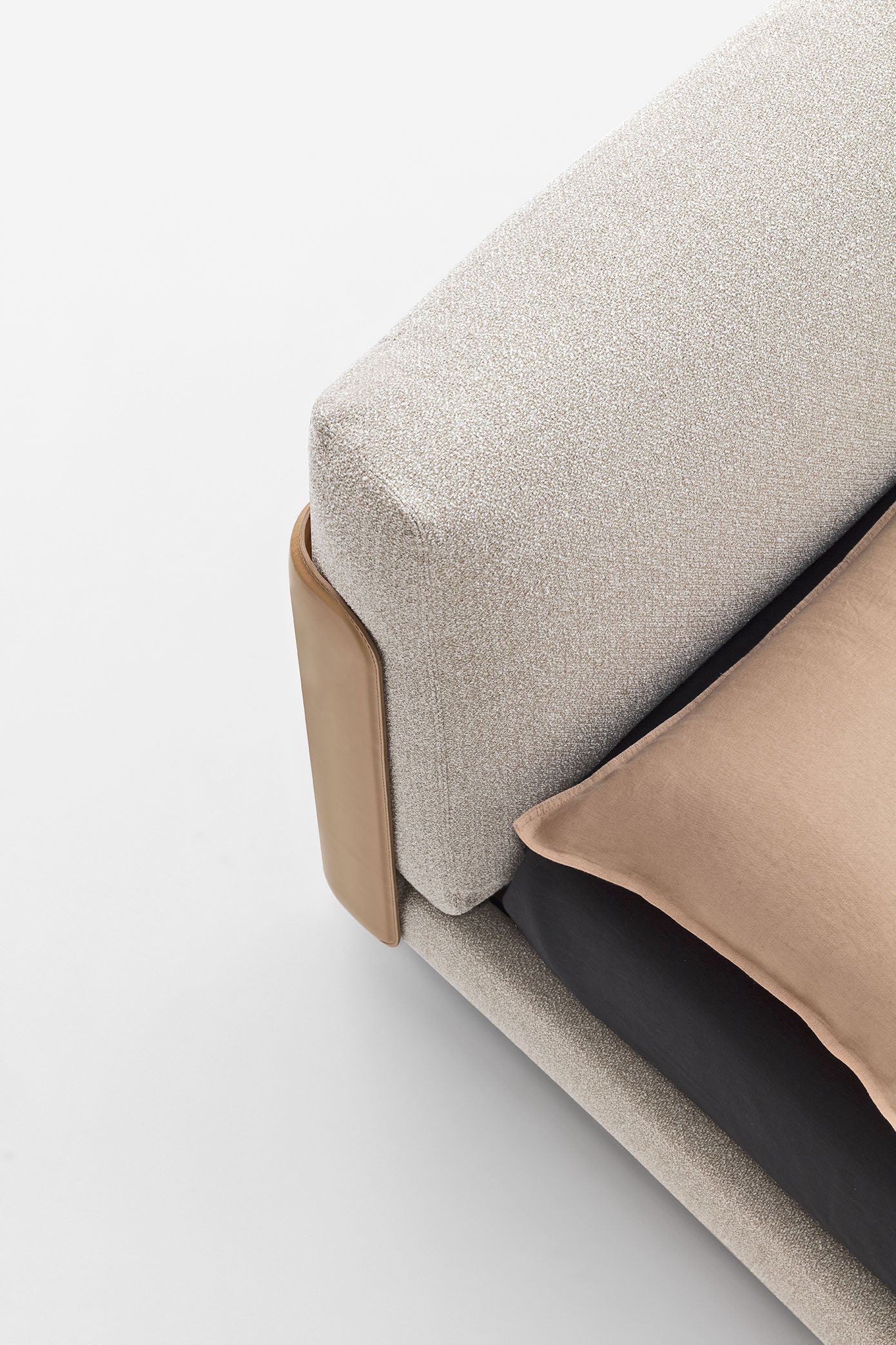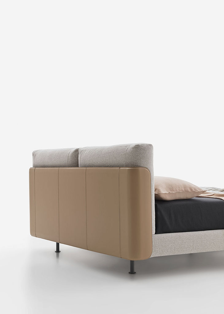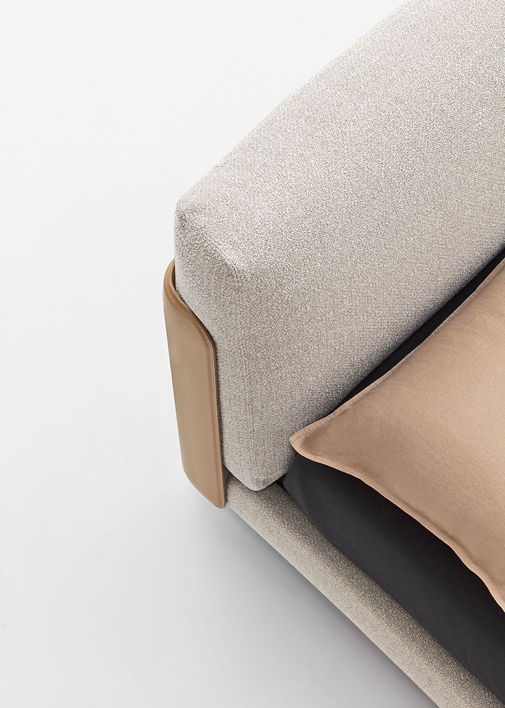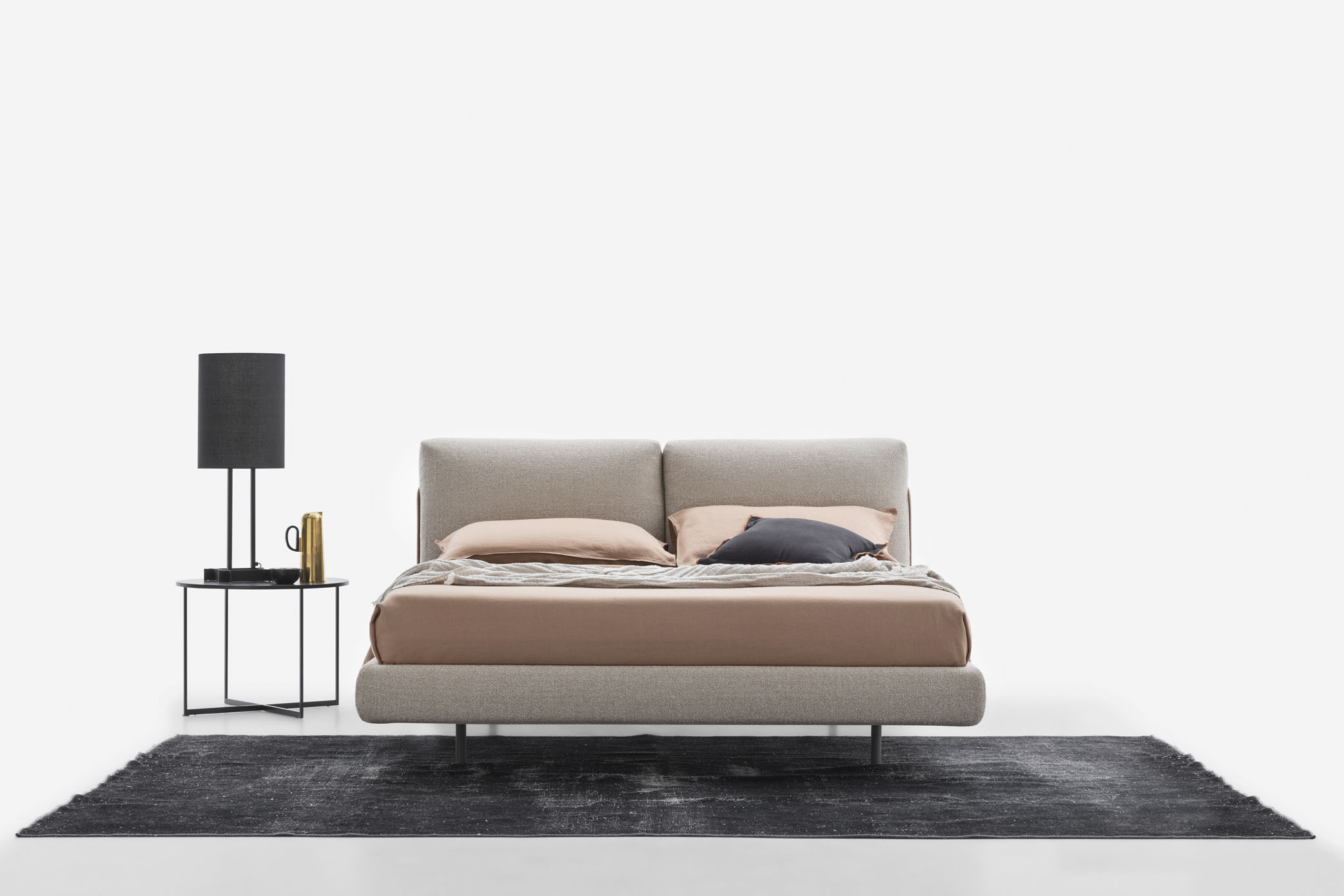 Hug is a bed with upholstered headboard and platform. Its main feature is the shaped headboard back that is extended at the sides, embracing the headboard and platform.