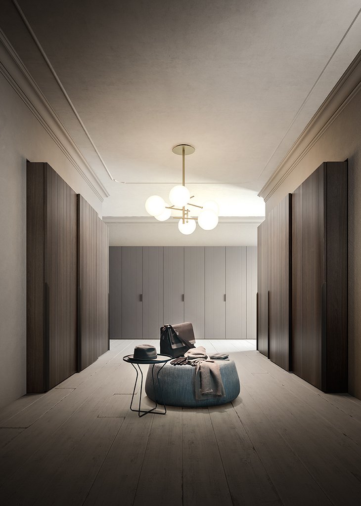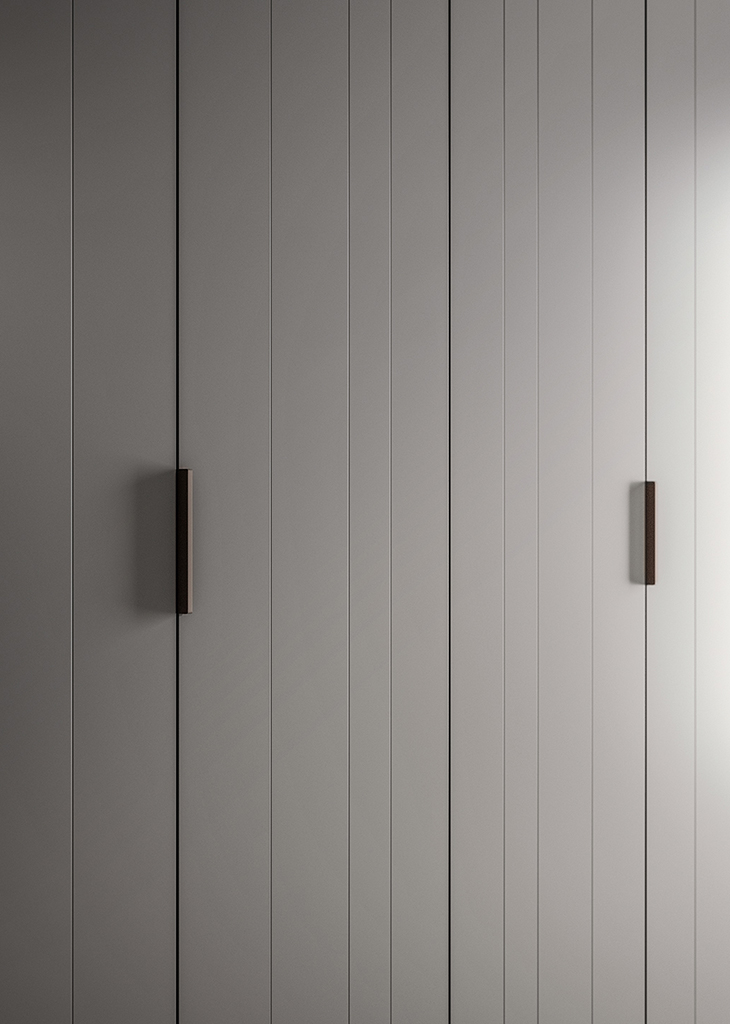 Rain is a modern designer wardrobe with a door featuring vertical machined work that creates an unusual visual effect. It is available in wood or lacquered finish.
