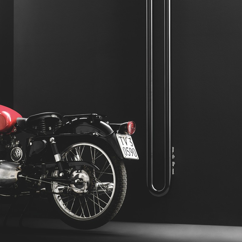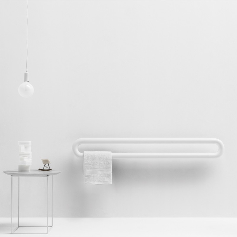 Tubone contemporary bathroom and living room radiator starts off as a linear, simple and clean-cut shape where proportions become a distinguishing and identification feature. The basic element comprises an oval ring made with a tubular element with a considerable cross section of 60 mm, with two very sharp 180-degree bends.