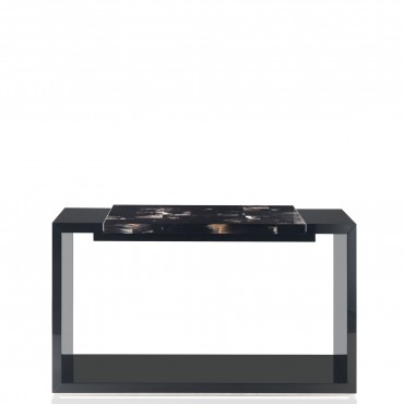 A statement of superb quality and high-end style, the Essenziale console table will enhance your abode with its refined design. The clean-lined structure in glossy black lacquered wood is enhanced by a mesmerizing top in dark horn, sporting a pristine palette of black, white and creamy hues. Accented with chromed brass detailing, this design will create a dramatic focus in any setting.