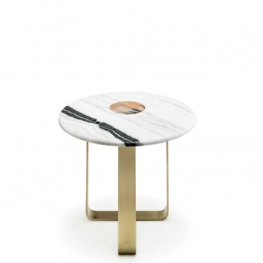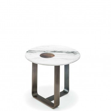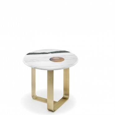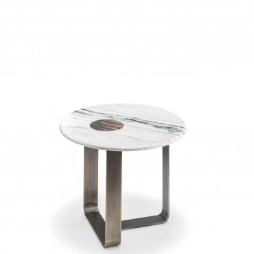 Side table in satin Dalmata marble with glossy horn inlay. Structure in satin metal.