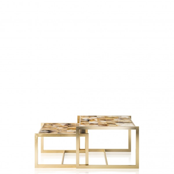 Nesting tables in horn and hand engraved 24K gold plated brass.