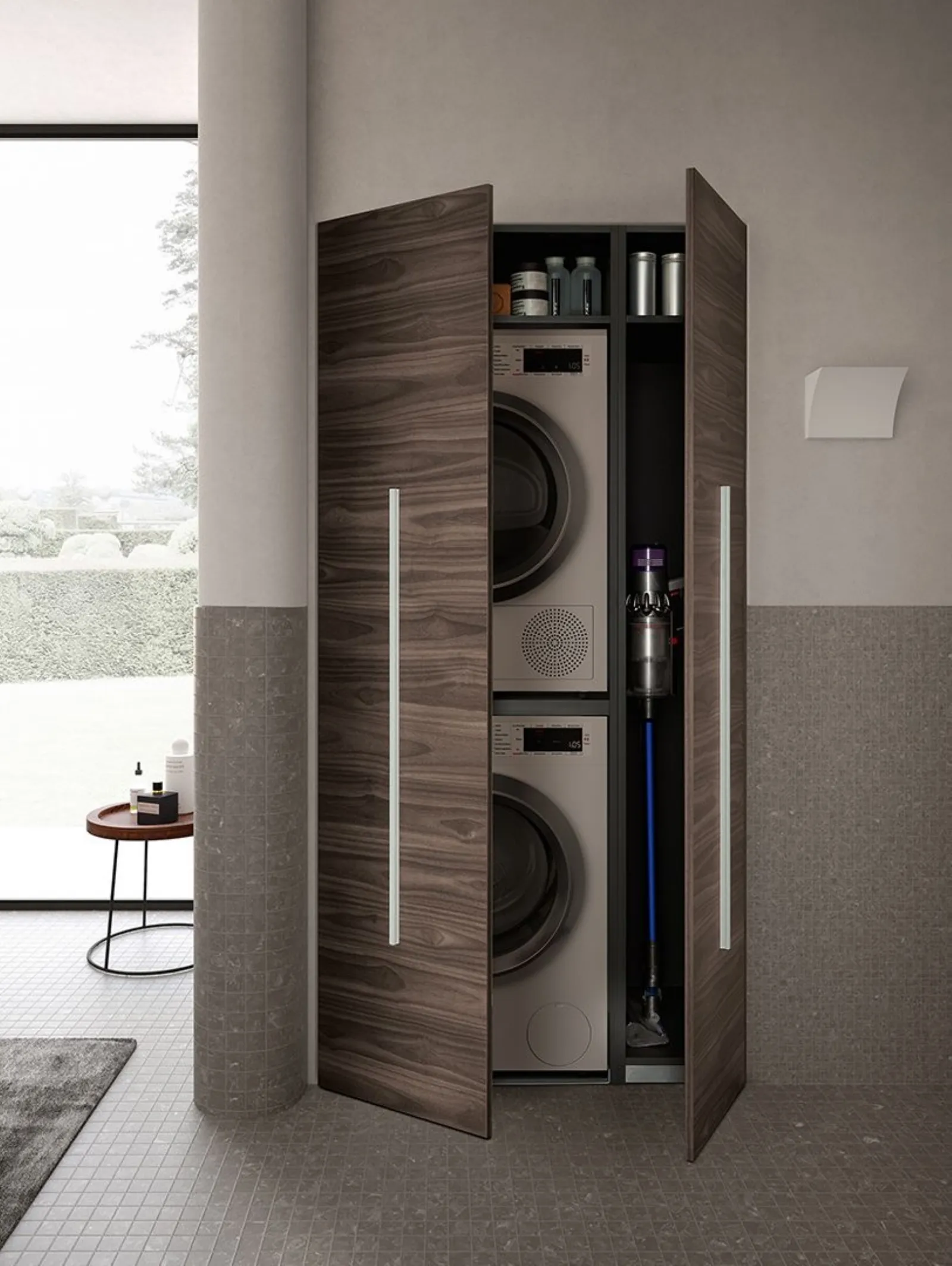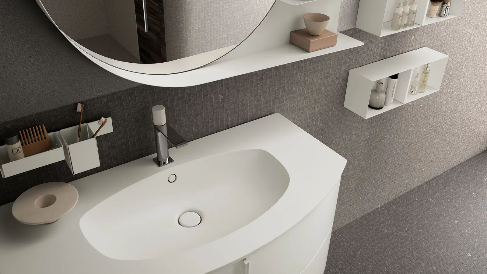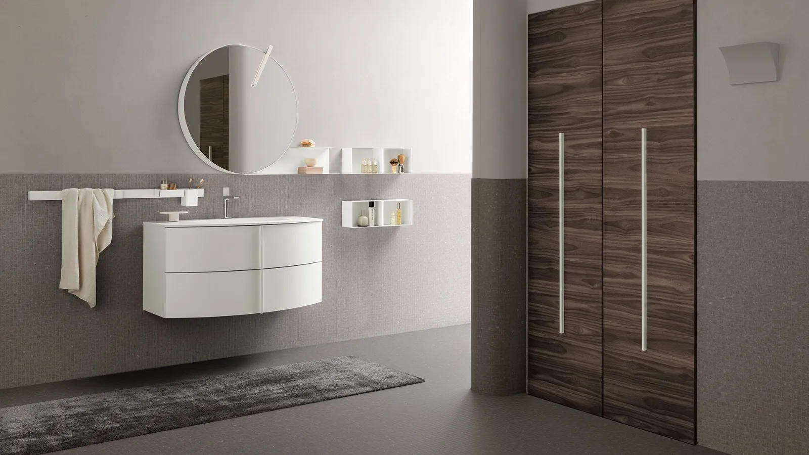 LACCATO BIANCO OPACO CON MANIGLIA M31 IN LEGNO BIANCO. - TOP OCRITECH BIANCO OPACO CON VASCA OEE5. - SPECCHIO VIRGOLA ED ELEMENTI A GIORNO IN METALLO BIANCO. - LAMPADA ATLA. - COLONNA COMPOSTA PORTAELETTRODOMESTICI CON VANO PORTA-SCOPE IN FINITURA MINATO.