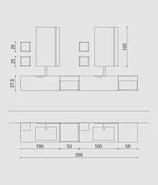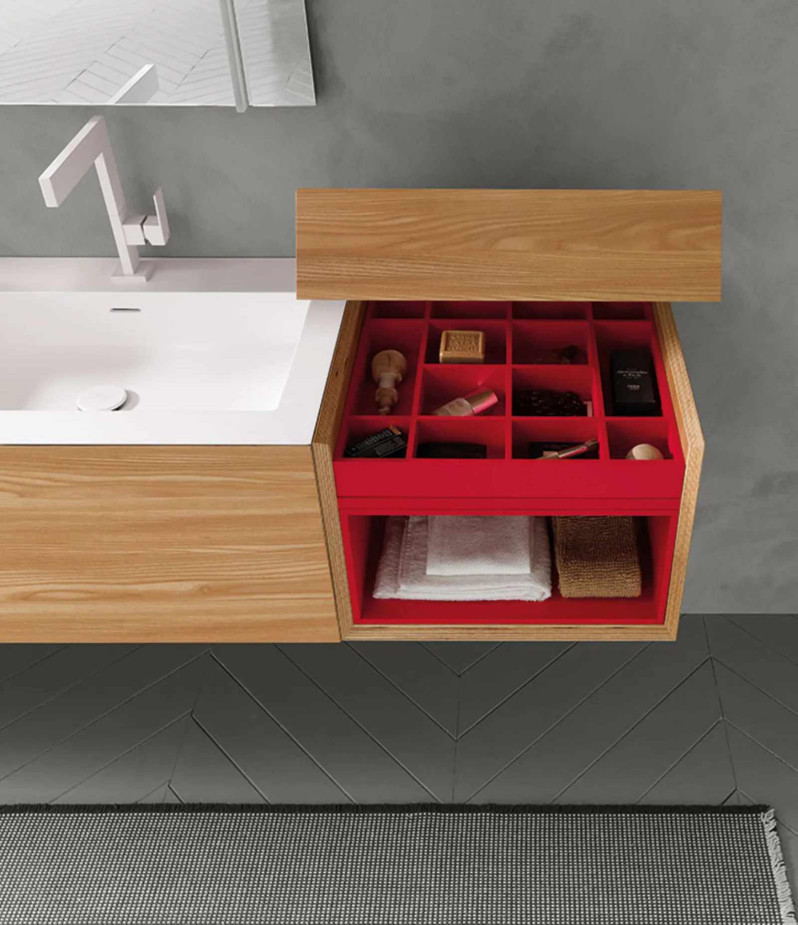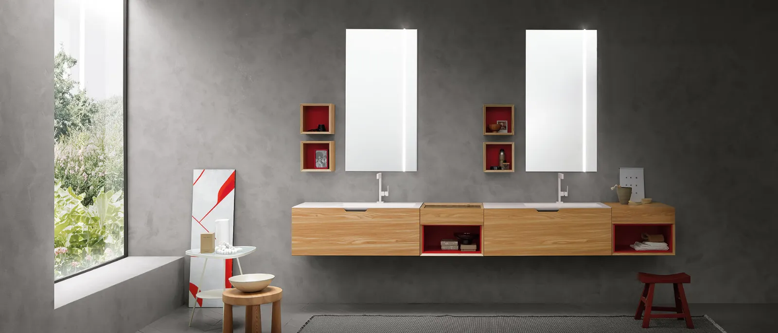 Olmo con particolari Laccato Rosso Opaco, lavabi monoblocco in Tecnoril e specchi Modular.
