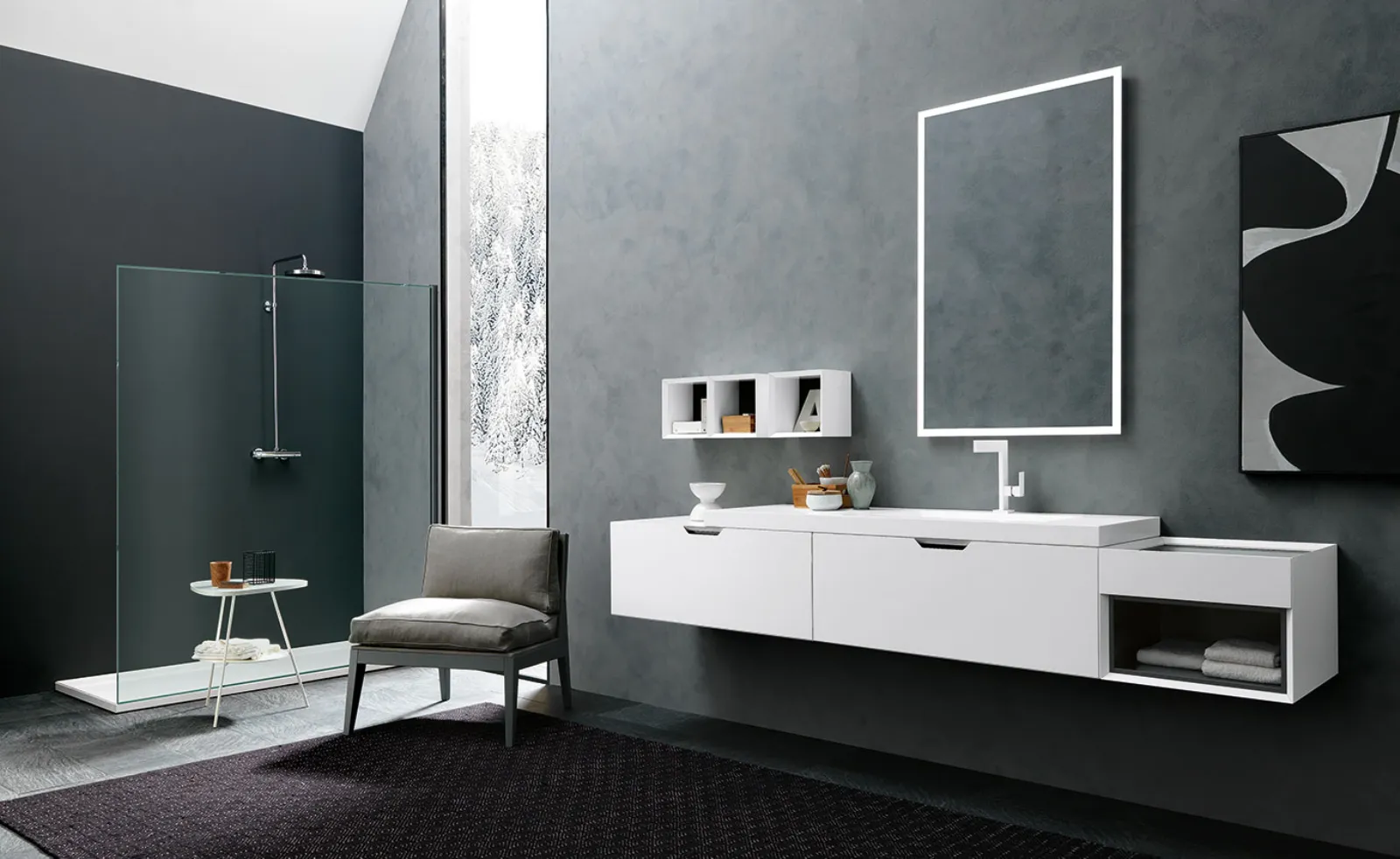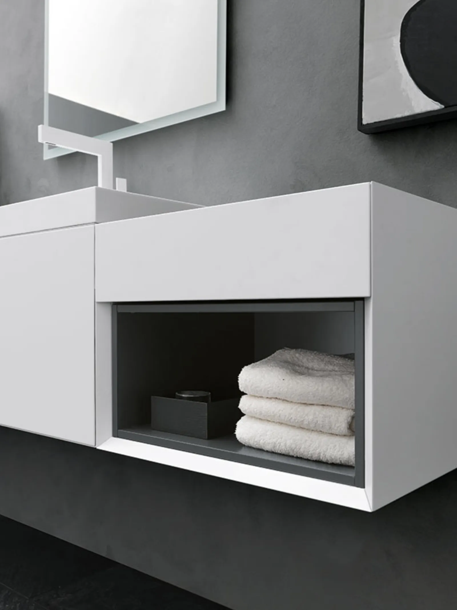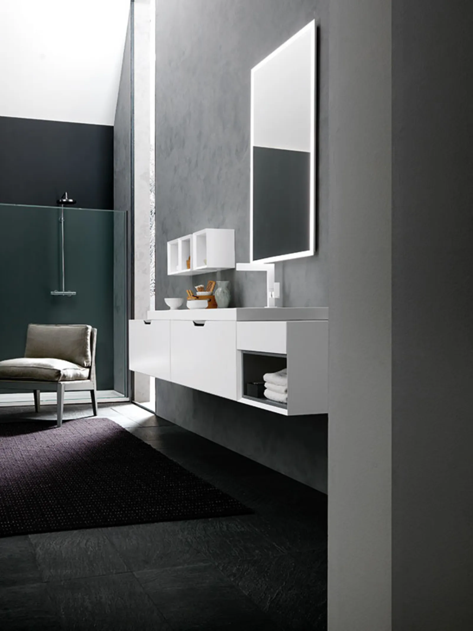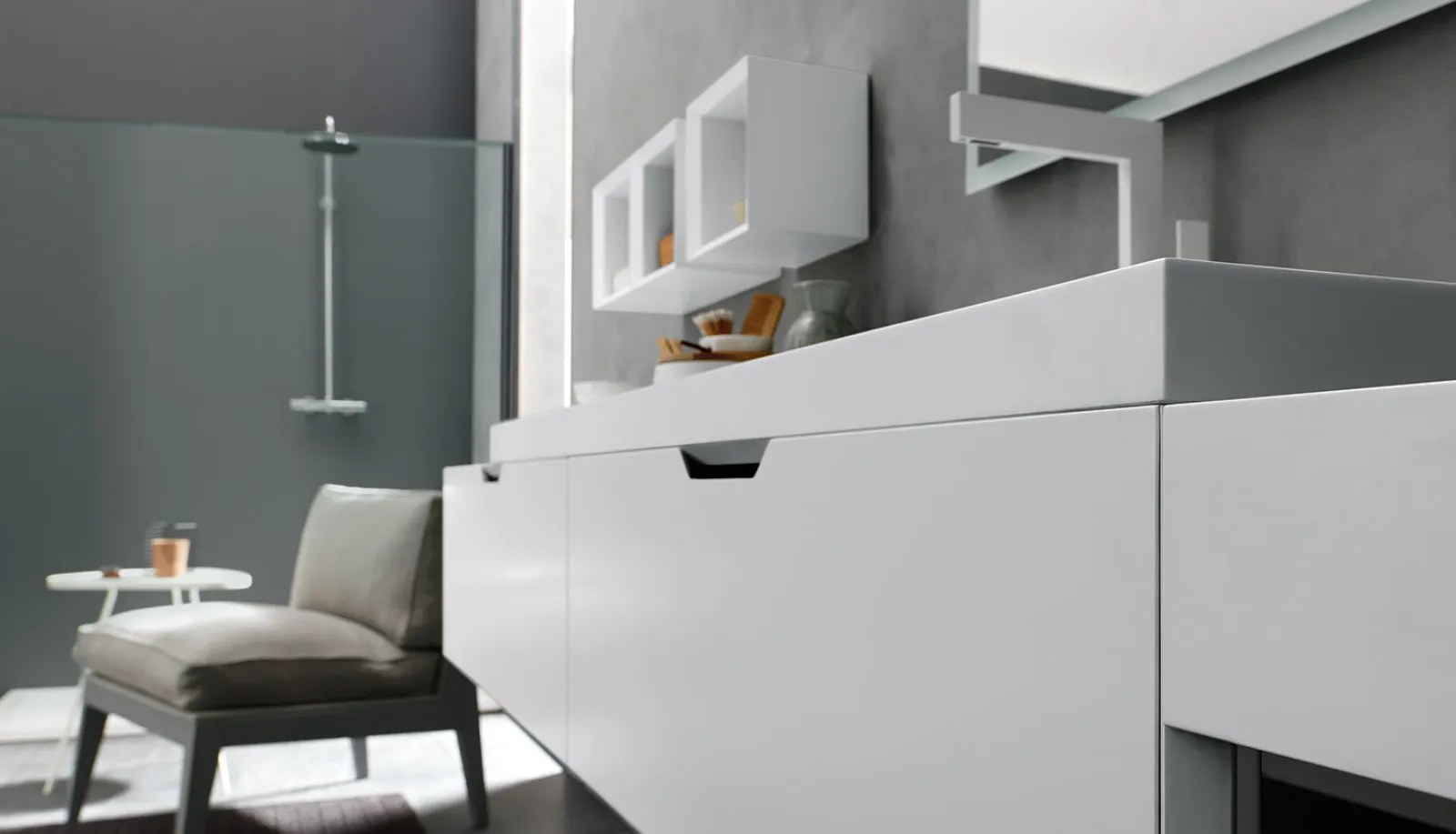 Laccato Bianco Opaco con particolari laccati Titanio, top Tecnoril sp. 6 cm con vasca integrata, specchio Luna.