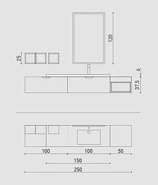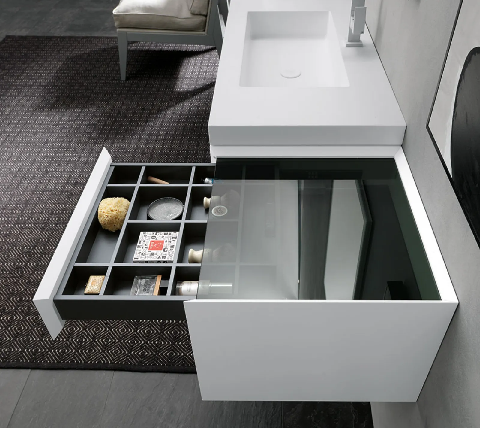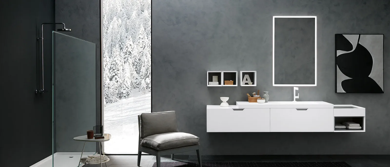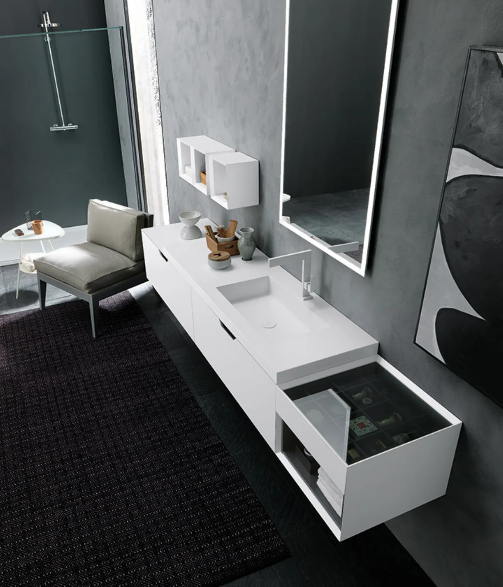 Laccato Bianco Opaco con particolari laccati Titanio, top Tecnoril sp. 6 cm con vasca integrata, specchio Luna.