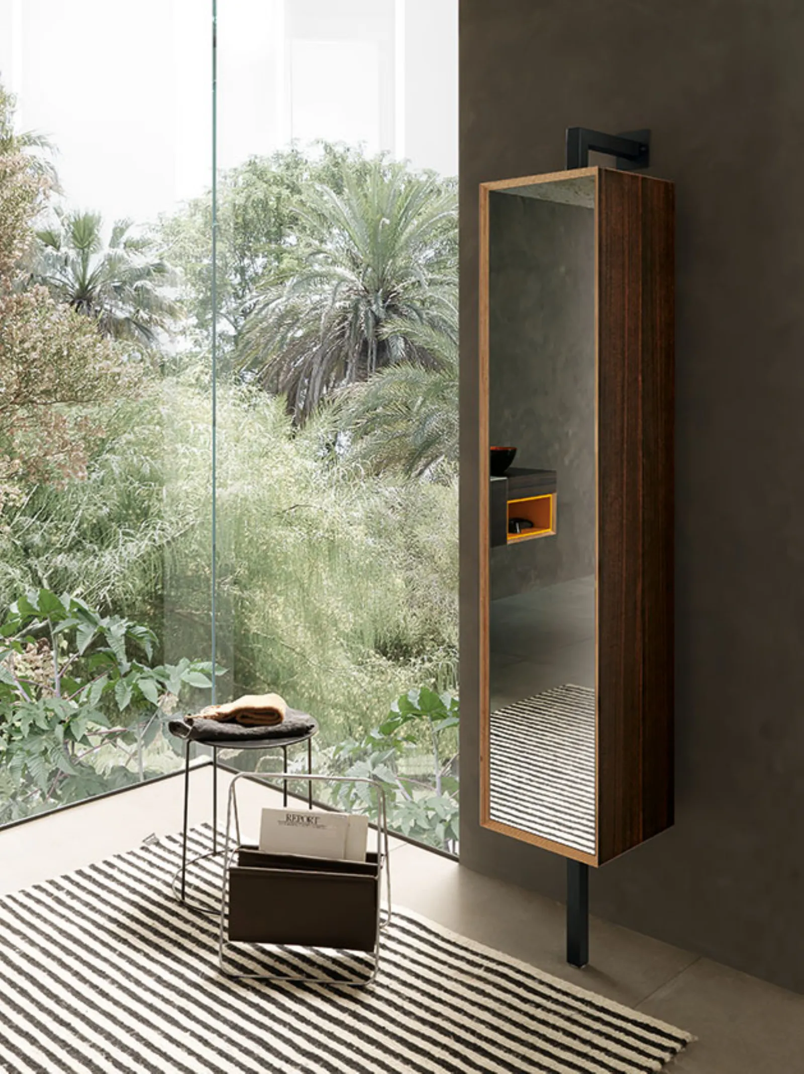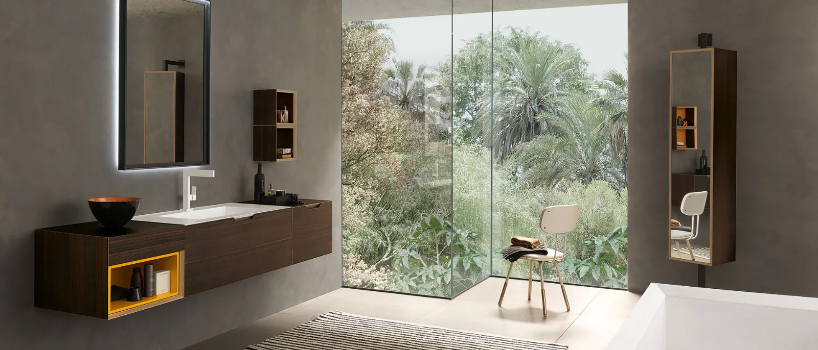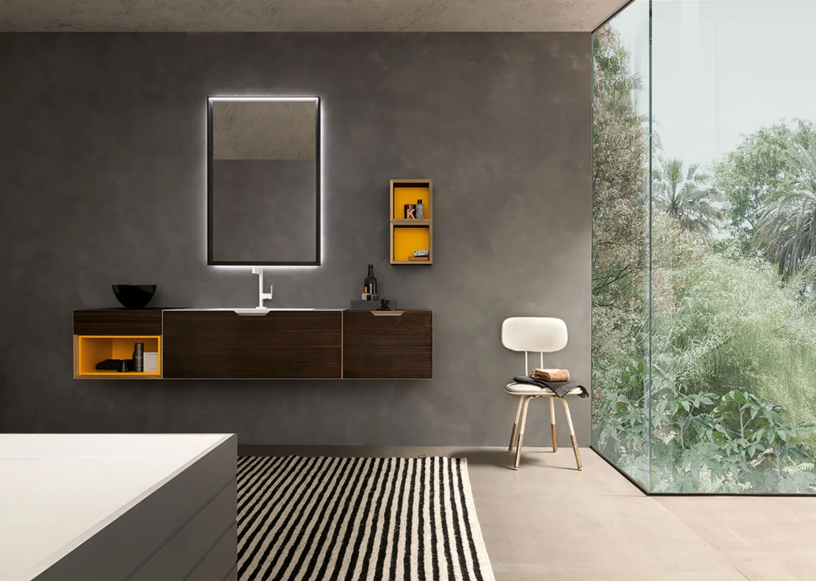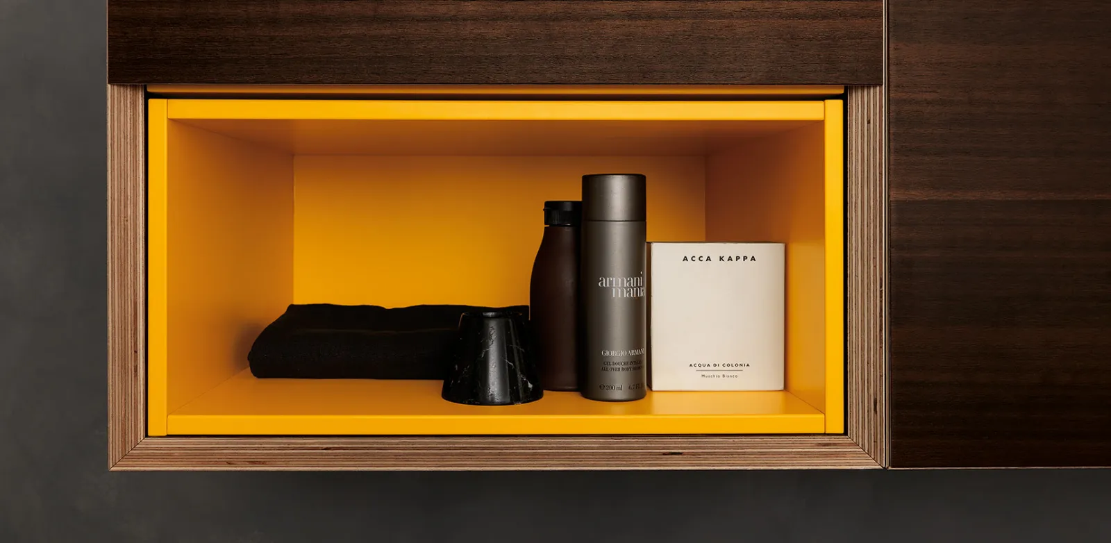 Eucalipto affumicato con particolari laccati Zafferano Opaco, lavabo monoblocco in Tecnoril, specchio Sole e colonna girevole.