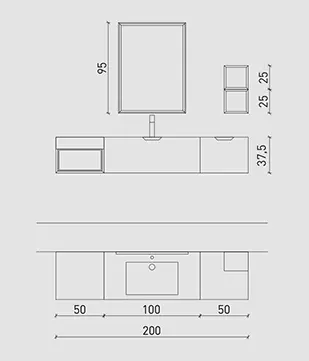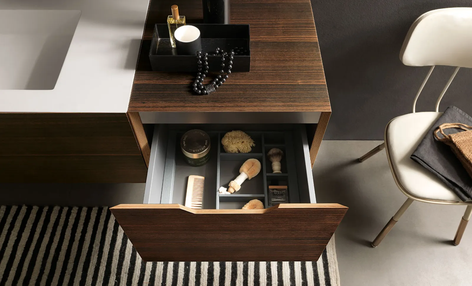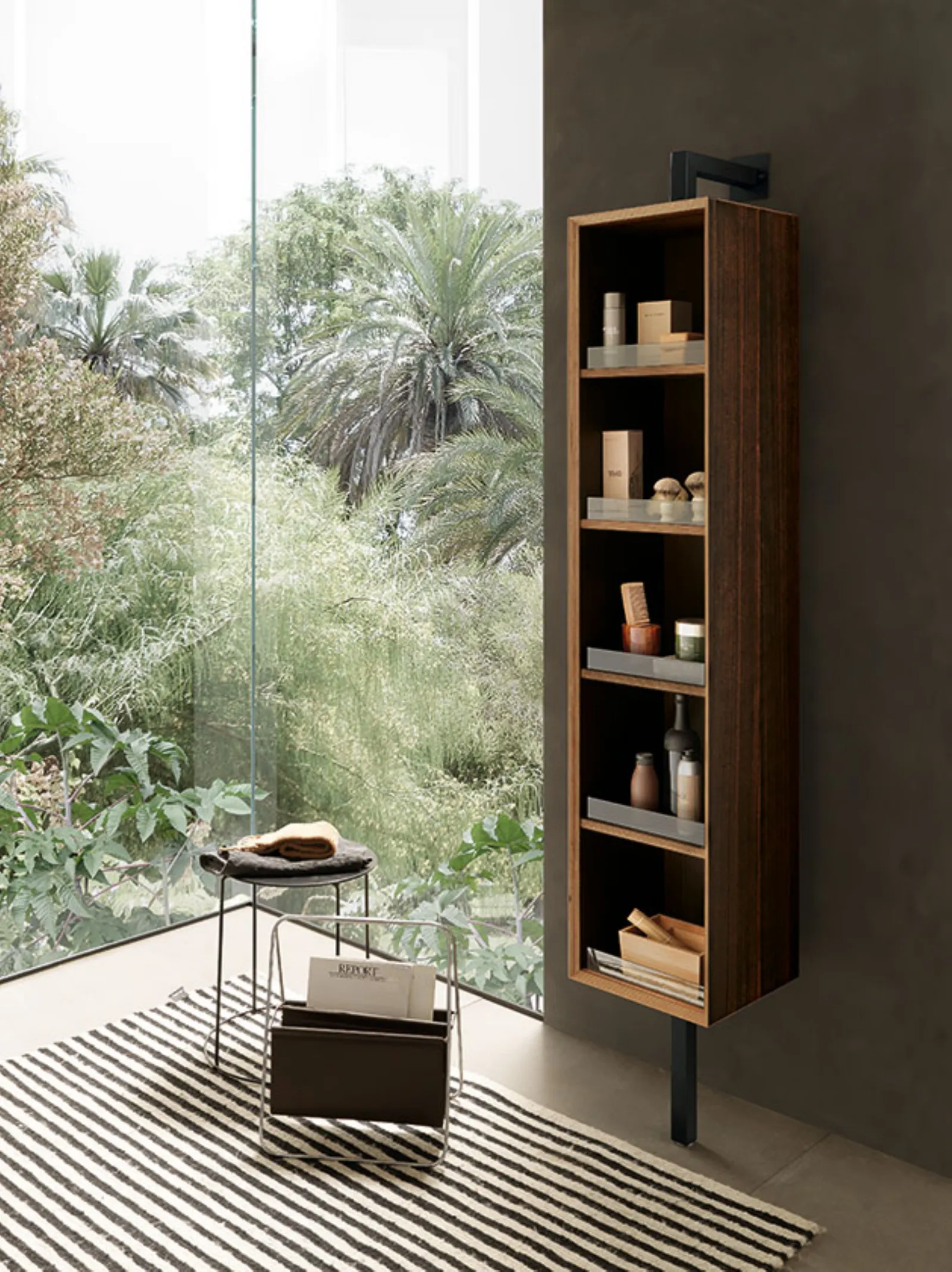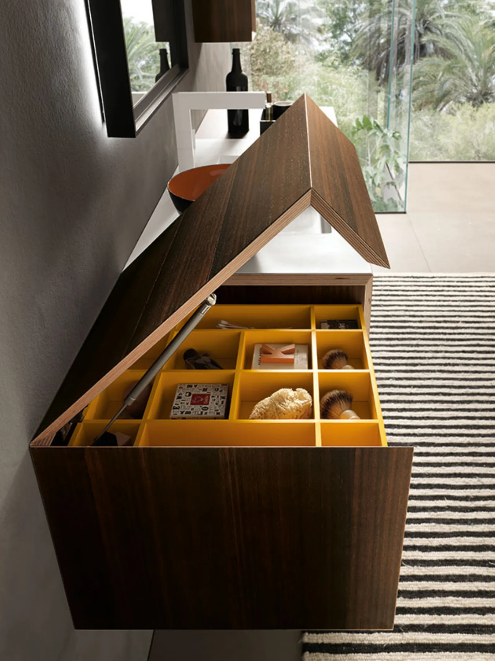 Eucalipto affumicato con particolari laccati Zafferano Opaco, lavabo monoblocco in Tecnoril, specchio Sole e colonna girevole.