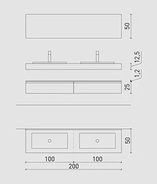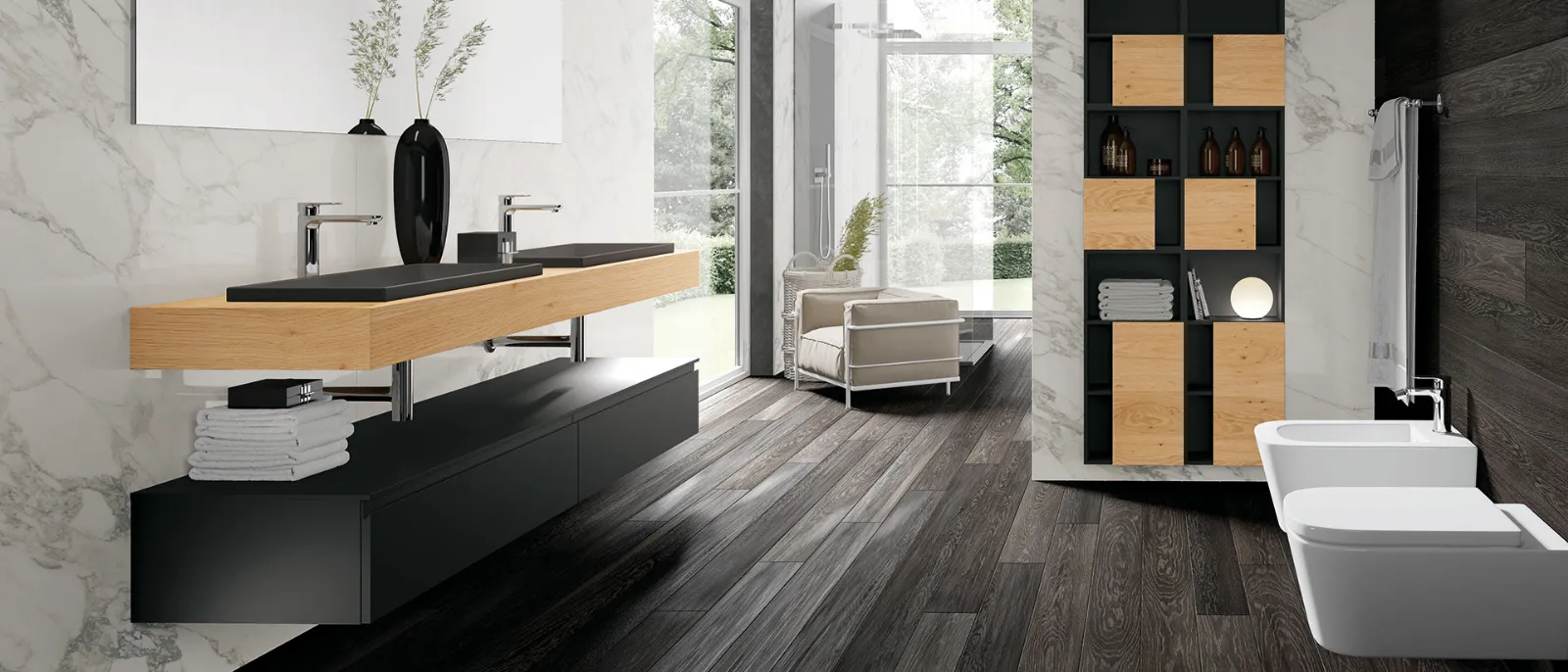 Laccato Nero Opaco, top Nordico Naturale, lavabi Regolo in ceramica nera, specchio profilo alluminio e lampade Clio Slim.