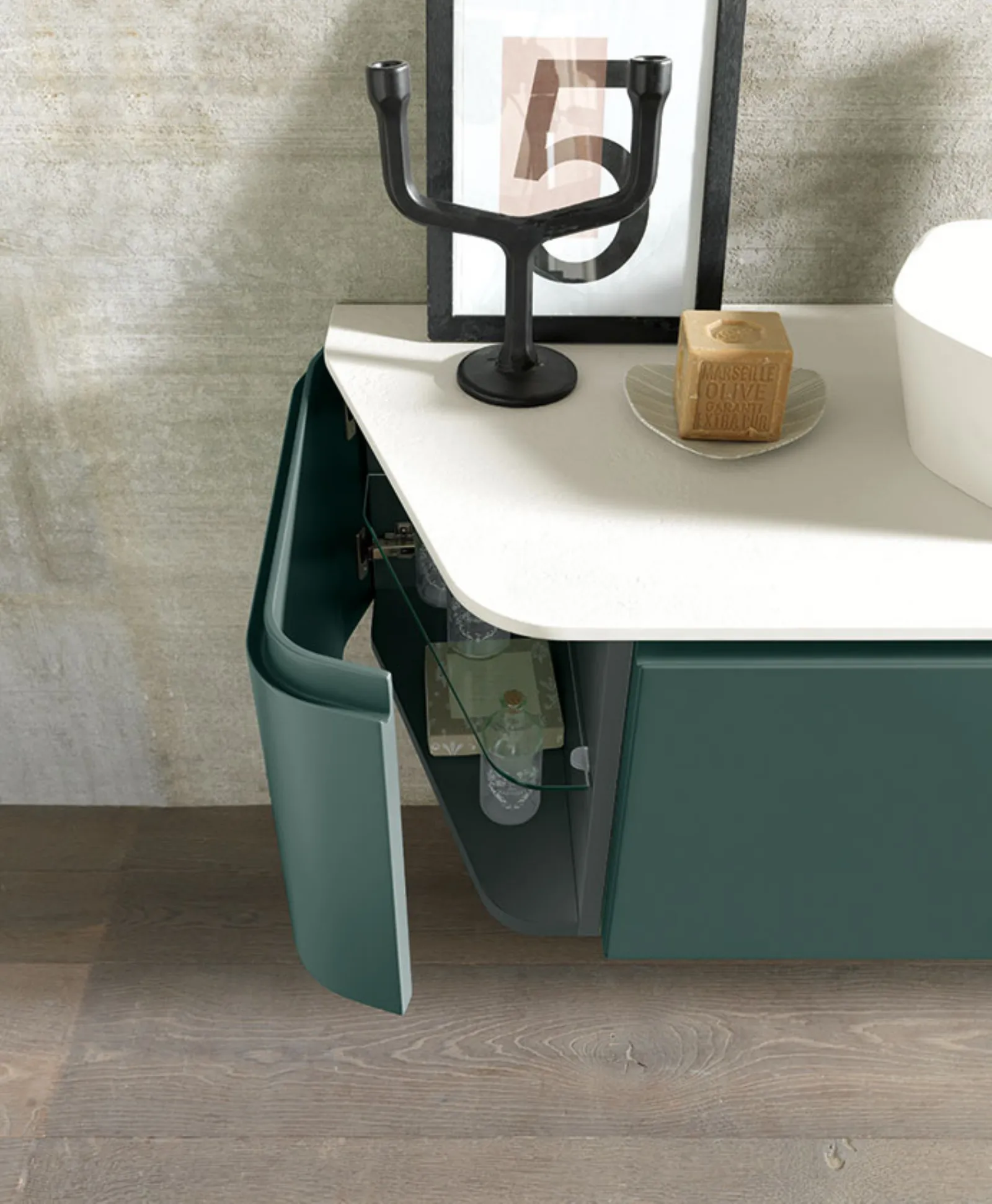 Laccato bosco opaco, top e lavabo Maya in Deimos stone texture bianco traffico. Specchio vintage con lampada sfera.