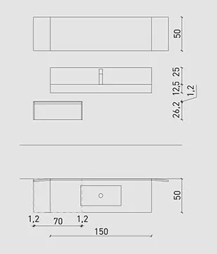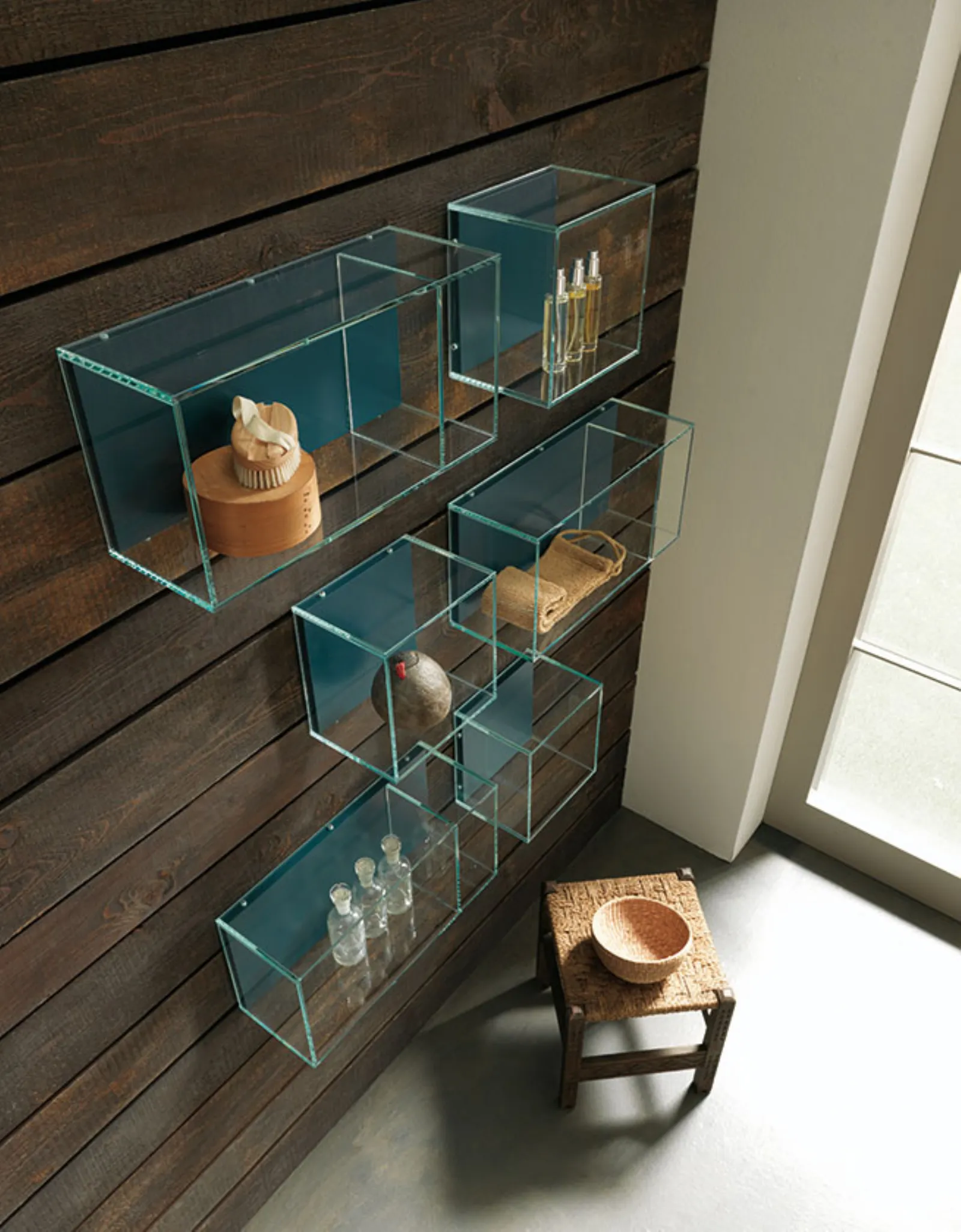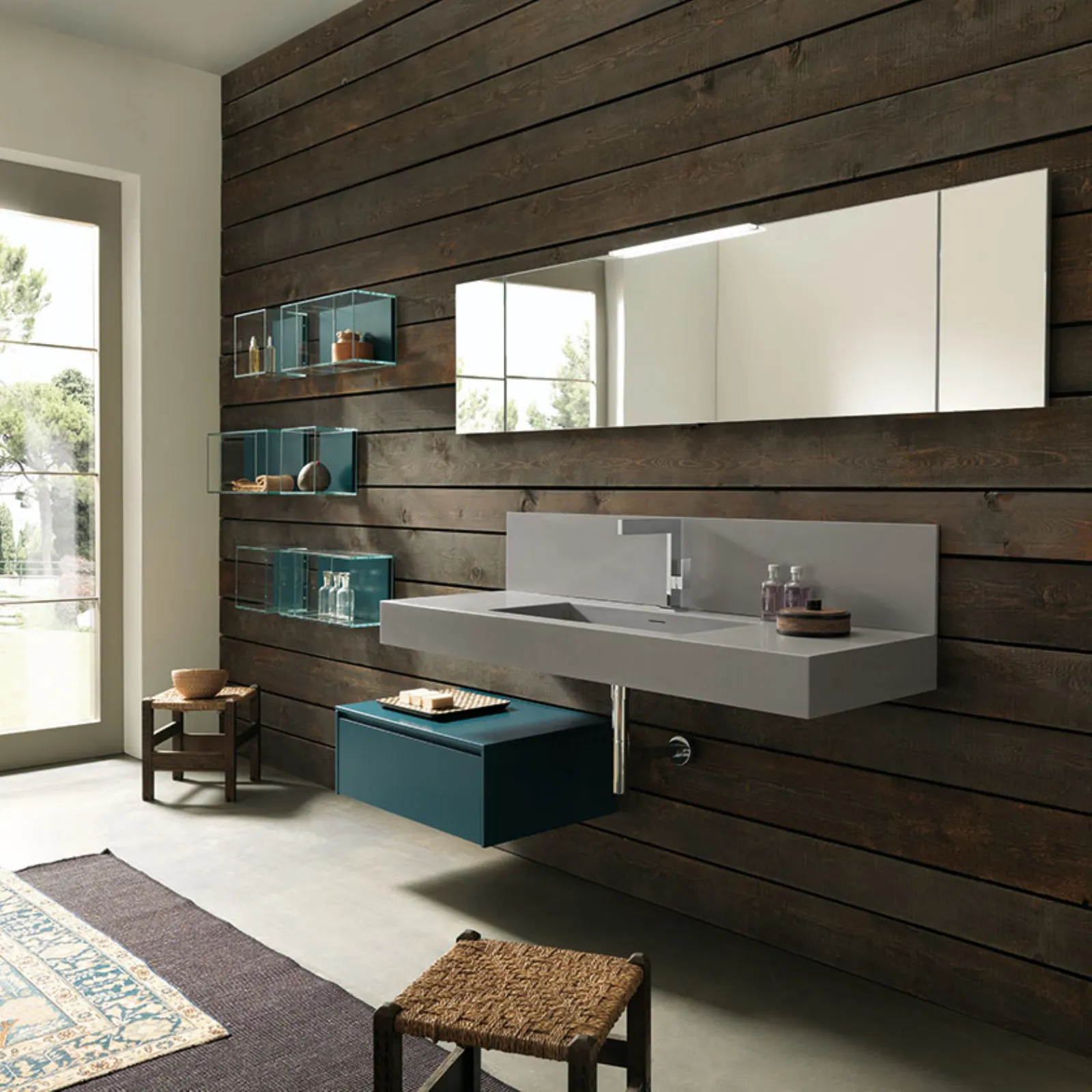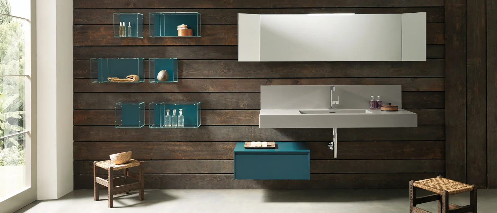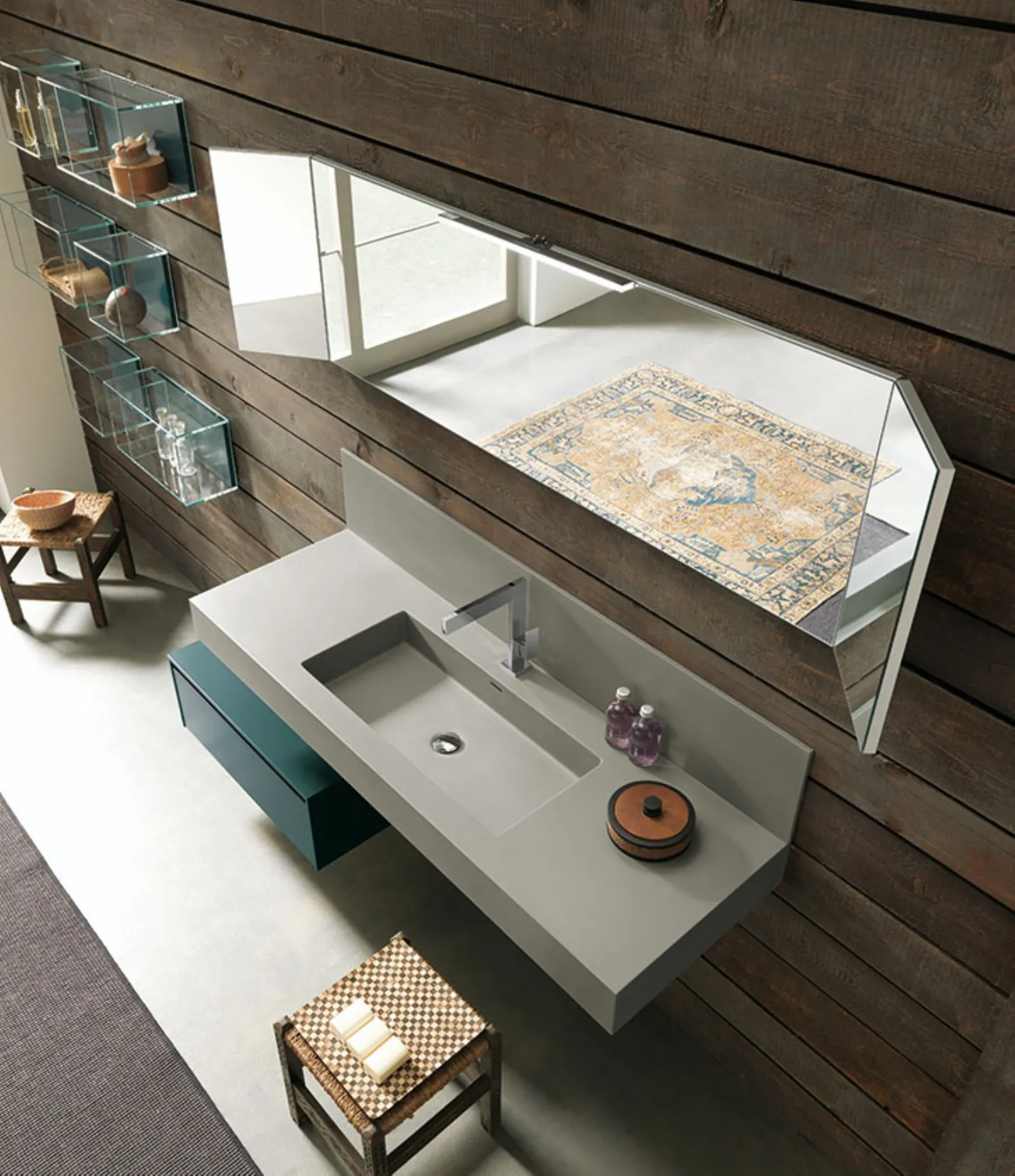 Petrolio opaco, top in Deimos Stone grigio cemento con vasca integrata “H”, specchio con laterali reclinabili e lampada Clio Slim.