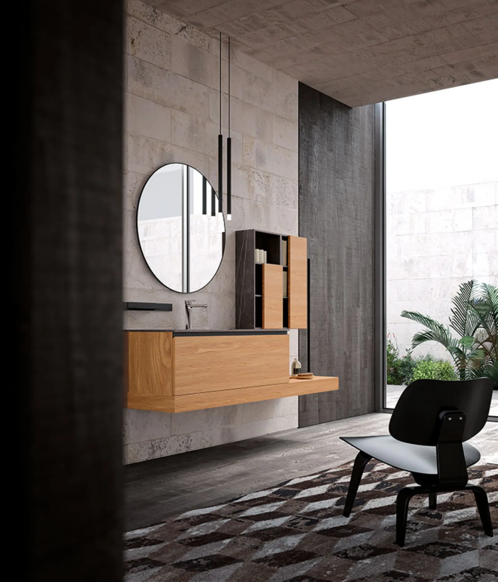 Impiallacciato Olmo con particolari Hpl Tobacco 440 e maniglia Titanio. Top Hpl Tobacco 440 con vasca integrata “HH”, specchio Gamma e lampade Tube in metallo nero