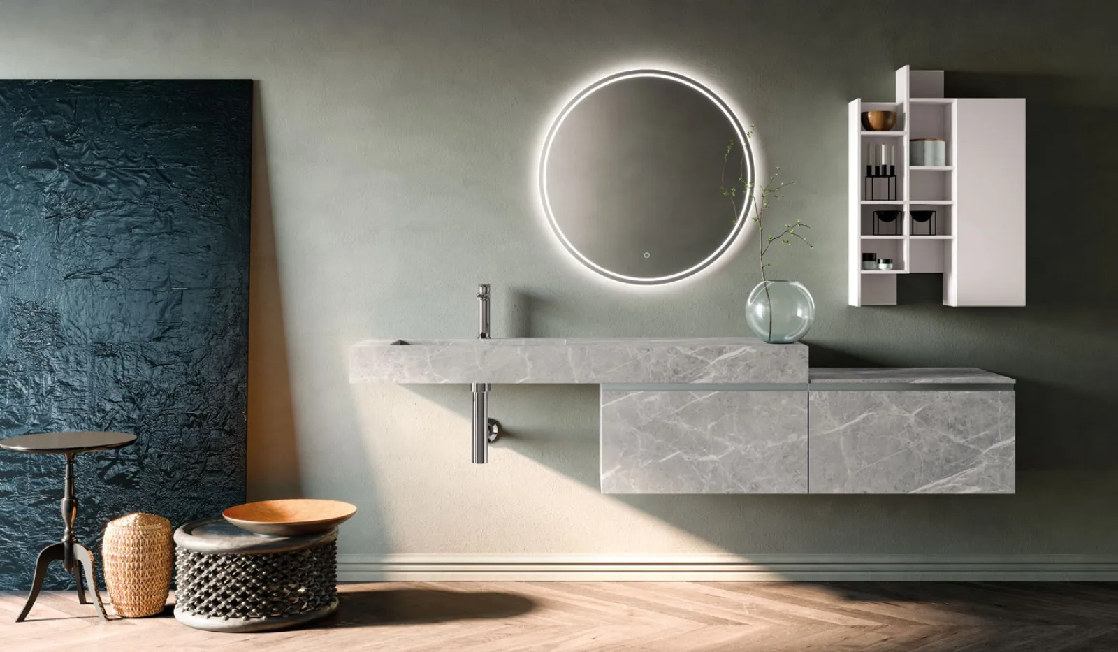 Hpl Antique, maniglia alluminio satinato, pensile ed elementi a giorno “Square” laccati Bianco Opaco. Top hpl Antique sp. 10 cm con vasca integrata “HF”, specchio Moon.