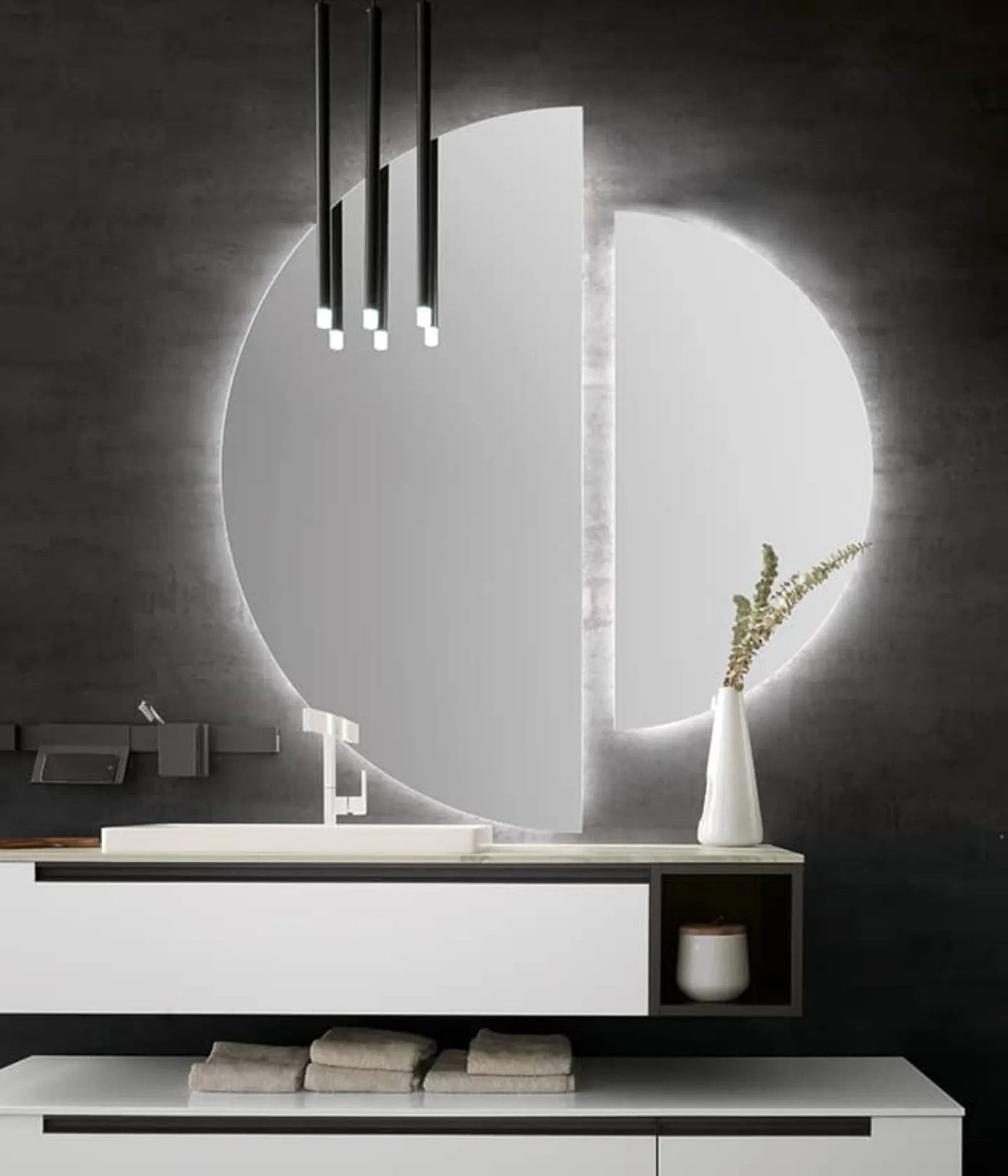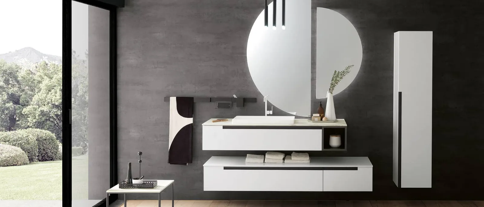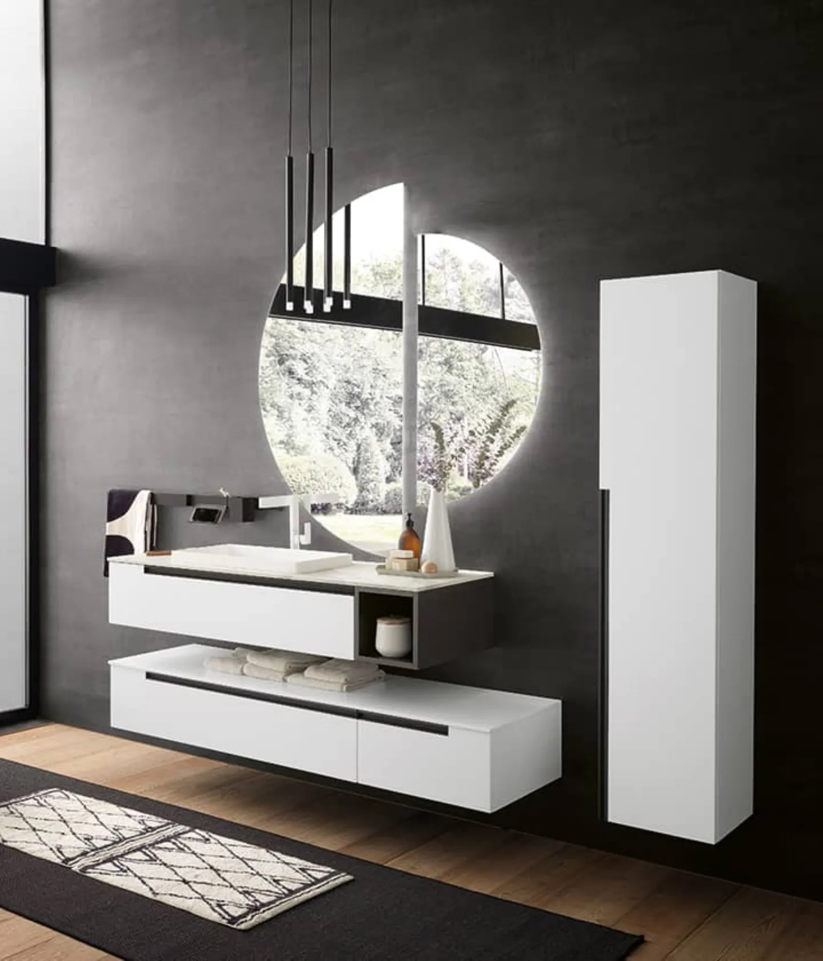 Bianco opaco con maniglia titanio e base a giorno titanio opaco. Top in gres striato opaco con lavabo Regolo in tecnoril. Specchi Sputnik con led perimetrali e lampade a sospensione Tube nere.