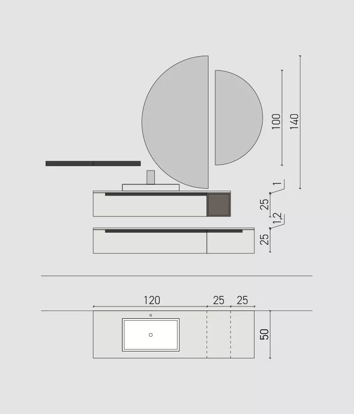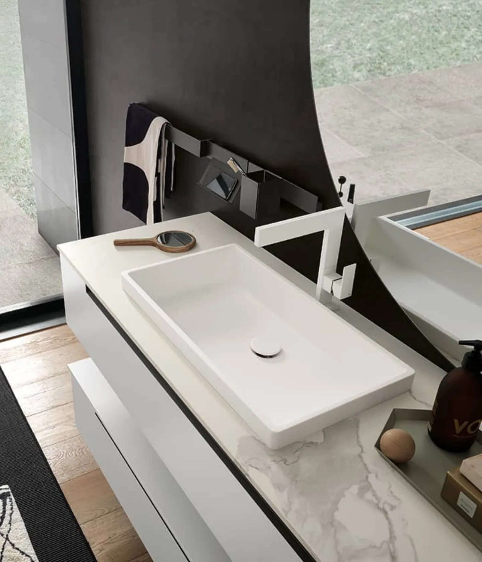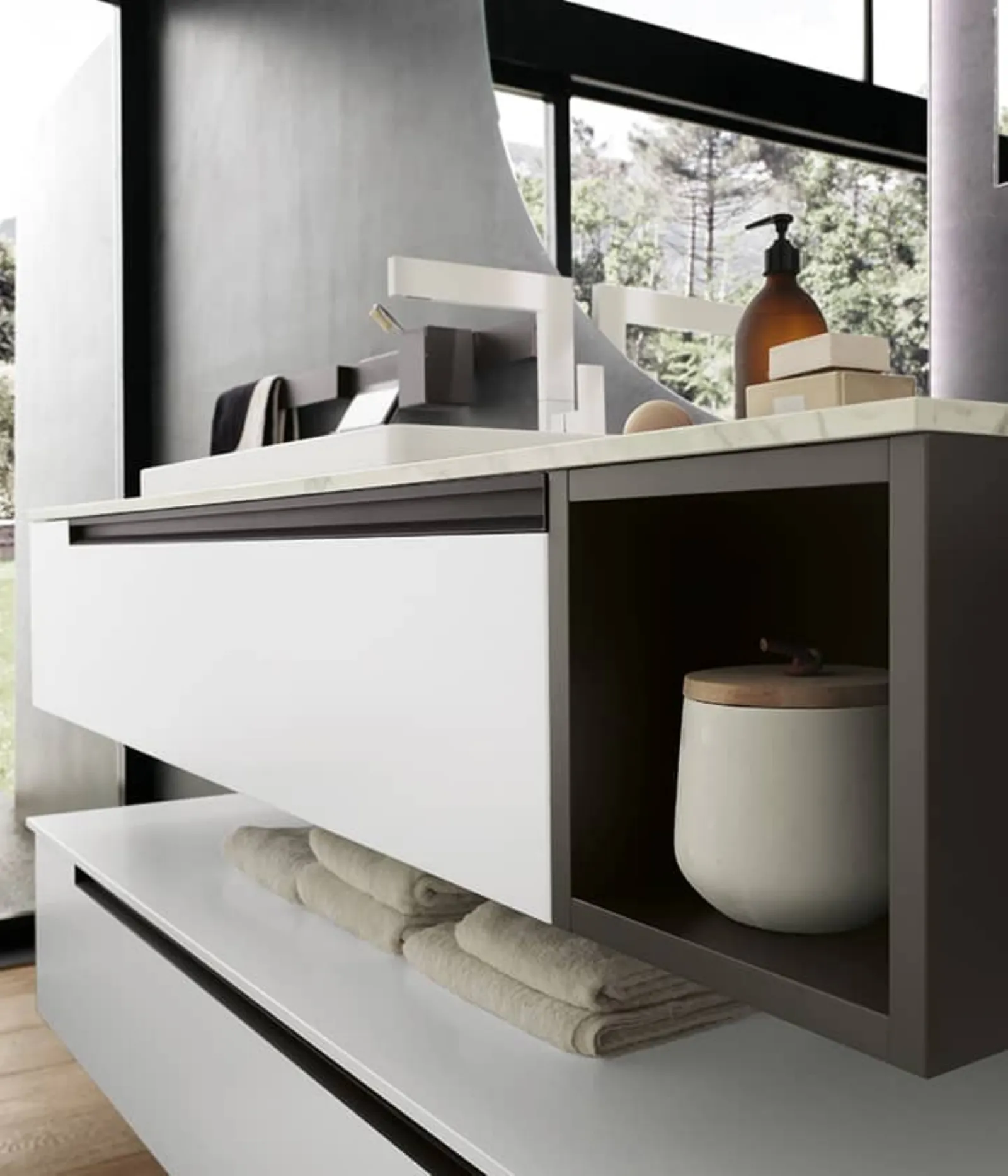 Bianco opaco con maniglia titanio e base a giorno titanio opaco. Top in gres striato opaco con lavabo Regolo in tecnoril. Specchi Sputnik con led perimetrali e lampade a sospensione Tube nere.