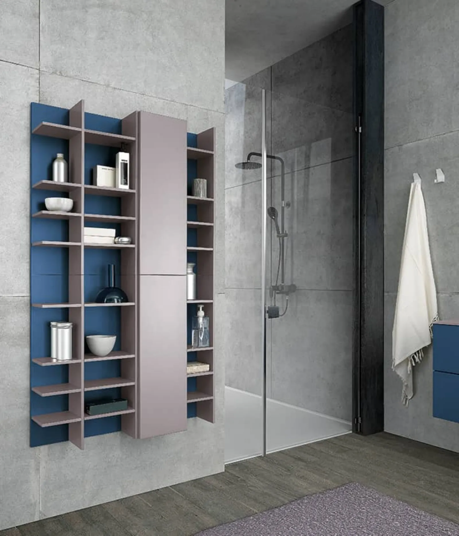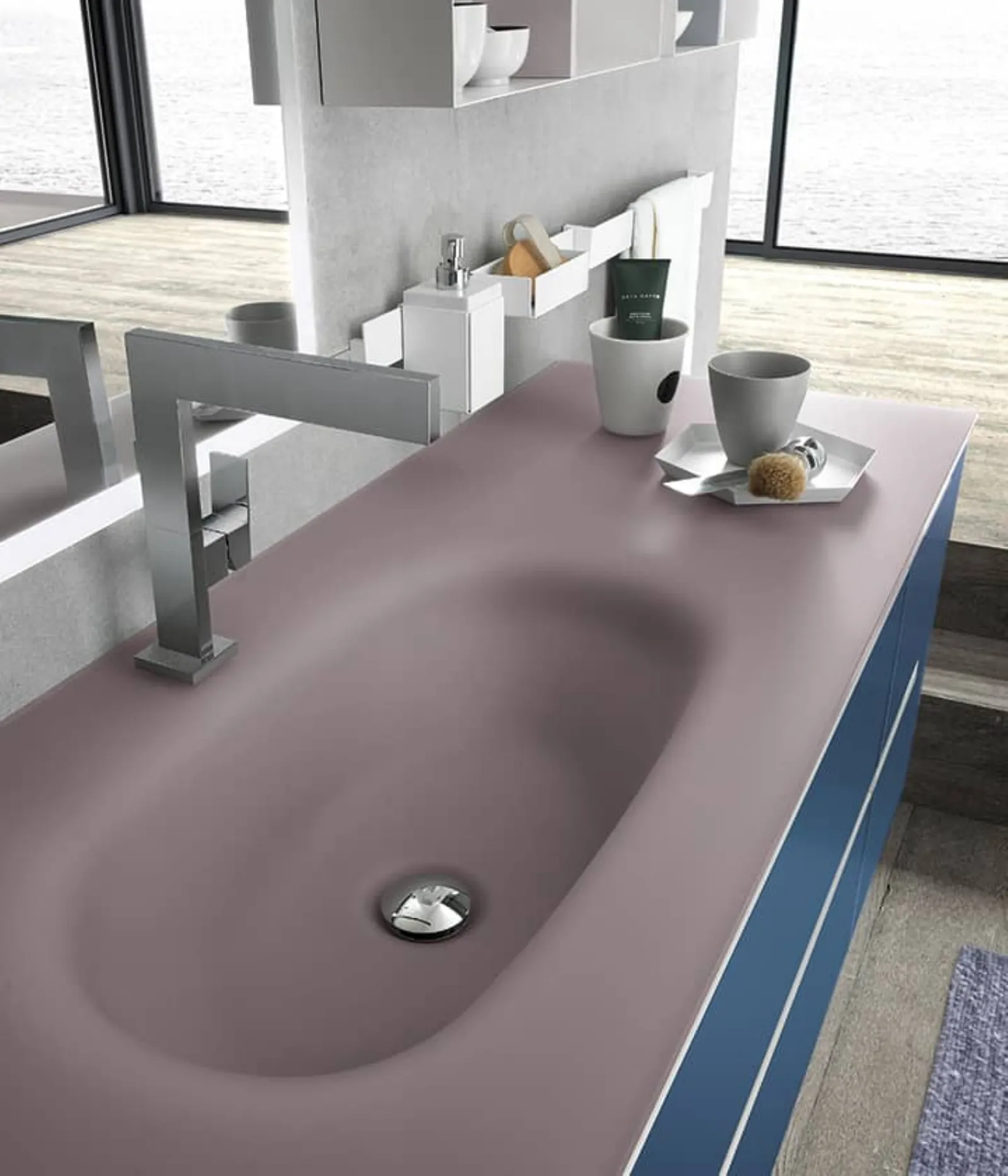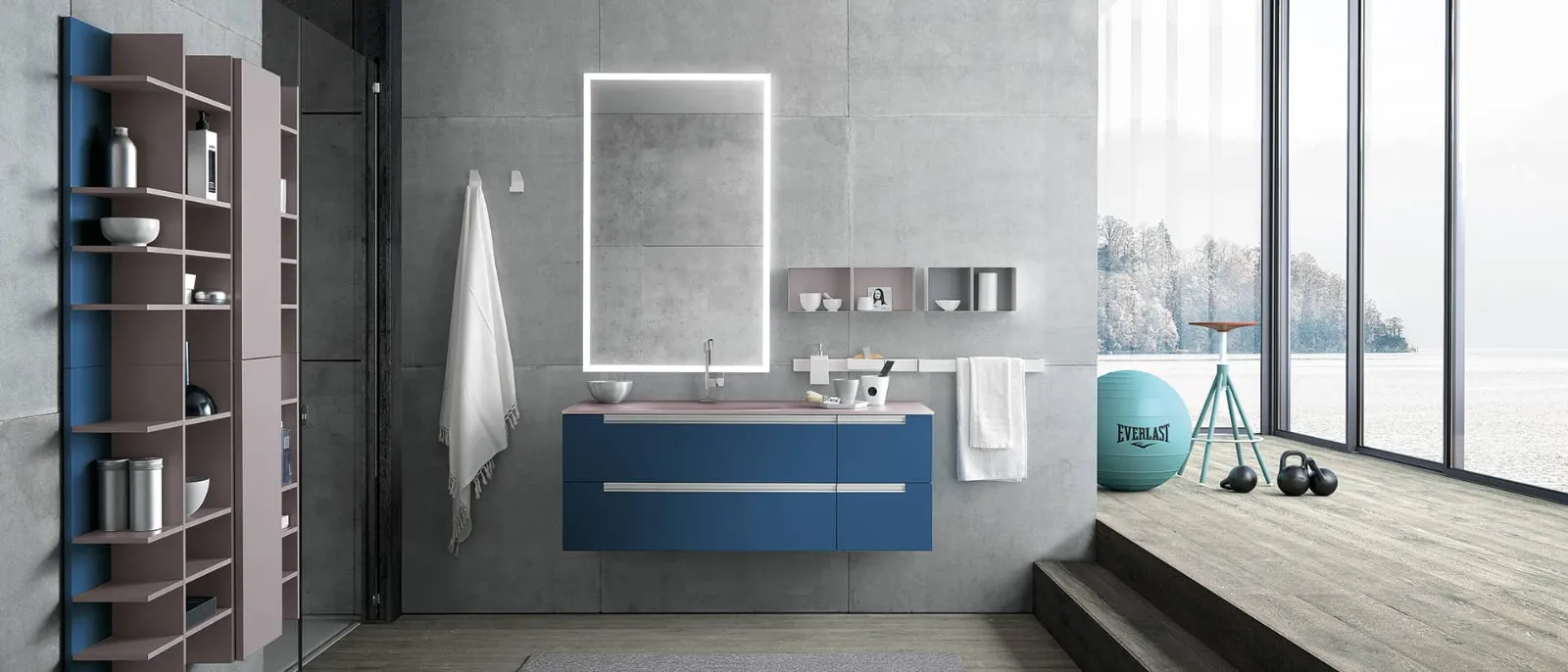 Blu moby opaco con maniglie alluminio satinato e piano in vetro acidato cipria con vasca integrata VG. Elementi a giorno in metallo bianco con retro laccato fard e finestra opaco, specchio Luna.