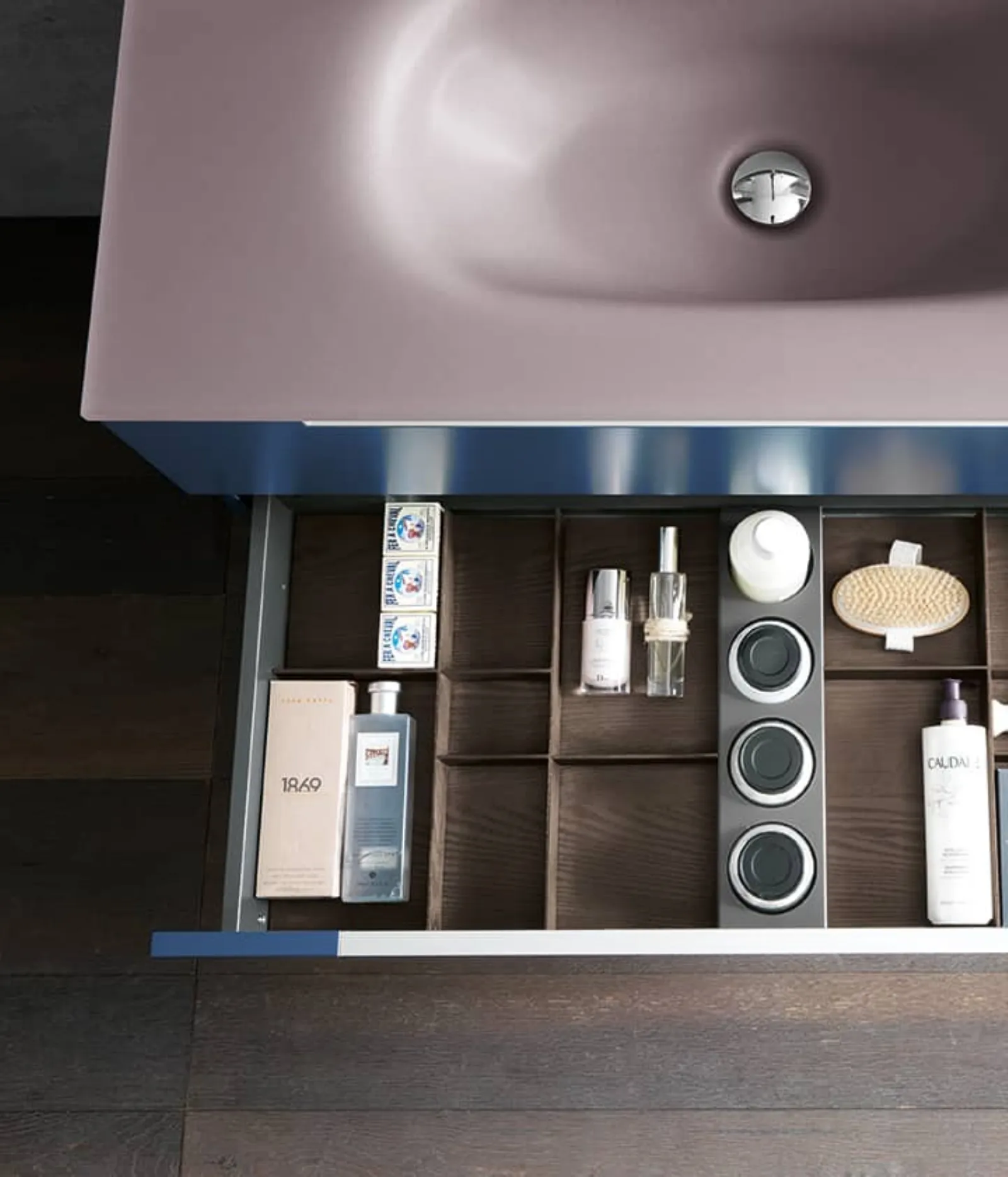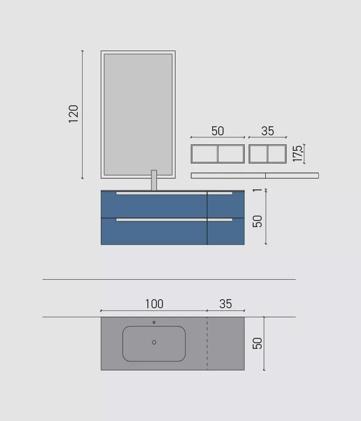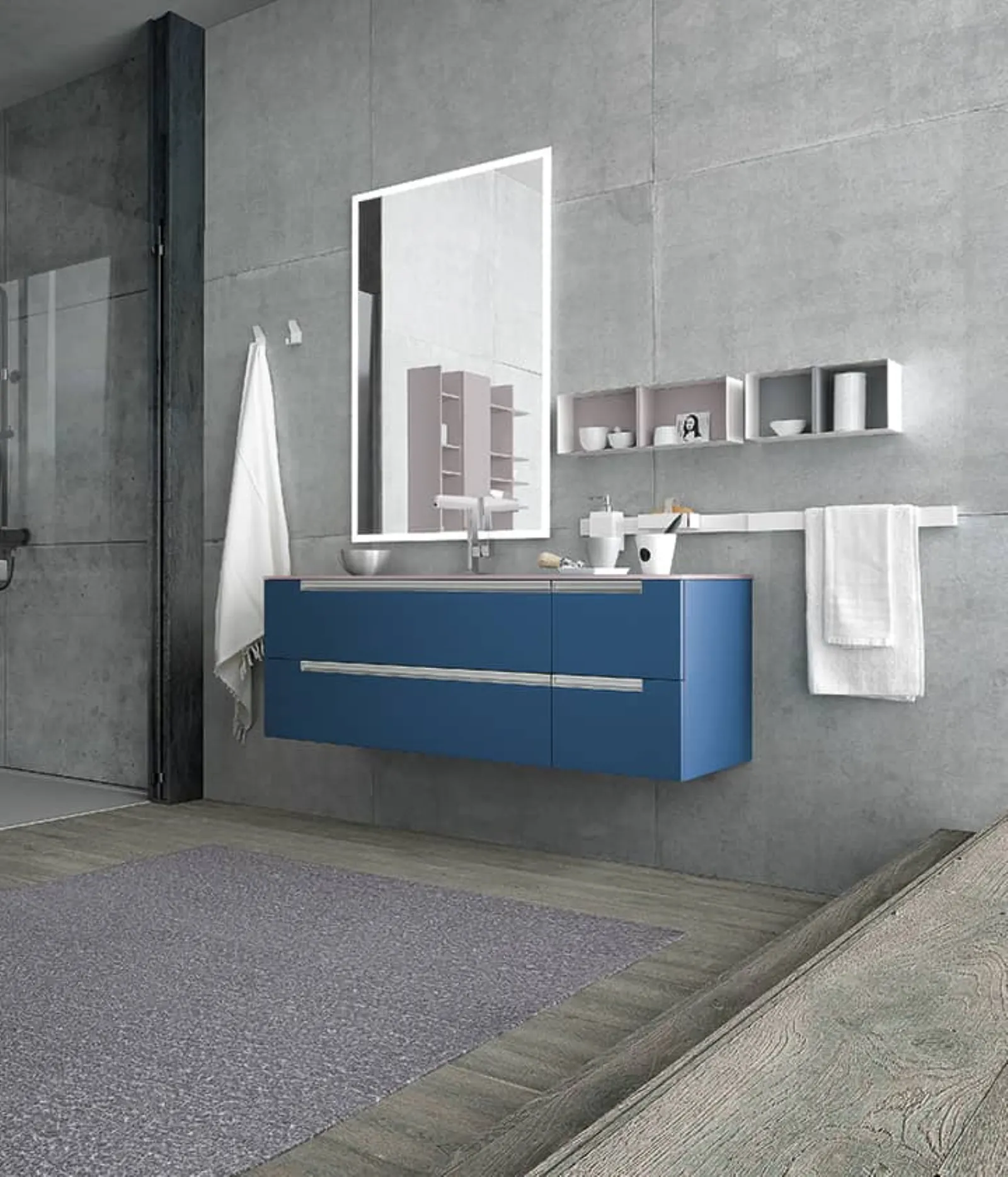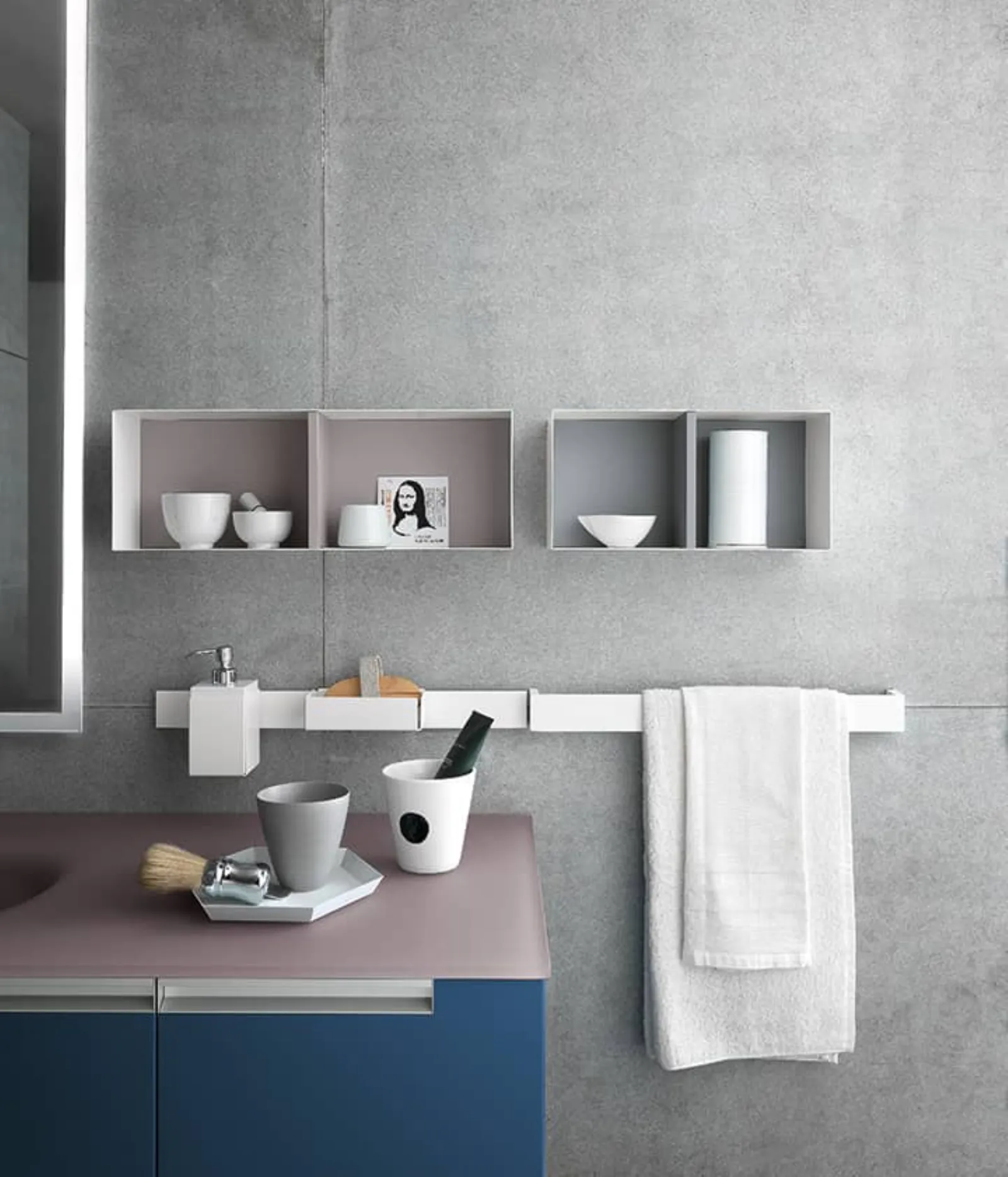 Blu moby opaco con maniglie alluminio satinato e piano in vetro acidato cipria con vasca integrata VG. Elementi a giorno in metallo bianco con retro laccato fard e finestra opaco, specchio Luna.