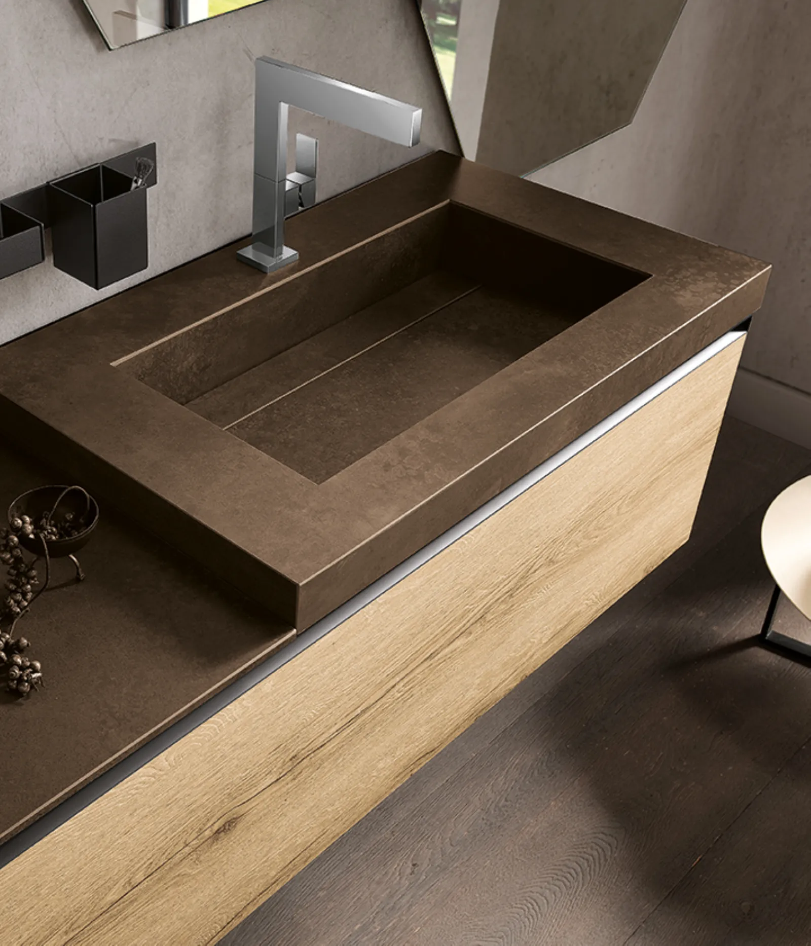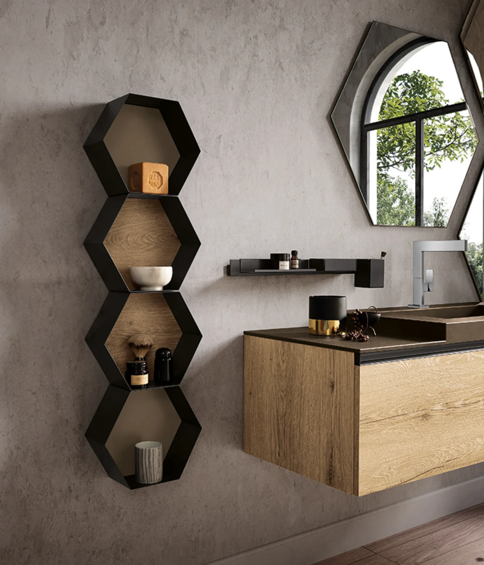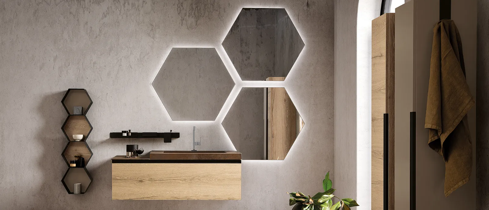 Bimelaminico rovere spaccato con maniglie titanio e top in gres ossido bruno con vasca integrata Gk. Specchi esagonali Ride con profilo nero e illuminazione perimetrale a led.
