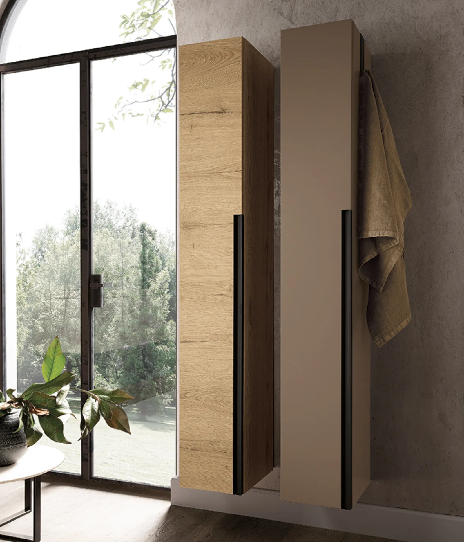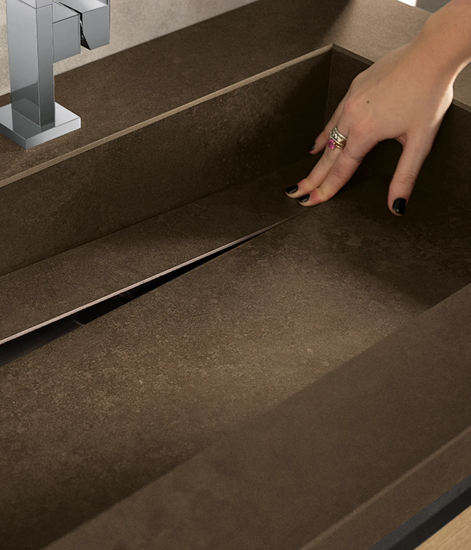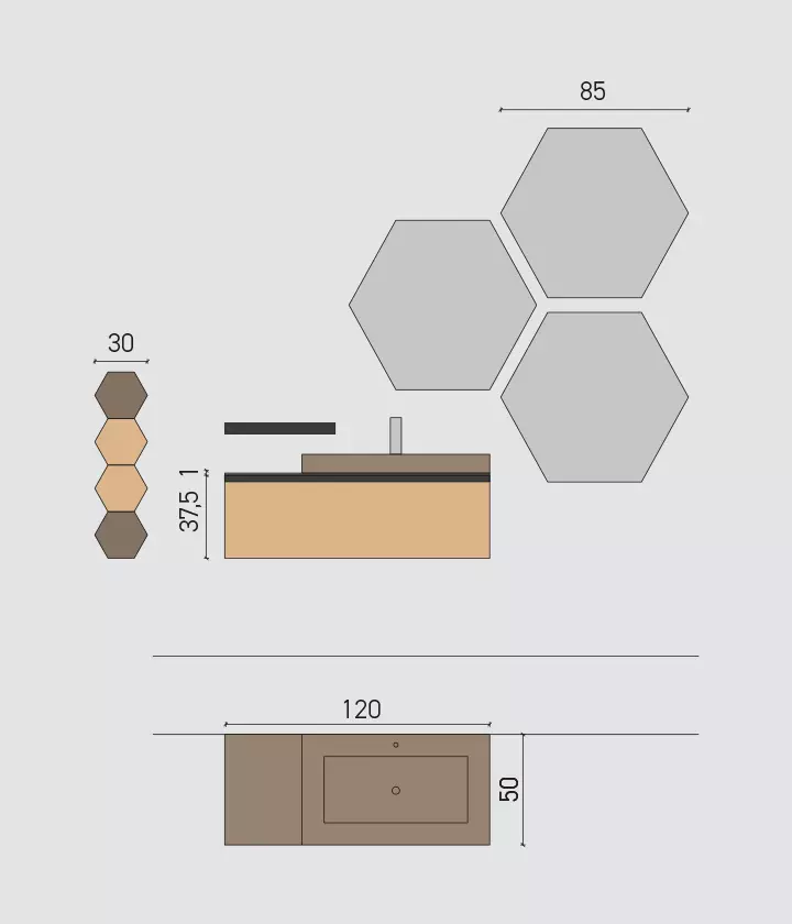 Bimelaminico rovere spaccato con maniglie titanio e top in gres ossido bruno con vasca integrata Gk. Specchi esagonali Ride con profilo nero e illuminazione perimetrale a led.