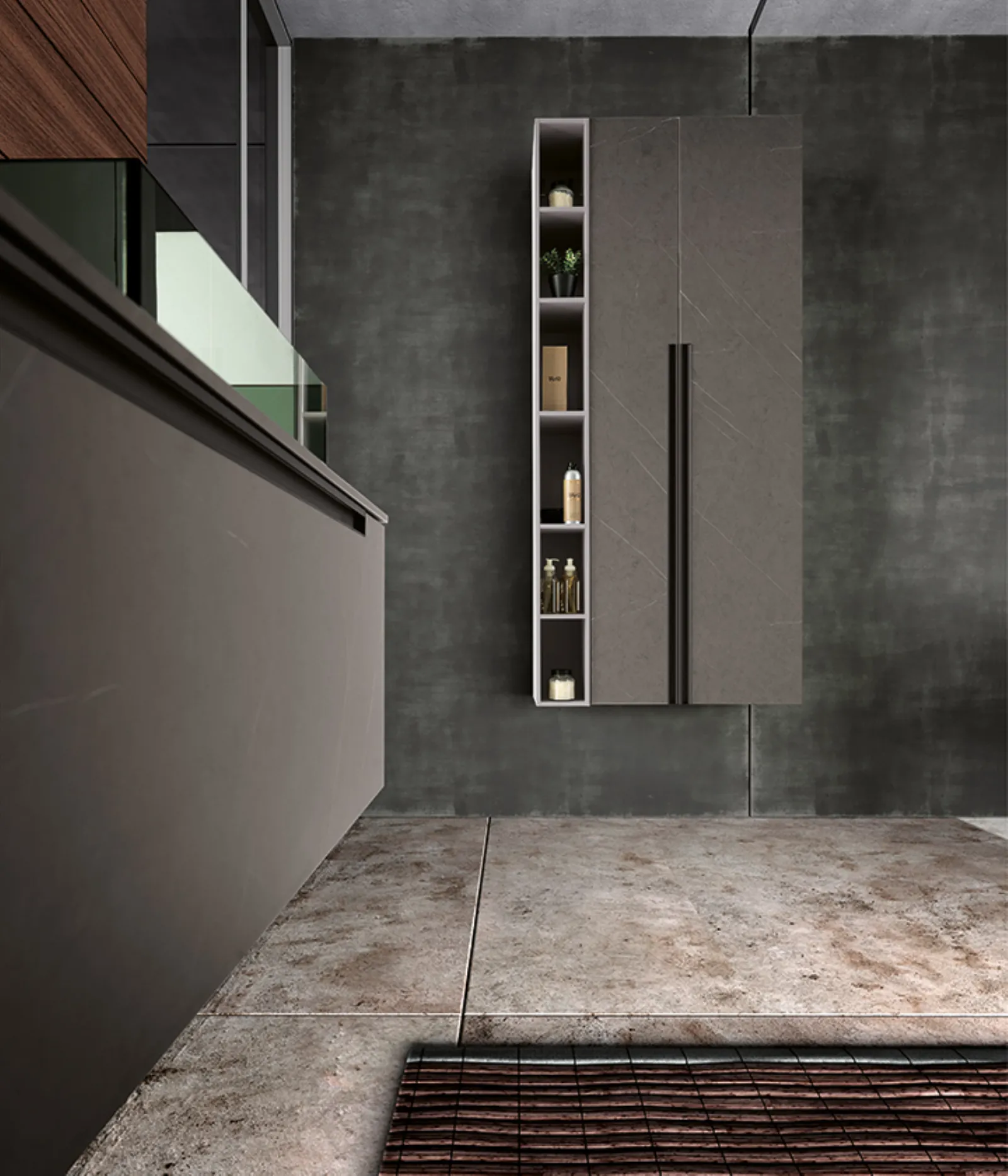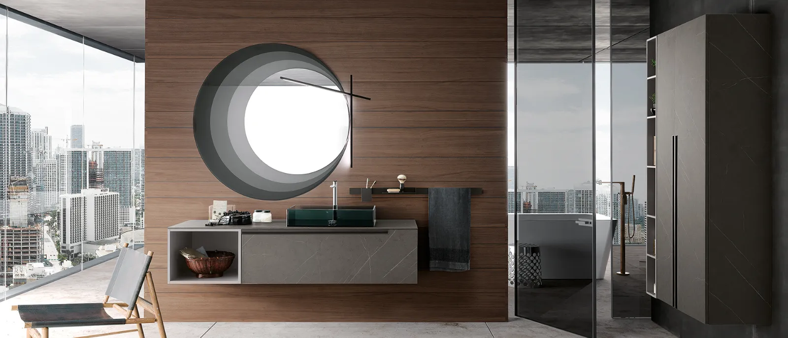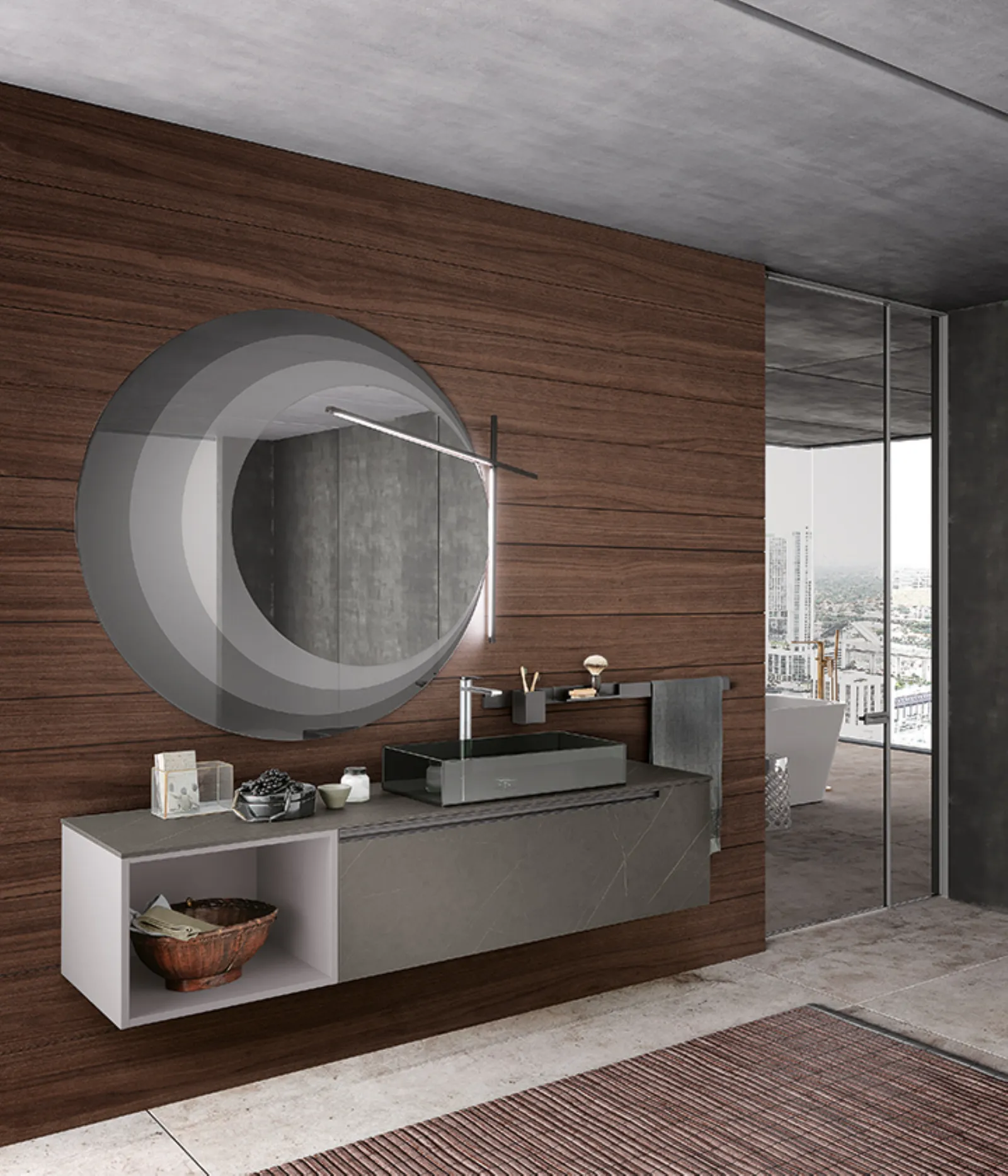 Hpl tobacco 440 con maniglia titanio e base a giorno laccata fard opaco. Top in hpl tobacco 440 con lavabo Lake in vetro fumé. Specchio Saturn con lampada Compasso.