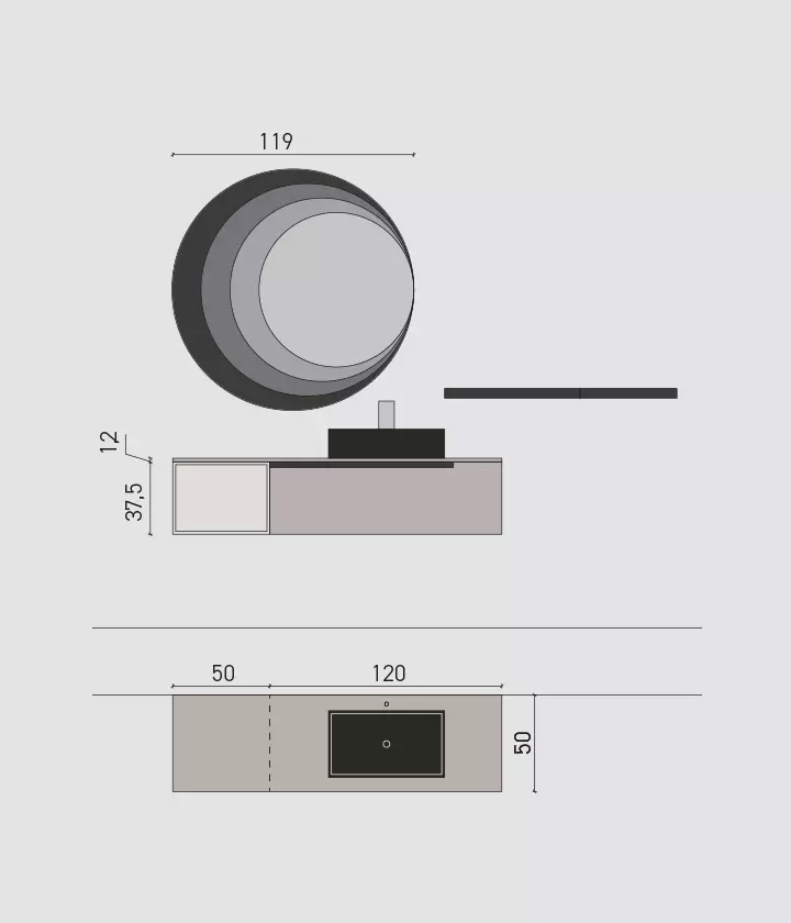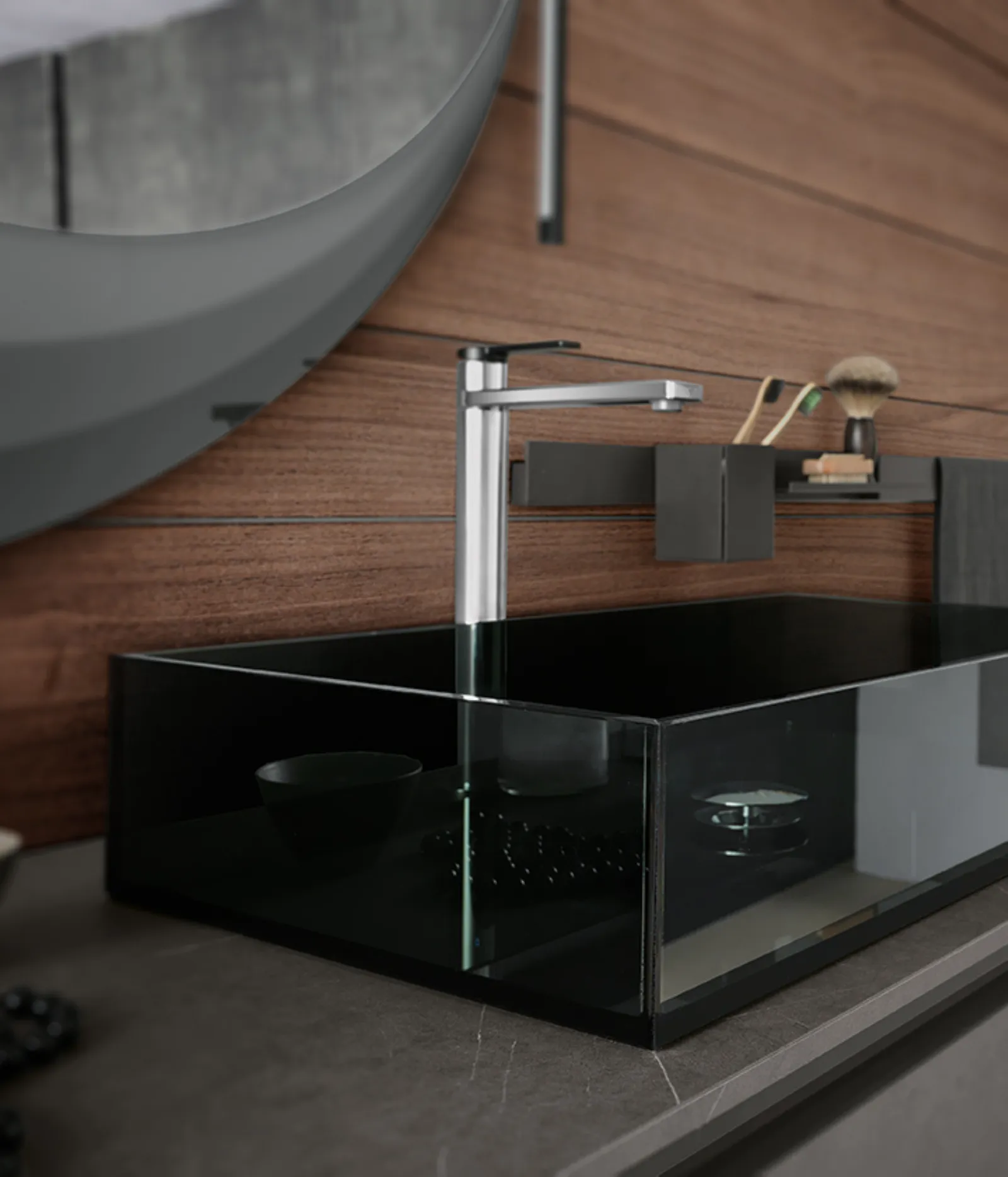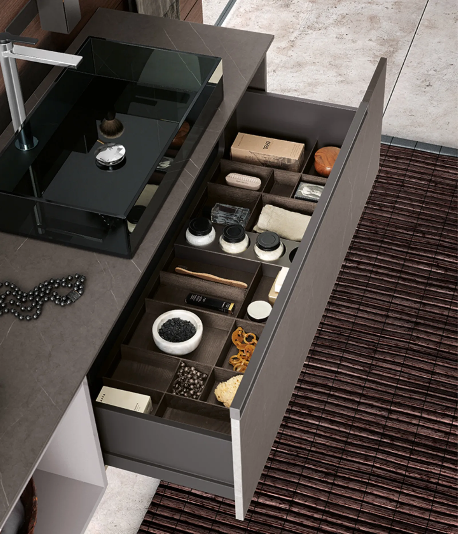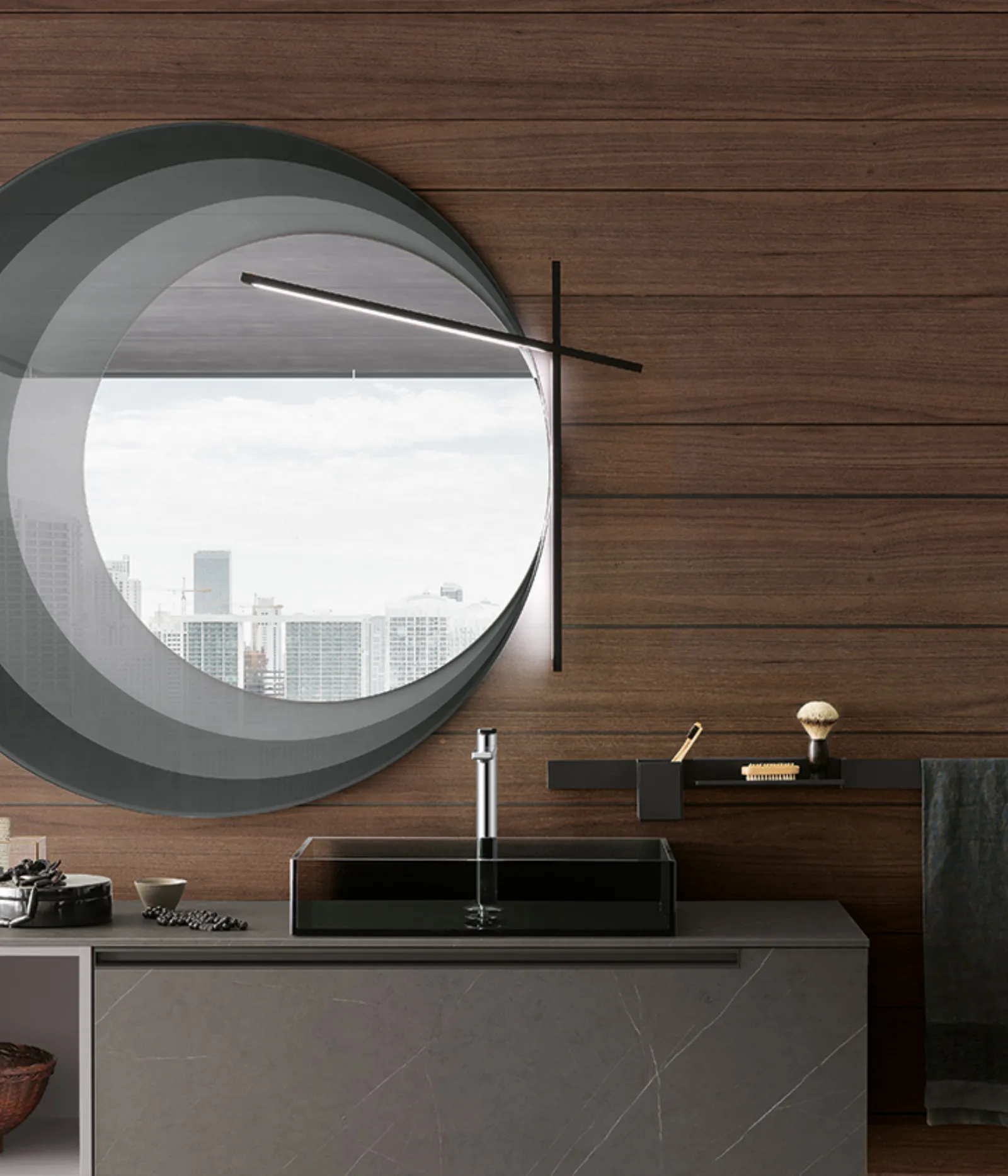 Hpl tobacco 440 con maniglia titanio e base a giorno laccata fard opaco. Top in hpl tobacco 440 con lavabo Lake in vetro fumé. Specchio Saturn con lampada Compasso.