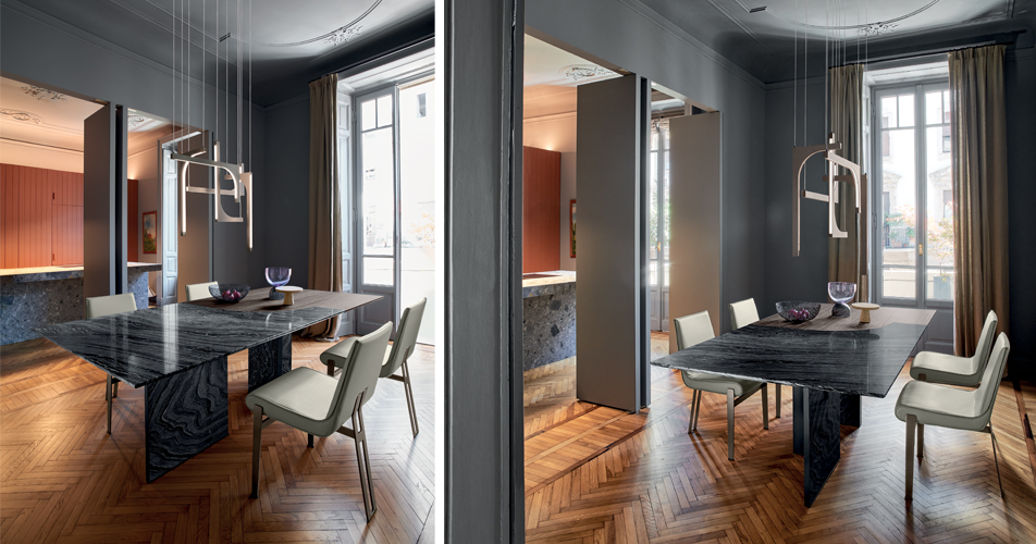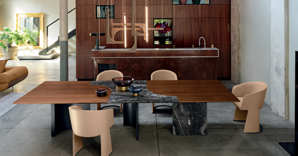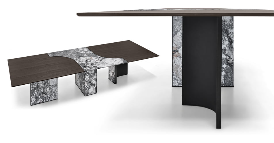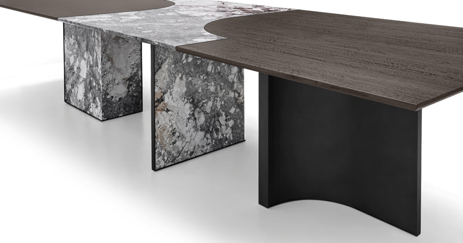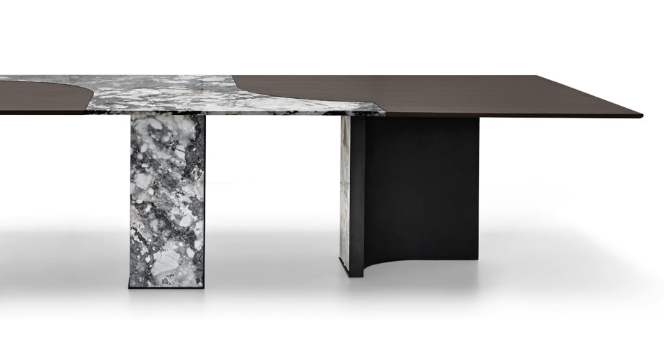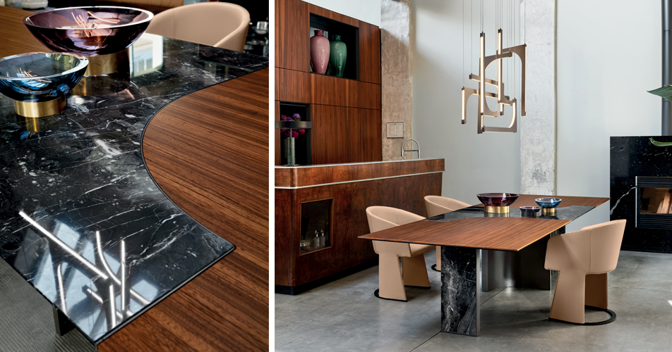Nella realizzazione delle gambe, il contrasto tra metallo e marmo dona una finitura solida ed elegante a un design accattivante.