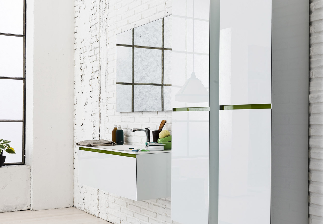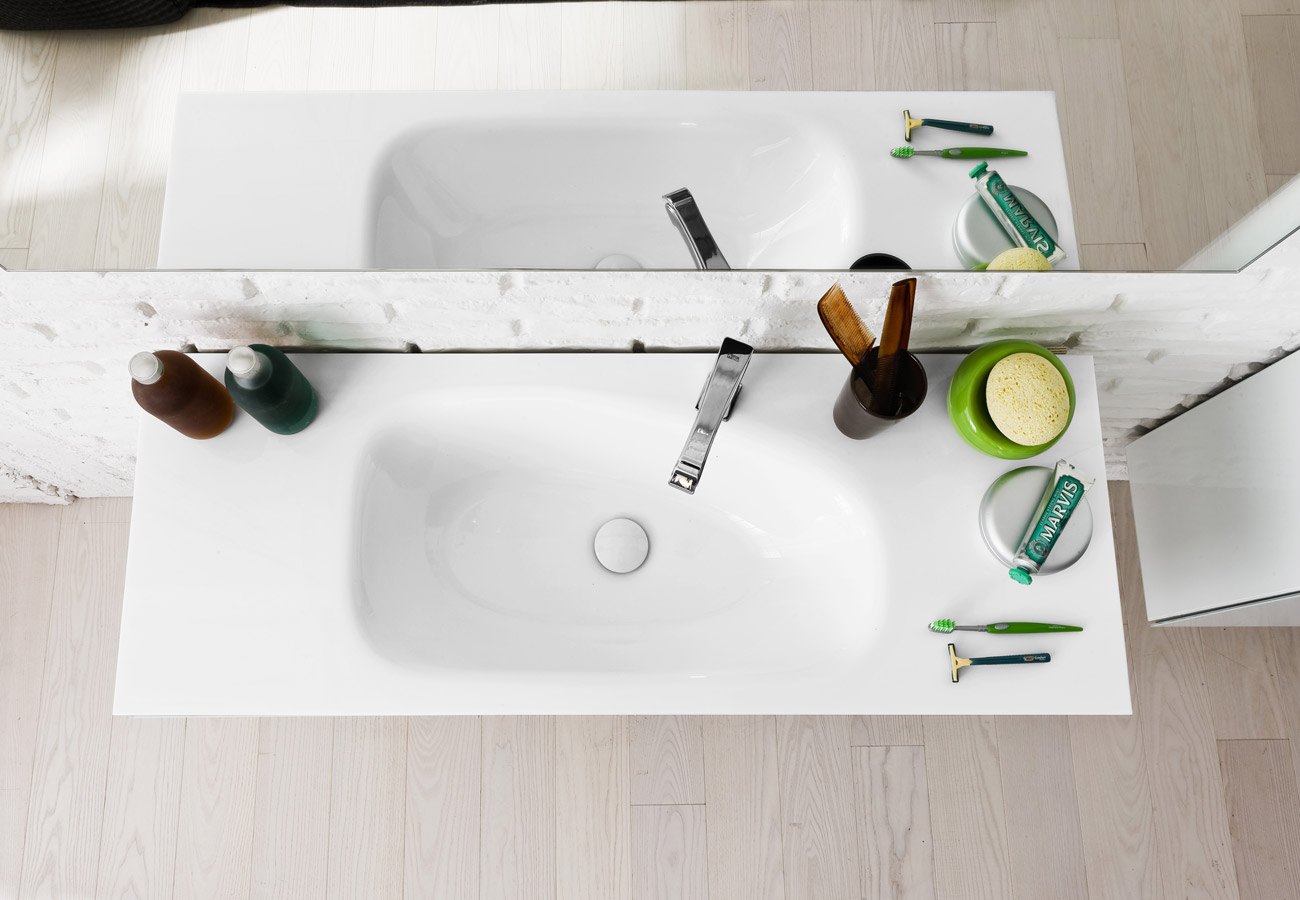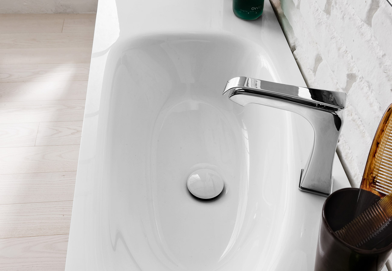 Per questa collezione è stato pensato un lavabo integrato dalla fusione particolare che permette di sfruttare al meglio tutta la profondità del mobile e di poter usufruire di miscelatori sia da appoggio che a muro.