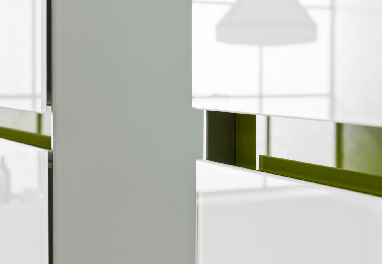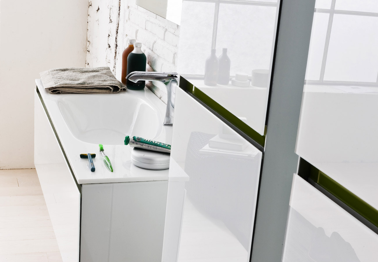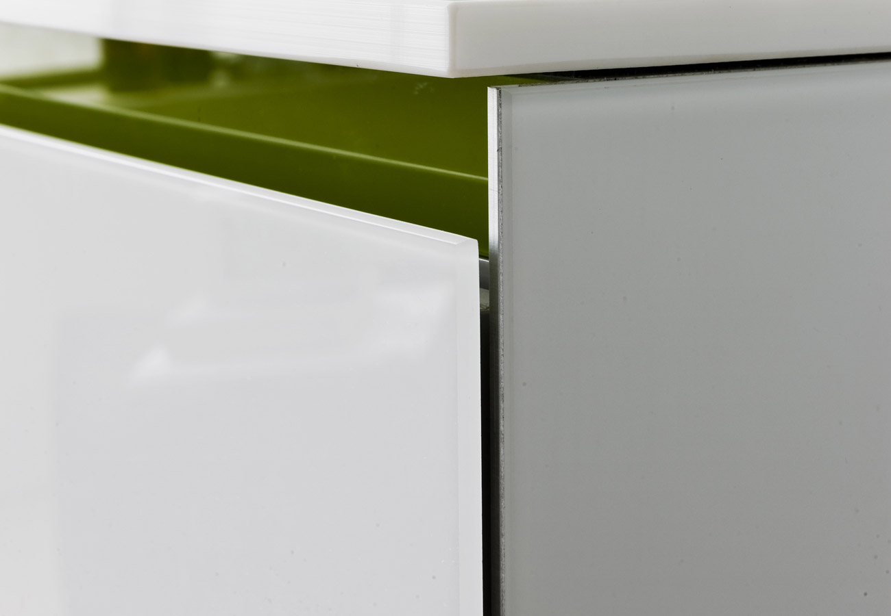 Per questa collezione è stato pensato un lavabo integrato dalla fusione particolare che permette di sfruttare al meglio tutta la profondità del mobile e di poter usufruire di miscelatori sia da appoggio che a muro.