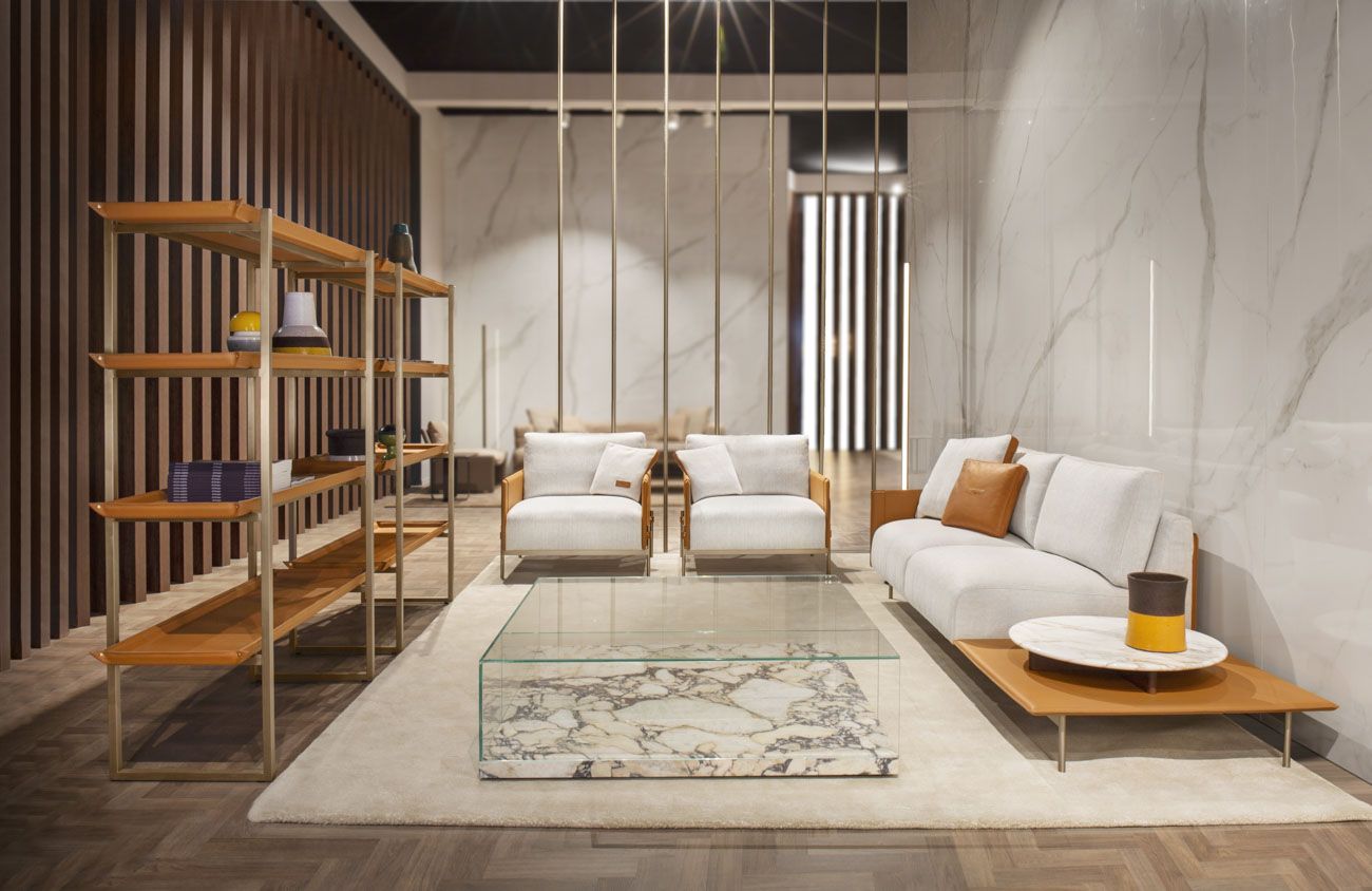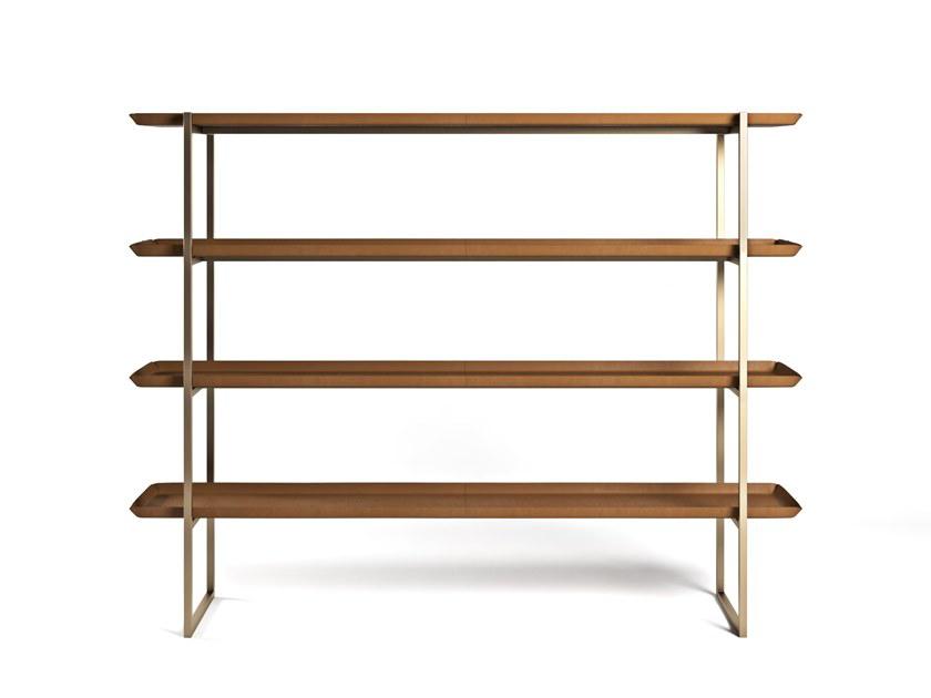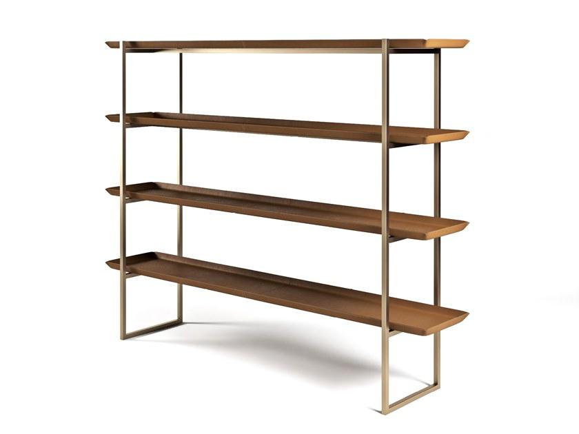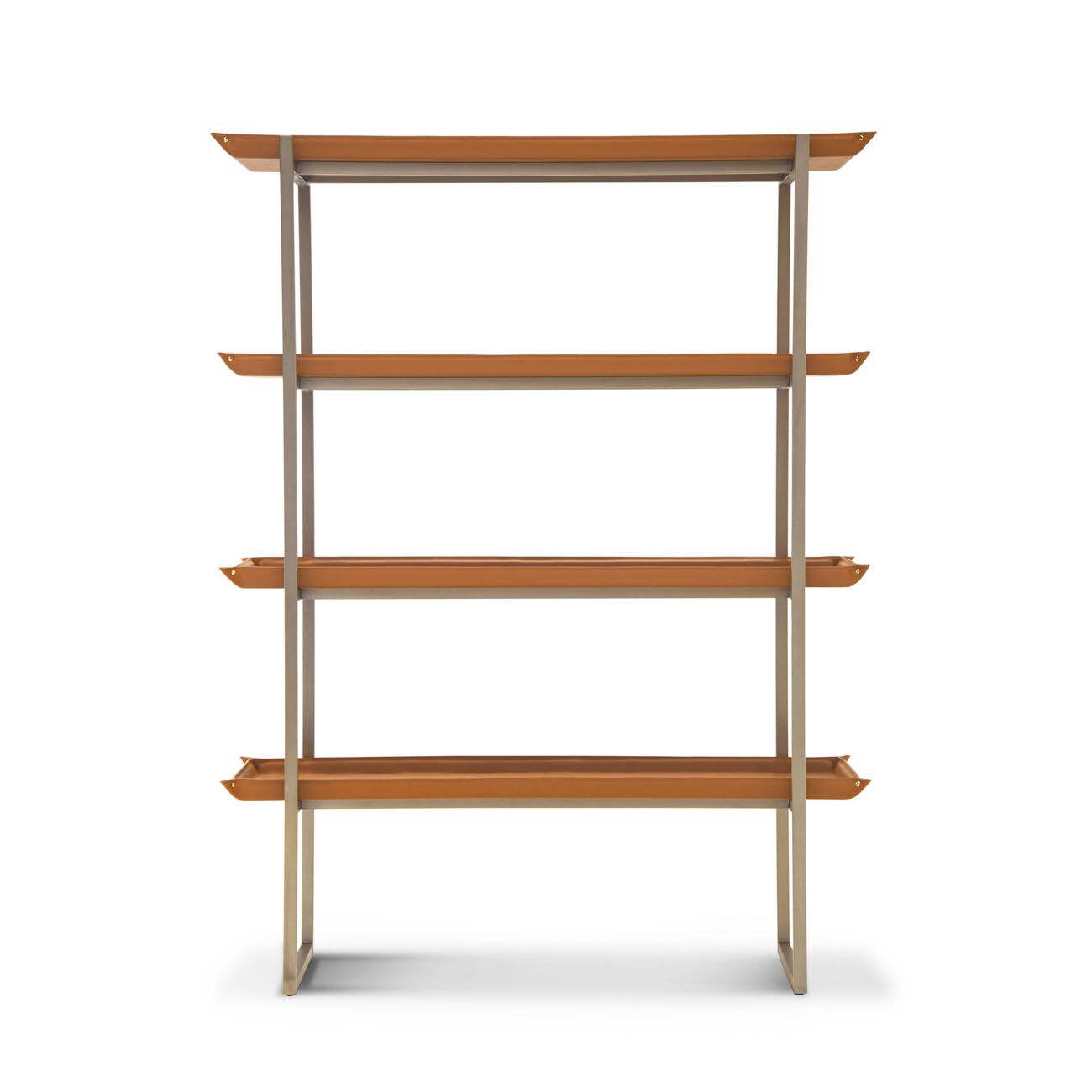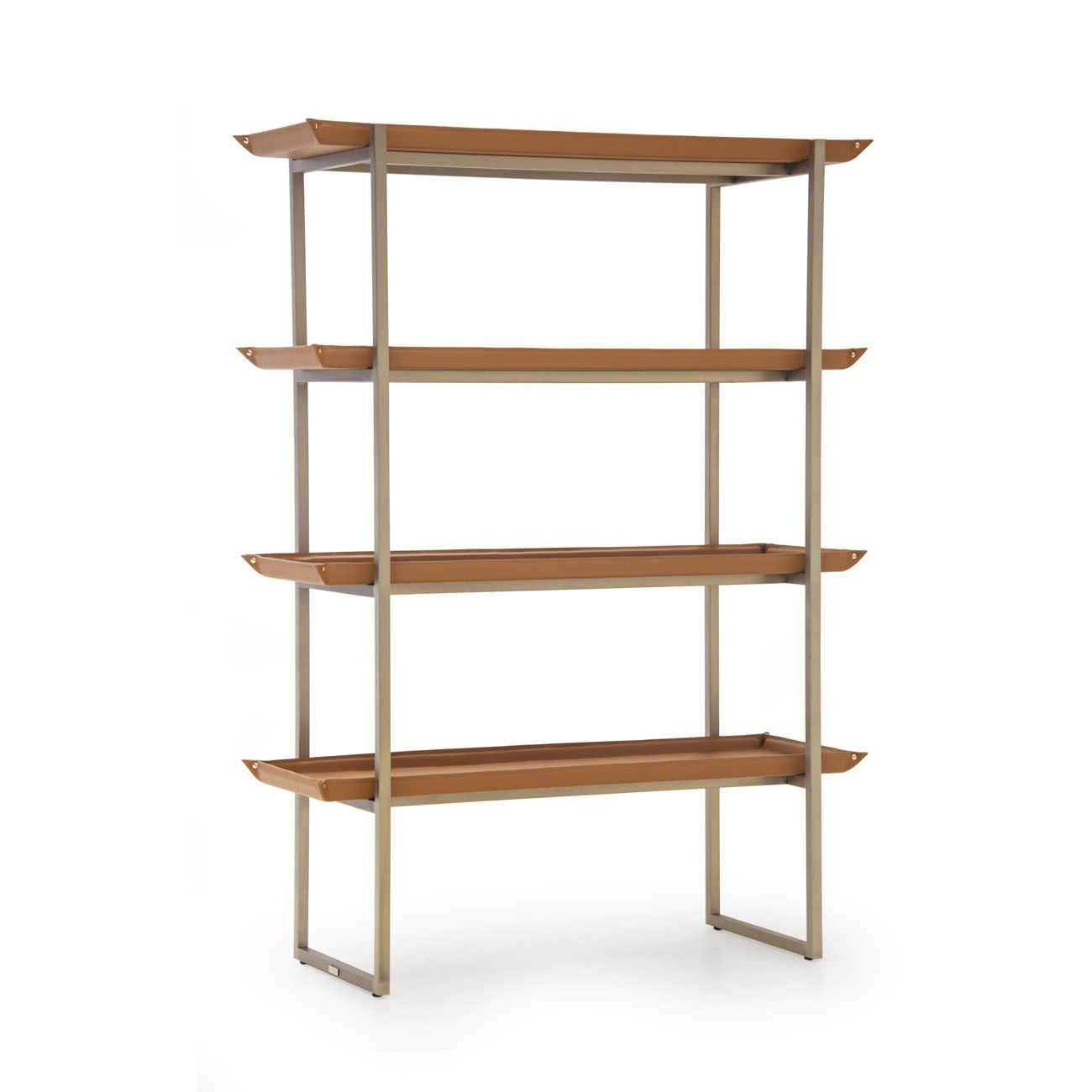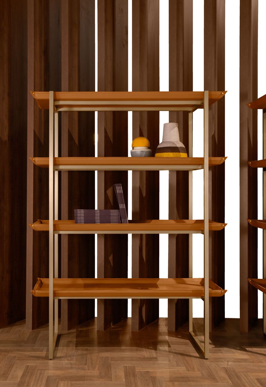 metal structure in light gold satin finish, shelves in leather art. Cuoio col. Kestral Tan.
