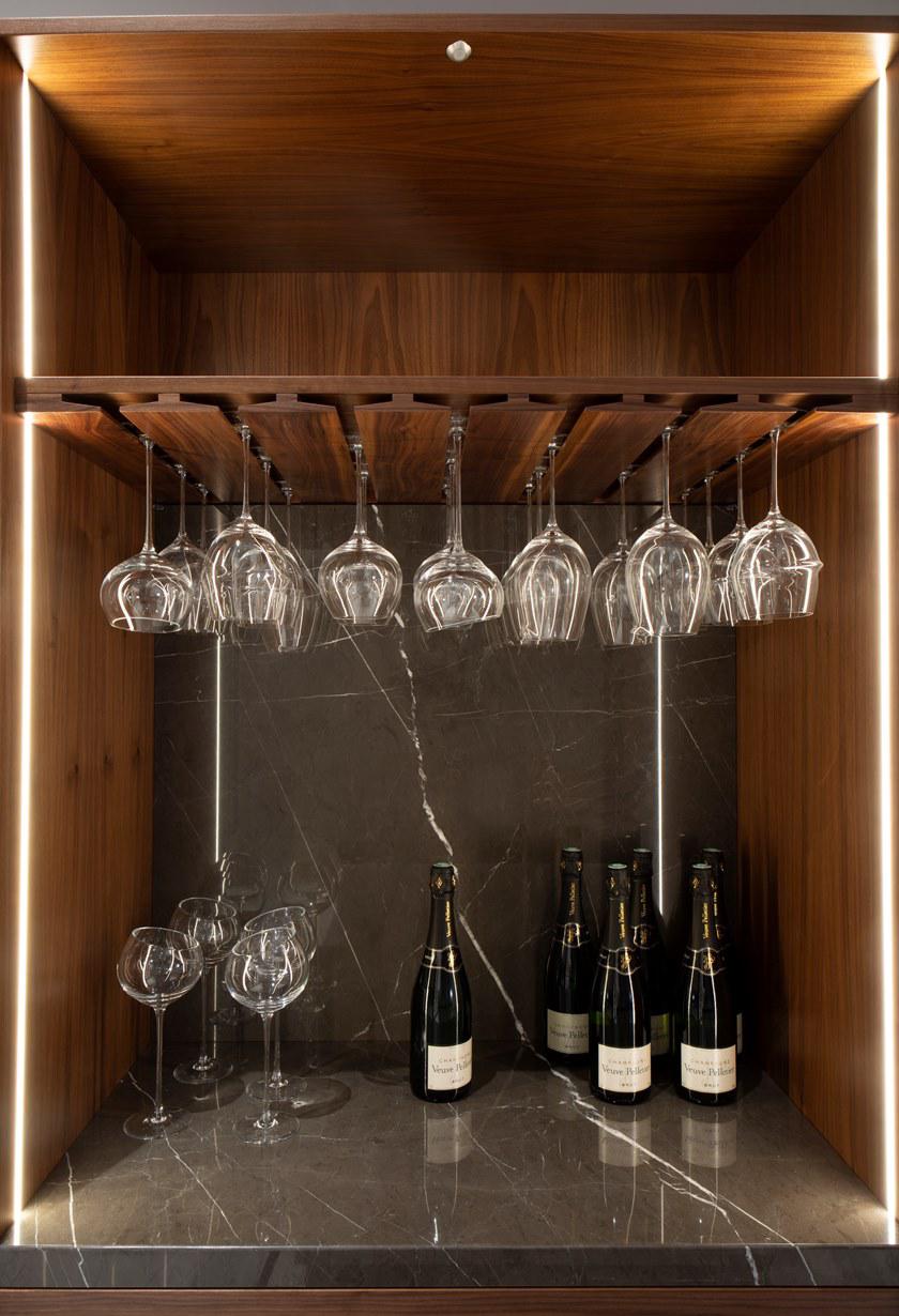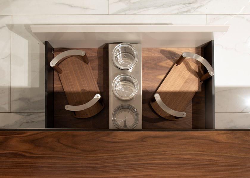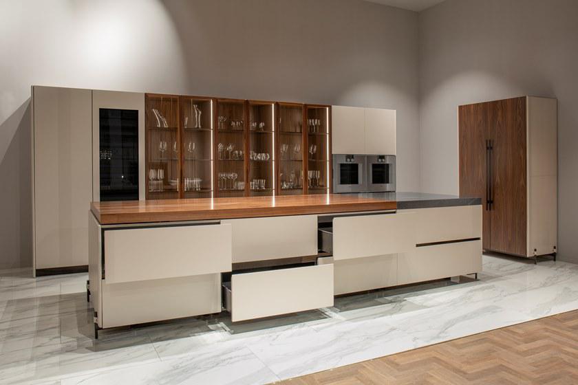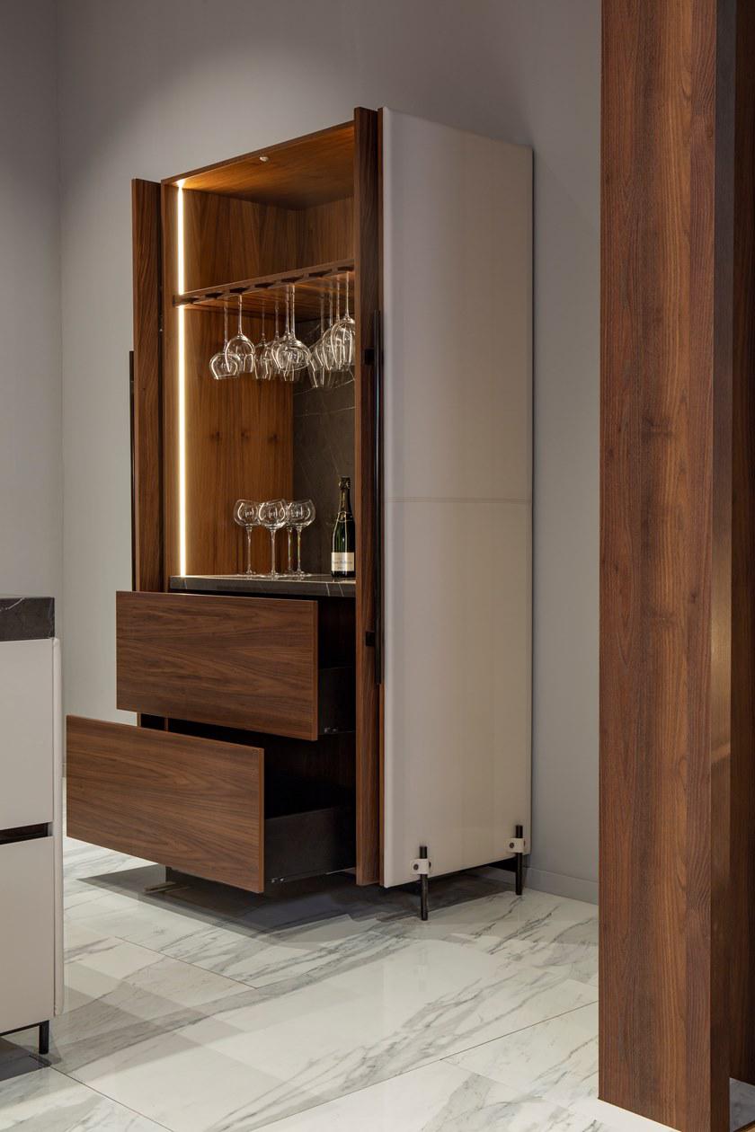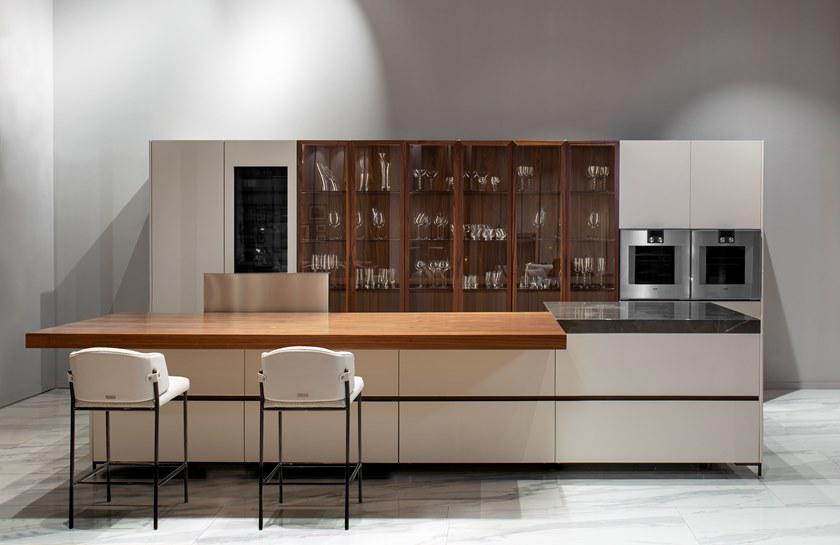 V888 Kitchen Island cm 390x120x94h Materials: Cuoio leather on the sides, canaletto walnut veneer and Grey Pulpis marble for the top. Lacquered drawers with cuoio leather details on tone. Metal legs in titanium color finish but also available in any RAL color. Back cabinet cm 520x65x220h Materials: Cuoio leather, blockboard wood, canaletto walnut veneer, blum mechanisms, Salice hinges, brushed glossy paint, lacquered wood in any RAL color and also matching with cuoio leather tones. Metal fittings Titanium color finish but also available in any RAL color. V242/S Bar stool cm 43x65x89h or 104h Materials: Cuoio leather, fabric art spiga, metal frame Titanium color finish but also available in any colori