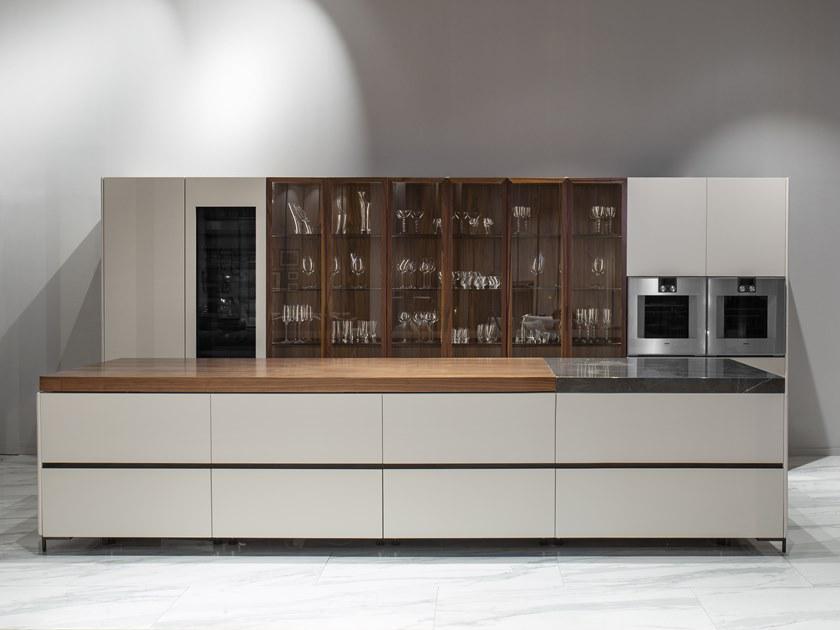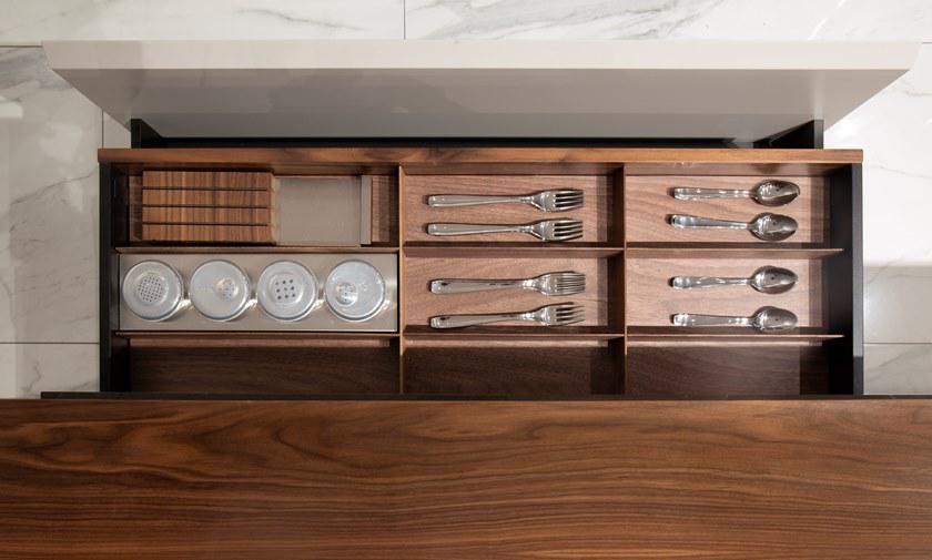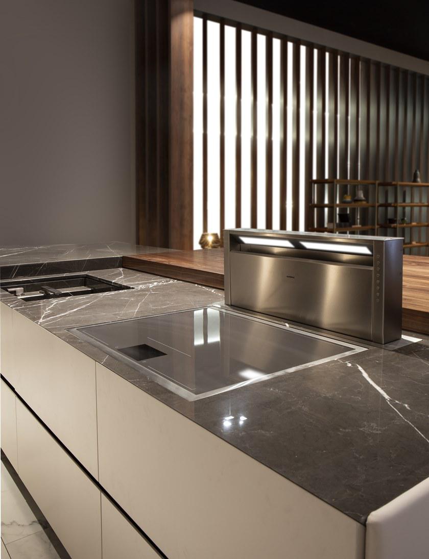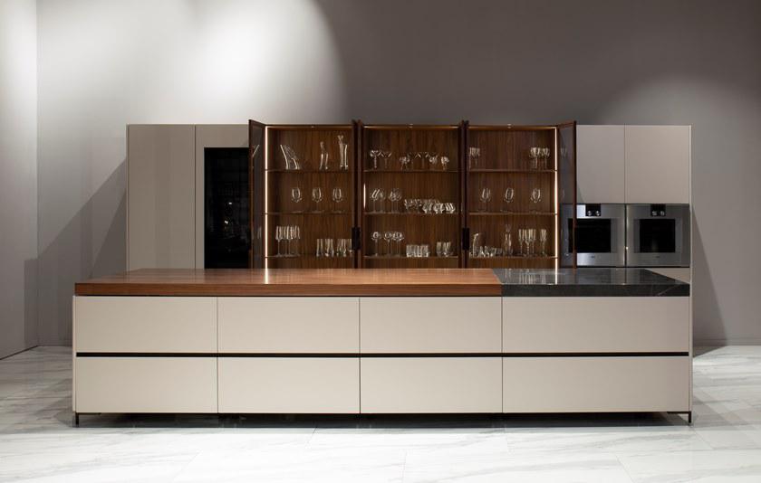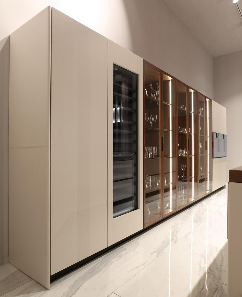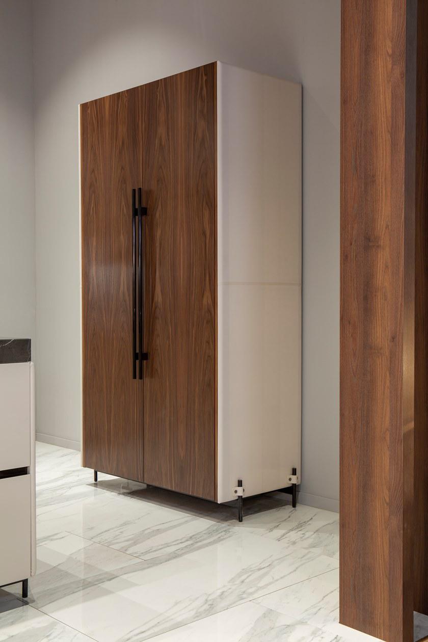 V888 Kitchen Island cm 390x120x94h Materials: Cuoio leather on the sides, canaletto walnut veneer and Grey Pulpis marble for the top. Lacquered drawers with cuoio leather details on tone. Metal legs in titanium color finish but also available in any RAL color. Back cabinet cm 520x65x220h Materials: Cuoio leather, blockboard wood, canaletto walnut veneer, blum mechanisms, Salice hinges, brushed glossy paint, lacquered wood in any RAL color and also matching with cuoio leather tones. Metal fittings Titanium color finish but also available in any RAL color. V242/S Bar stool cm 43x65x89h or 104h Materials: Cuoio leather, fabric art spiga, metal frame Titanium color finish but also available in any colori