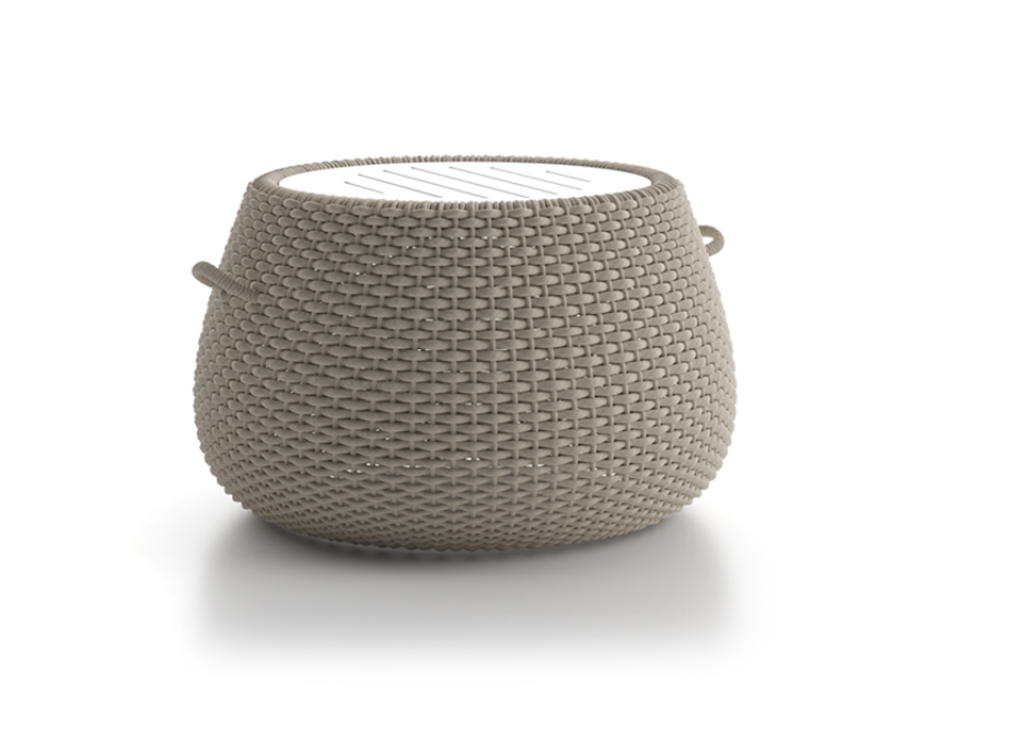 Tavolini con una struttura in alluminio abbinata a corde intrecciate a mano in fibra acrilica di Teflon, a sezione tonda, resistenti all’acqua e di facile pulizia. Il materiale presenta un appeal morbido e raffinato simile ad intrecci tessili. Si caratterizza per la sua resistenza ai raggi UV e per la velocità di asciugatura.