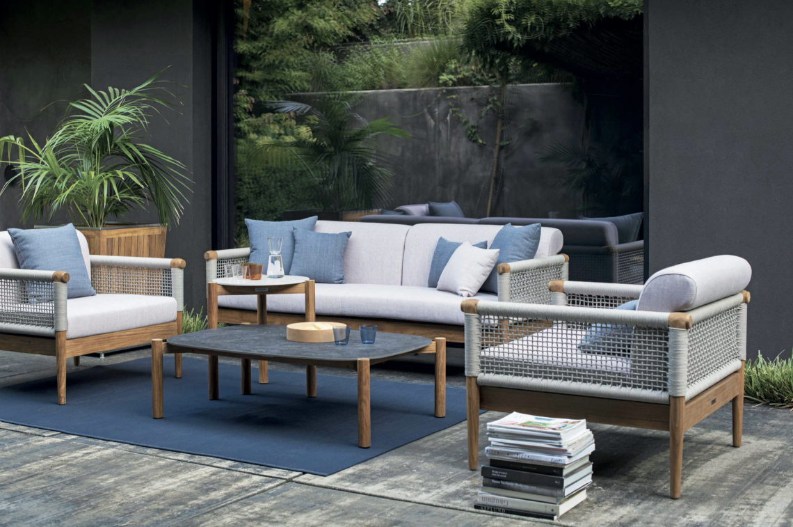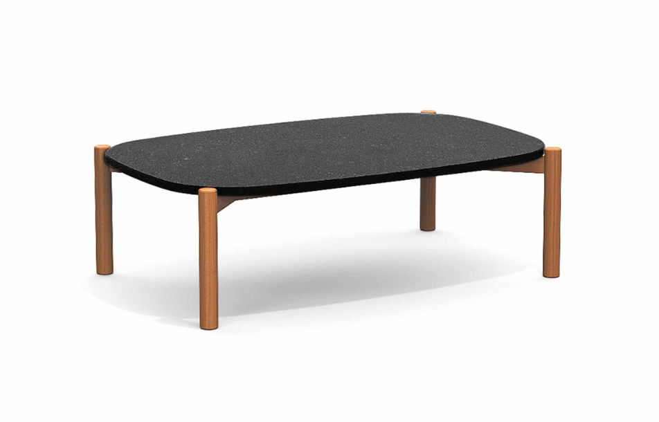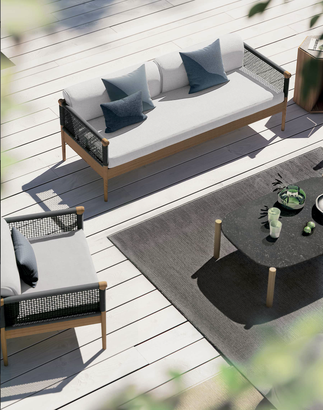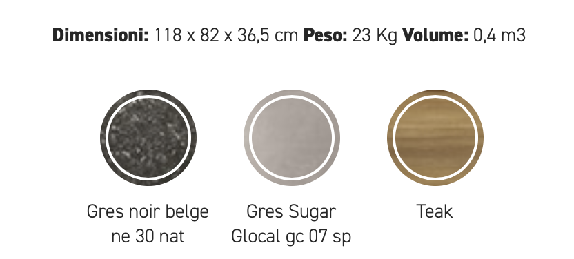 Struttura in TEAK massiccio Asiatico; piano in Gres disponibile in due varianti colore. Le due finiture hanno un aspetto naturale e morbido al tatto, che donano raffinatezza e carattere alla collezione.
