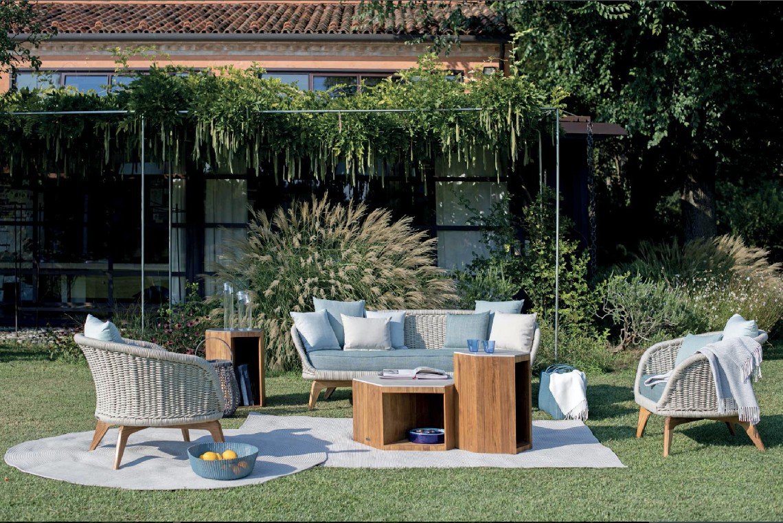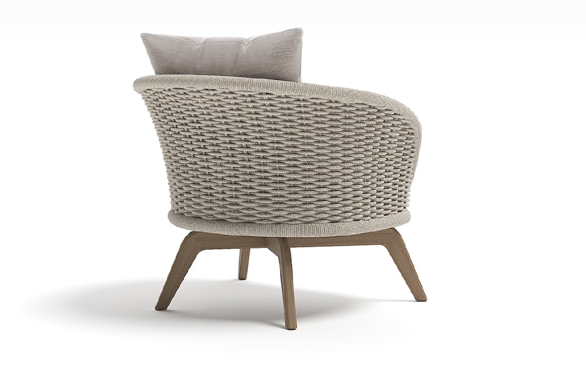Poltrona con base in teak abbinata a corde intrecciate a mano in fibra acrilica di Teflon, a sezione tonda, resistenti all’acqua e di facile pulizia. Il materiale presenta un appeal morbido e raffinato simile ad intrecci tessili. Si caratterizza per la sua resistenza ai raggi UV e per la velocità di asciugatura.